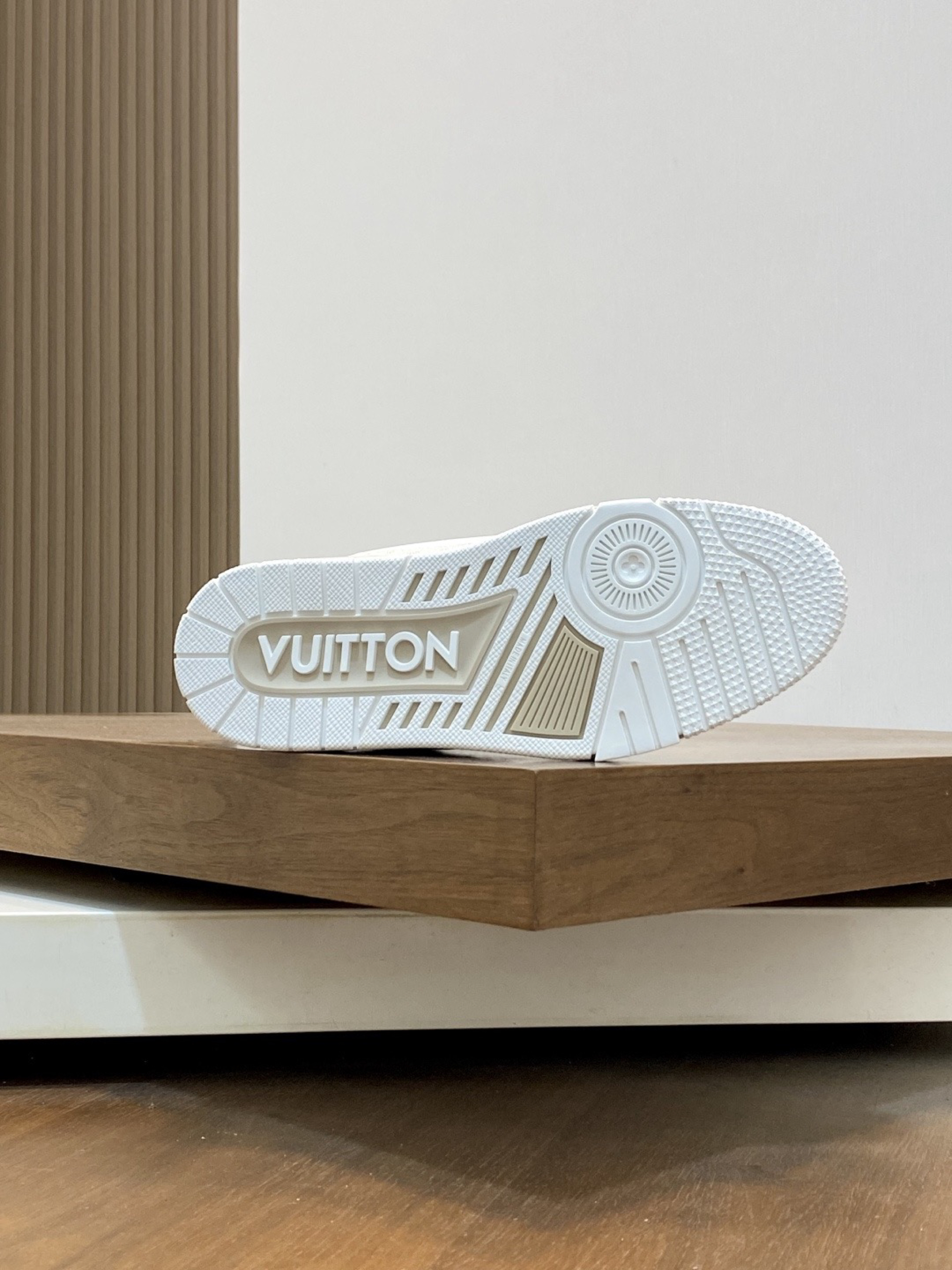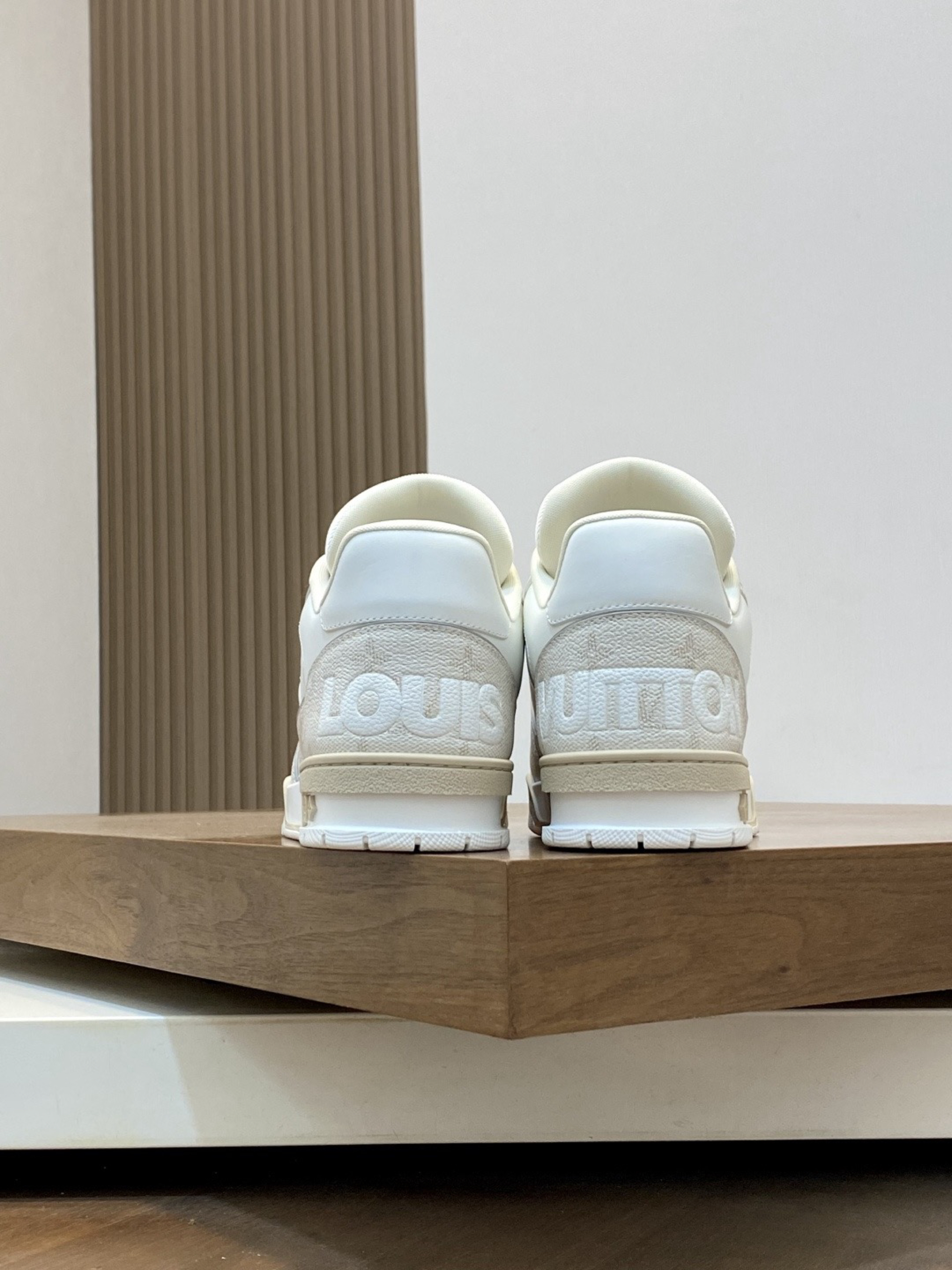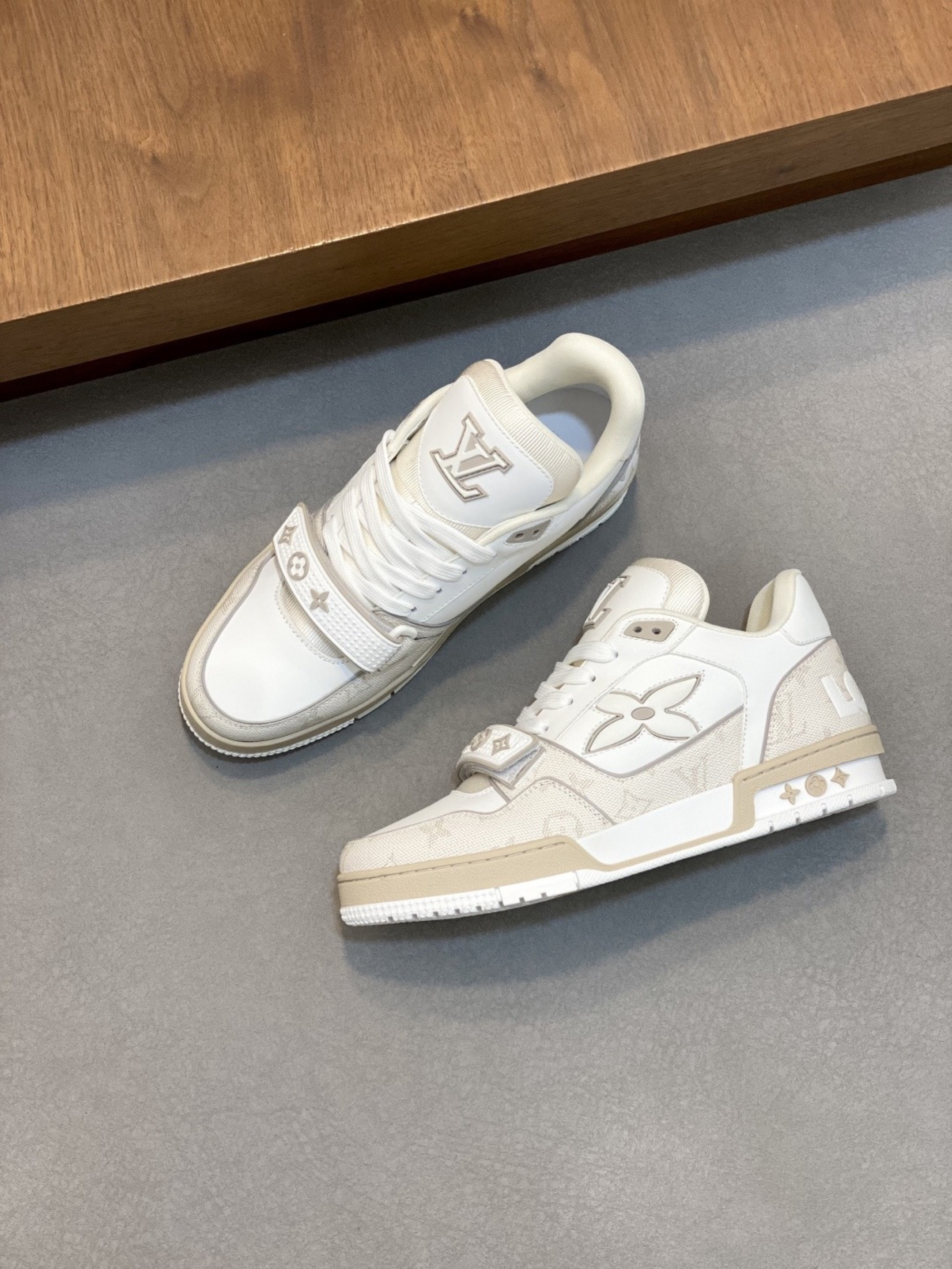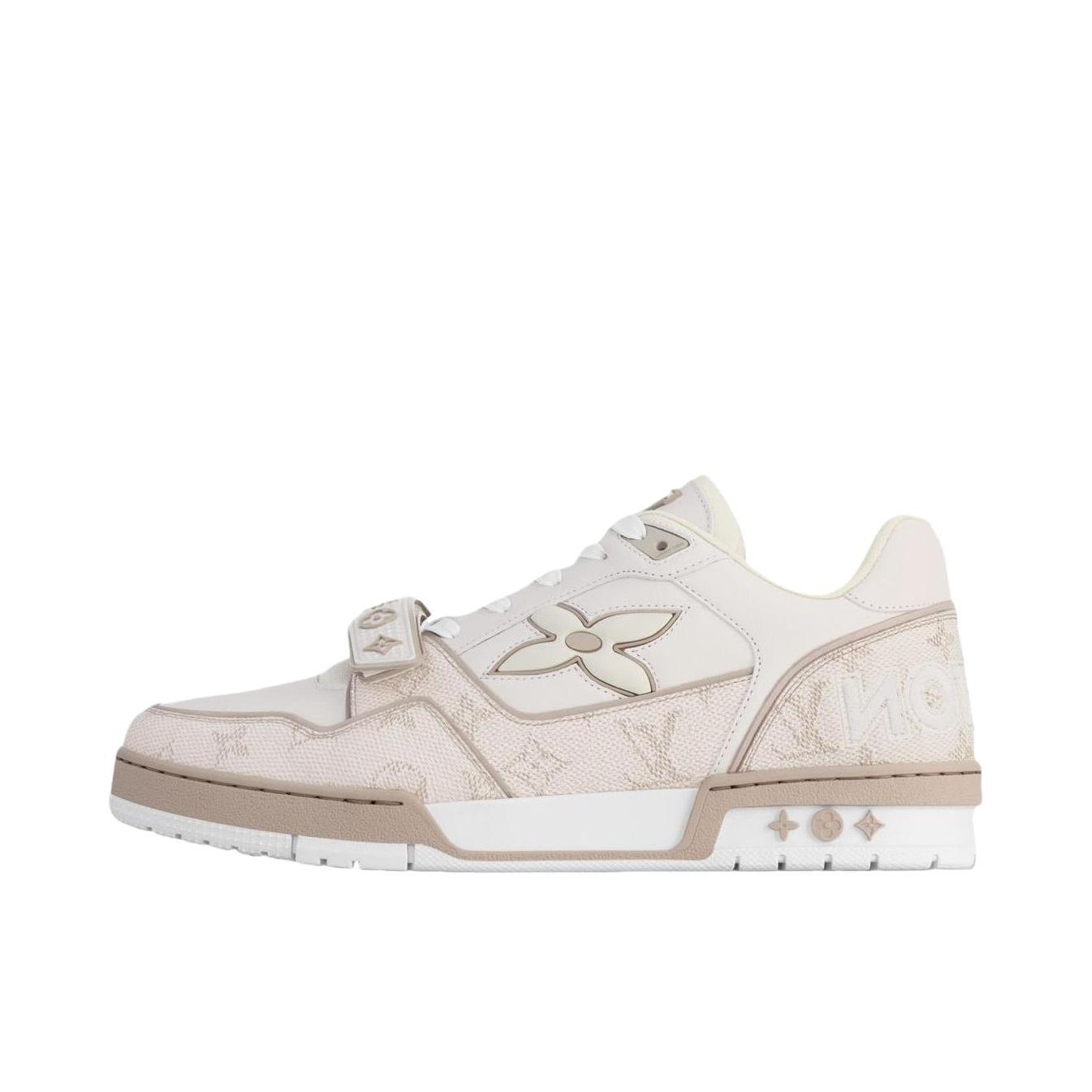 路易威登的休闲鞋,整体以米白、浅棕为主色调,简约又高级。冬季搭配的话,下身可选择浅灰色加绒直筒裤,上身内搭米白色高领毛衣,外搭一件浅卡其色的中长款羽绒服,既保暖又能和鞋子的色调相呼应,打造出温柔且有质感的冬日穿搭风格。