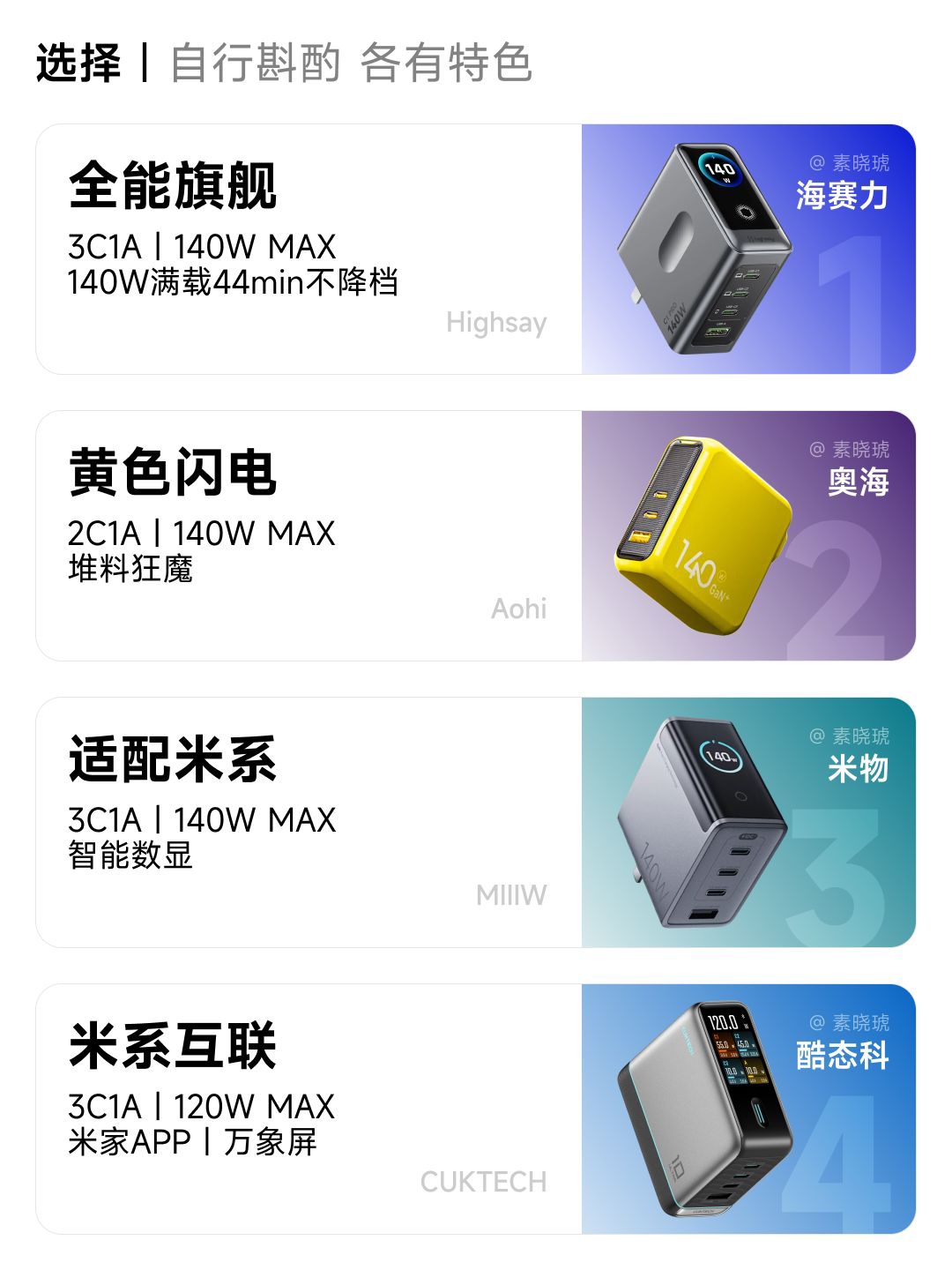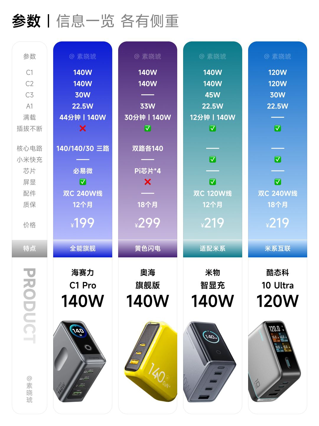这两年数显屏真的火起来了, 私以为充电器带一块显示屏,真的好看又好用。 最近,新锐品牌海赛力,也推出了他们家的C1 Pro. 简洁克制的外型,也有属于自己的设计语言; 3C1A,单口140W的大功率, 重要的是:满载44min不降档! 199的定价也不错。 与市面现有的几家品牌,做了一下比对, 参数上也都有来有回。 这家秉承“敢想、即达”理念的的新锐品牌, 接下来还会有怎样精彩的表现,...