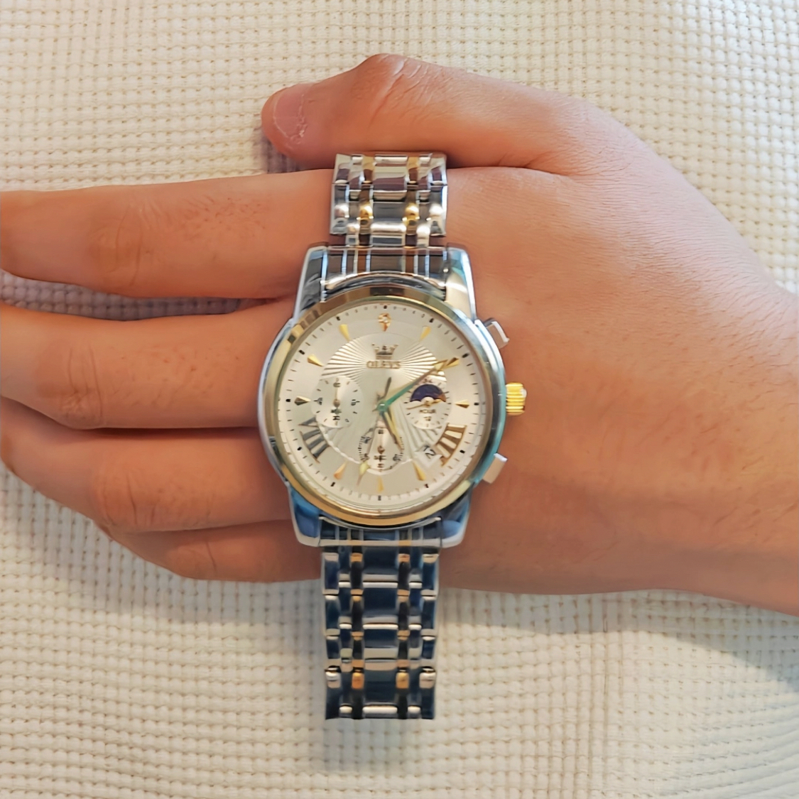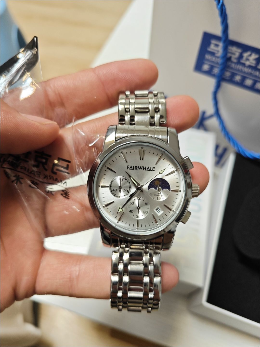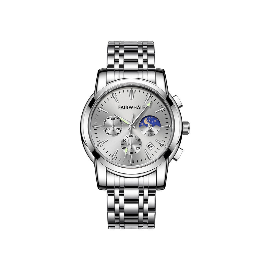 刚拆快递就被这块表的质感惊到——精钢表带光泽感特别高级,拿在手里分量刚好,不会轻飘飘没质感,也不会重到压手腕。 表盘设计是真的戳审美!银色拉丝盘面+日月星辰显示,商务场合戴显得干练,周末搭休闲装也不违和。三眼计时和日历功能日常够用,尤其是那个月相显示,每次抬手腕都觉得细节感拉满~ 走时很稳,戴了一周没发现误差,防水也靠谱(洗手溅水完全没问题)。最惊喜的是包装!礼盒+手提袋全套配齐,不管自己...