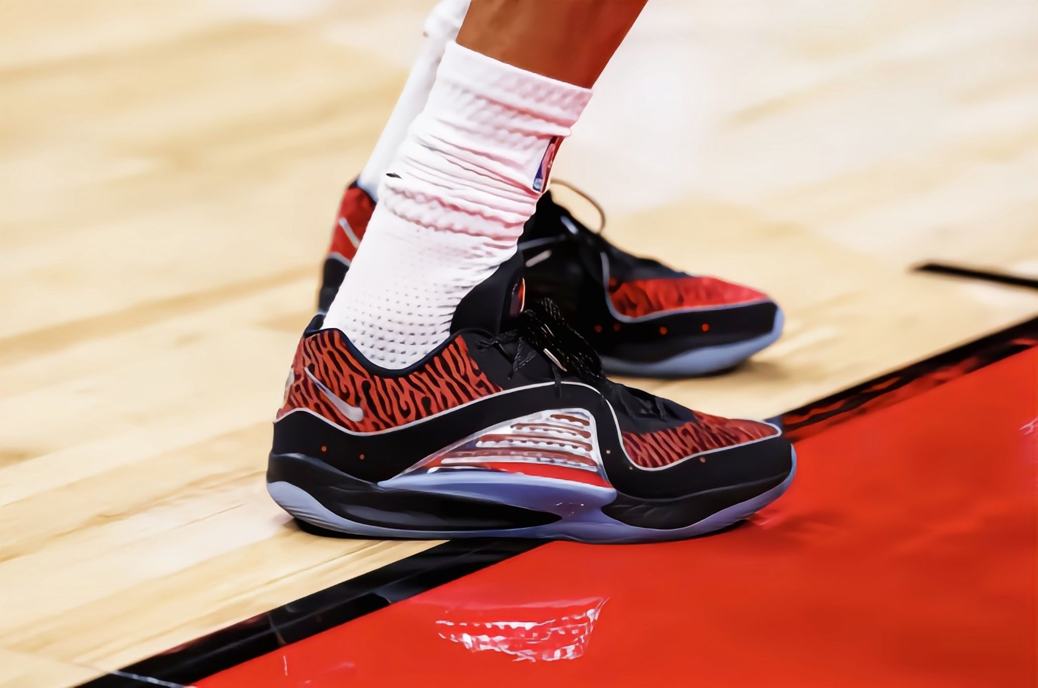 今天在比赛里看到英格拉姆穿的这双黑红KD16,顺手翻了翻最近的实战体验,说点真实的感受—— 材质这块,它不是那种花里胡哨的配置:鞋面是多层面料的网眼,脚趾和后跟那块带点类似虎纹的编织纹路,摸起来是偏透气的质感,旁边还有合成材料的护边,不是软塌塌的那种,有点支撑力但不闷脚。鞋帮是低帮,脚踝那块露得比较多,内衬的记忆海绵填充是真的厚,刚穿上裹得挺实,但前掌鞋头有点尖,宽脚兄弟穿厚袜子可能会挤大脚趾...
