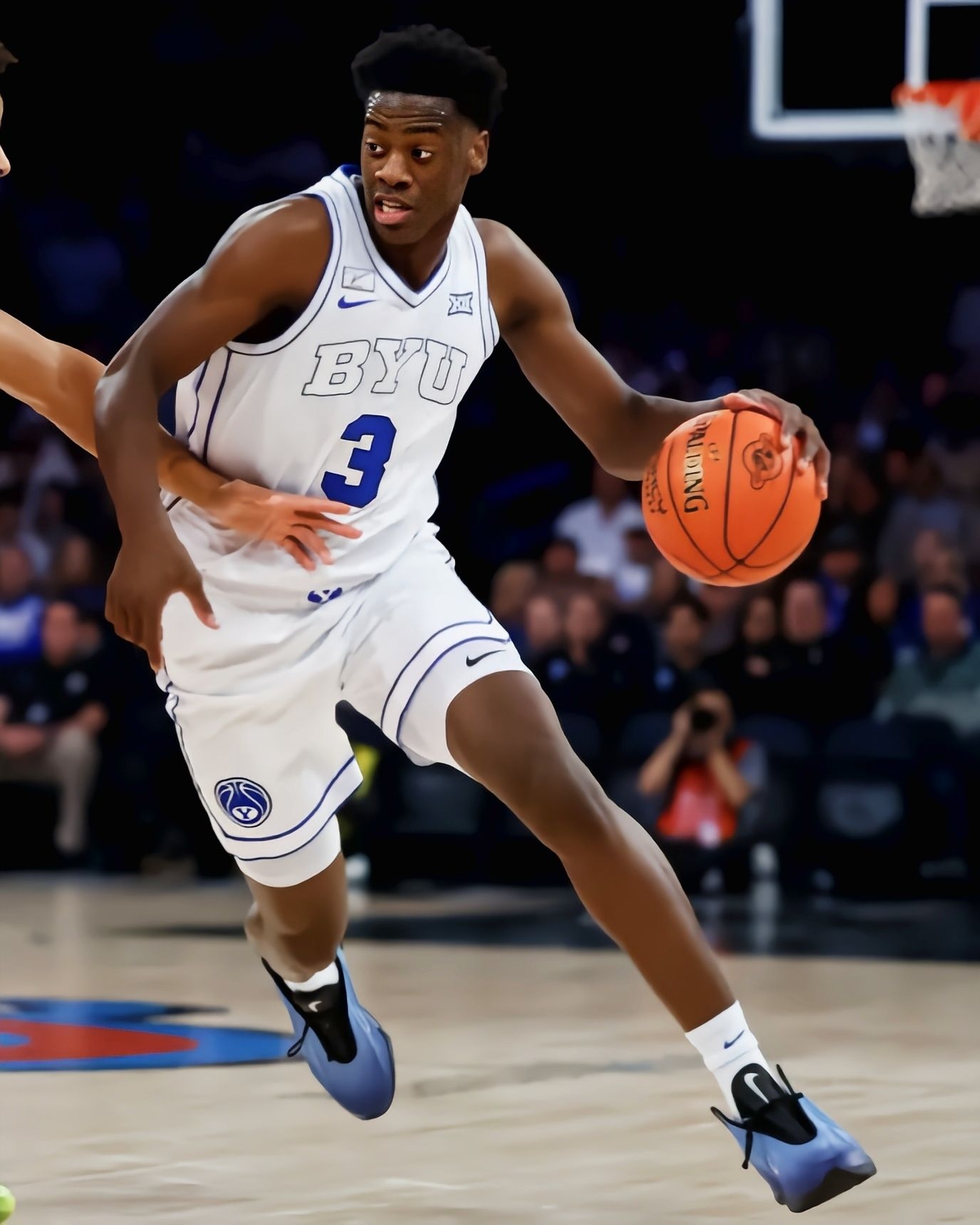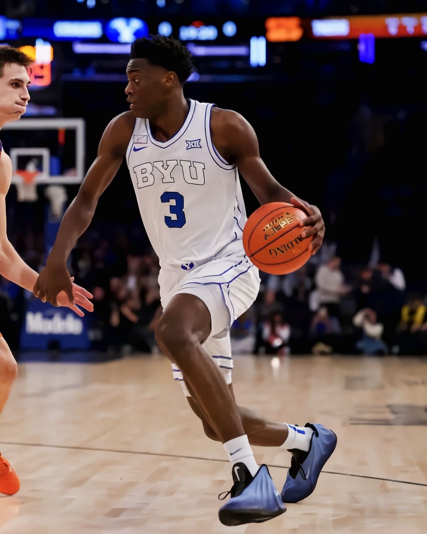 NCAA常规赛杨百翰67-64险胜克莱姆森的22分大逆转里,AJ-迪班察34分钟狂砍28分9篮板6助攻,下半场独揽22分的关键表现里,他脚上这双渐变蓝Nike G.T Future也全程在线。 从赛场看: - 材质/外观:鞋面是褶皱质感的合成材质,搭配渐变蓝配色+透气孔设计,既保证了轻量化(单只约340g),又和杨百翰队服色调高度契合,镜头里跑动时辨识度拉满。 - 实战表现:迪班察多次...