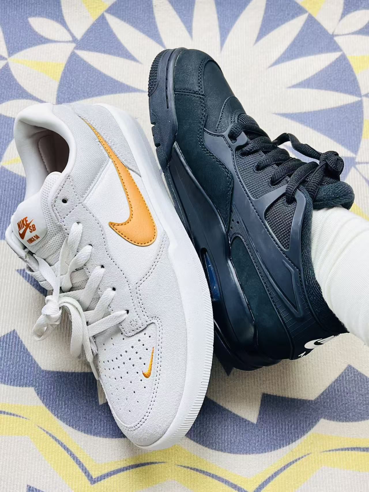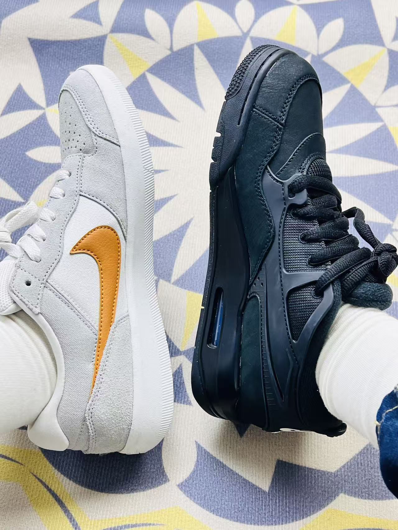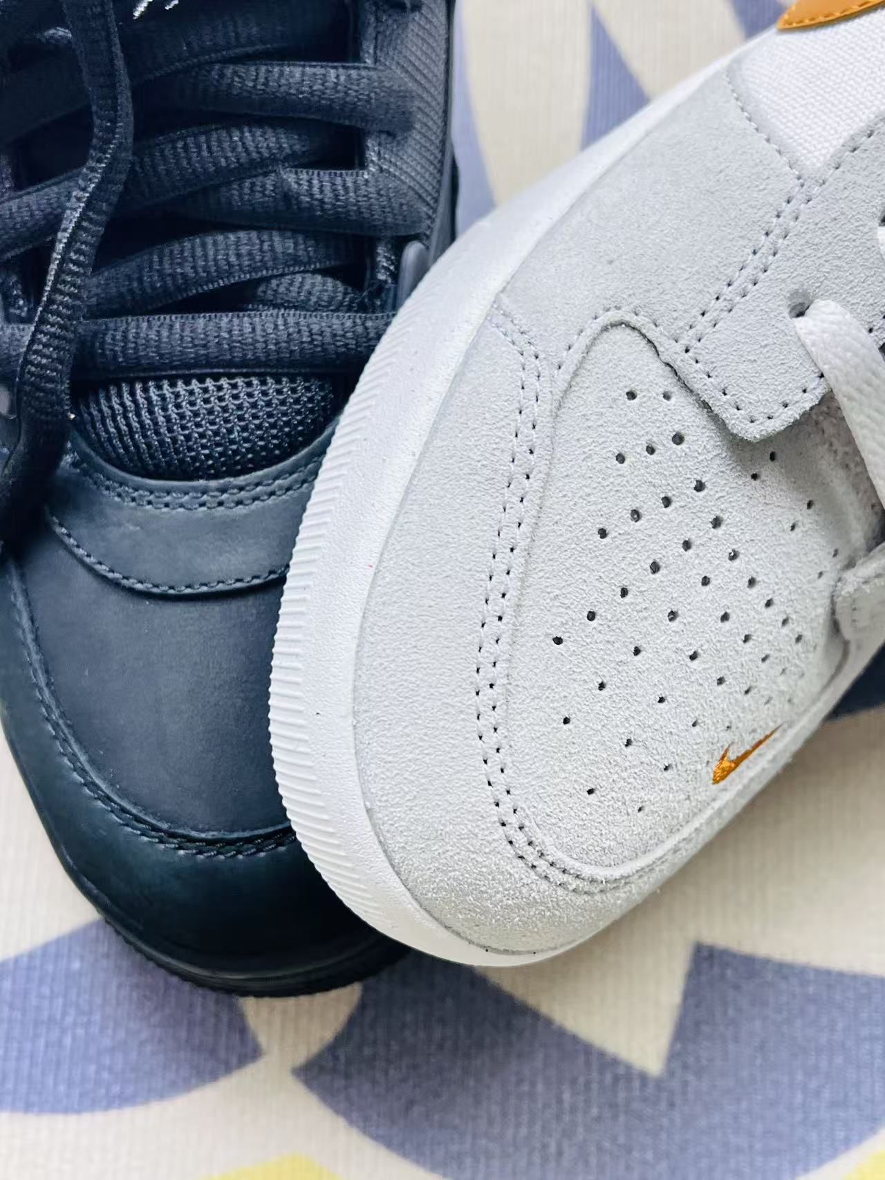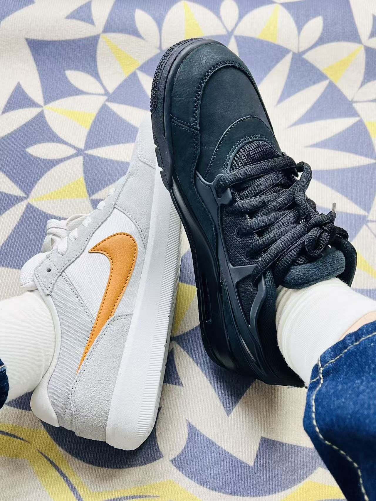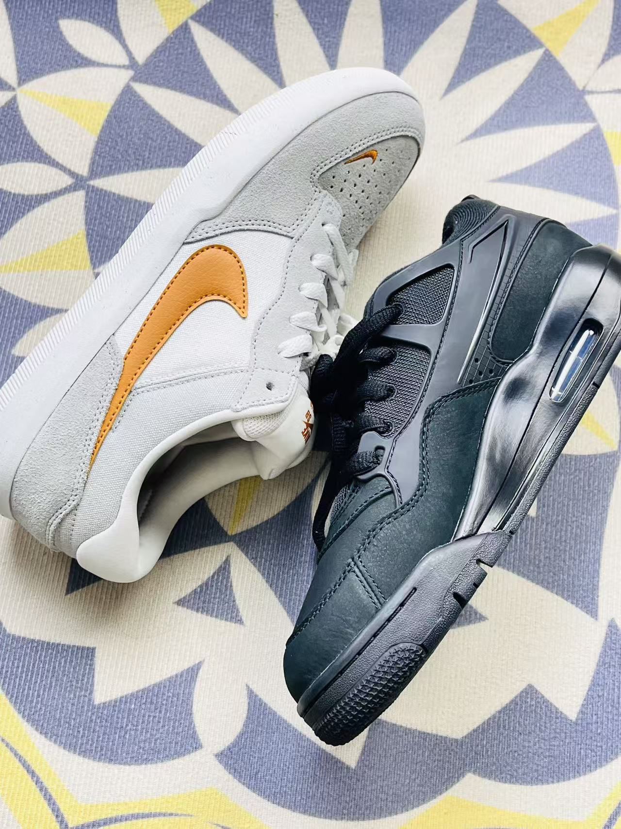 这两双鞋陪我走了快半个月,说点实在的感受: 左边这双米白配橘勾的,上脚第一感觉是轻,帆布和麂皮的拼接摸起来挺舒服,搭配牛仔裤或者运动裤都不挑,通勤挤地铁一整天,脚底也没闷出太多汗。不过麂皮部分已经蹭上一点灰,拿湿纸巾擦不太掉,得专门找清洁的东西,有点麻烦。 右边这双全黑的,鞋面是那种有点像哑光皮的材质,下雨溅到点水随便一擦就没了,打理起来省心不少。鞋底的弹性刚好,走那种有点坑的路,脚感比左...