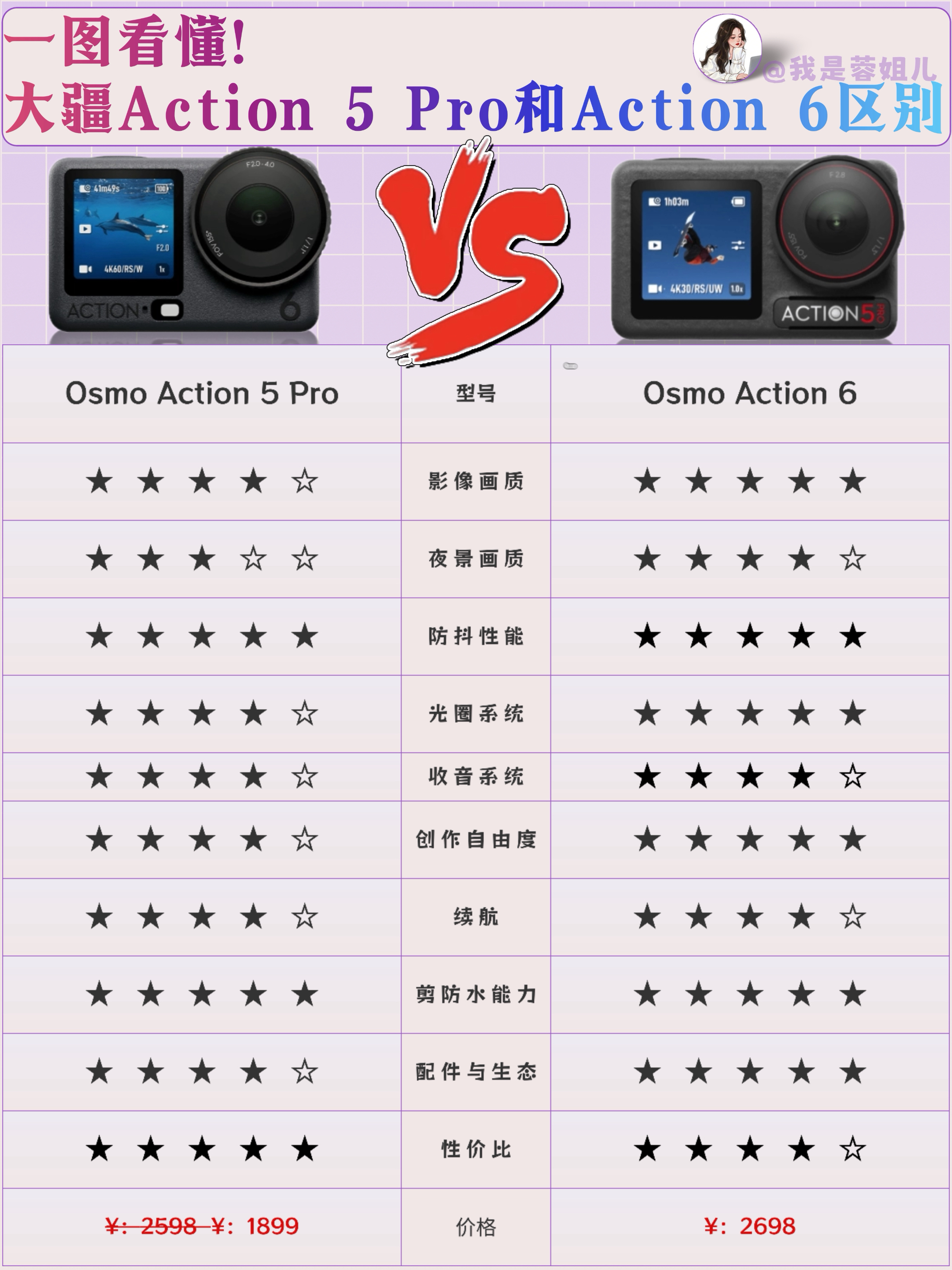 核心结论先摆烂:2k内闭眼冲5 Pro,追极致画质&创作感直接冲6,差价800块的差距,全戳关键痛点! ❶ 夜景党必看🌌 Action6赢麻了!1/1.1英寸大底+可变光圈,夜跑、夜景实拍巨通透,细节拉满不发糊;5 Pro夜景放大秒变模糊感,对光线敏感慎选~ ❷ 创作党狂喜✂️ Action6支持4K自由裁切,后期随便放大裁剪,画质依旧能打,Vlog二创超灵活;5 Pro裁切后画质下滑明显,4K质...