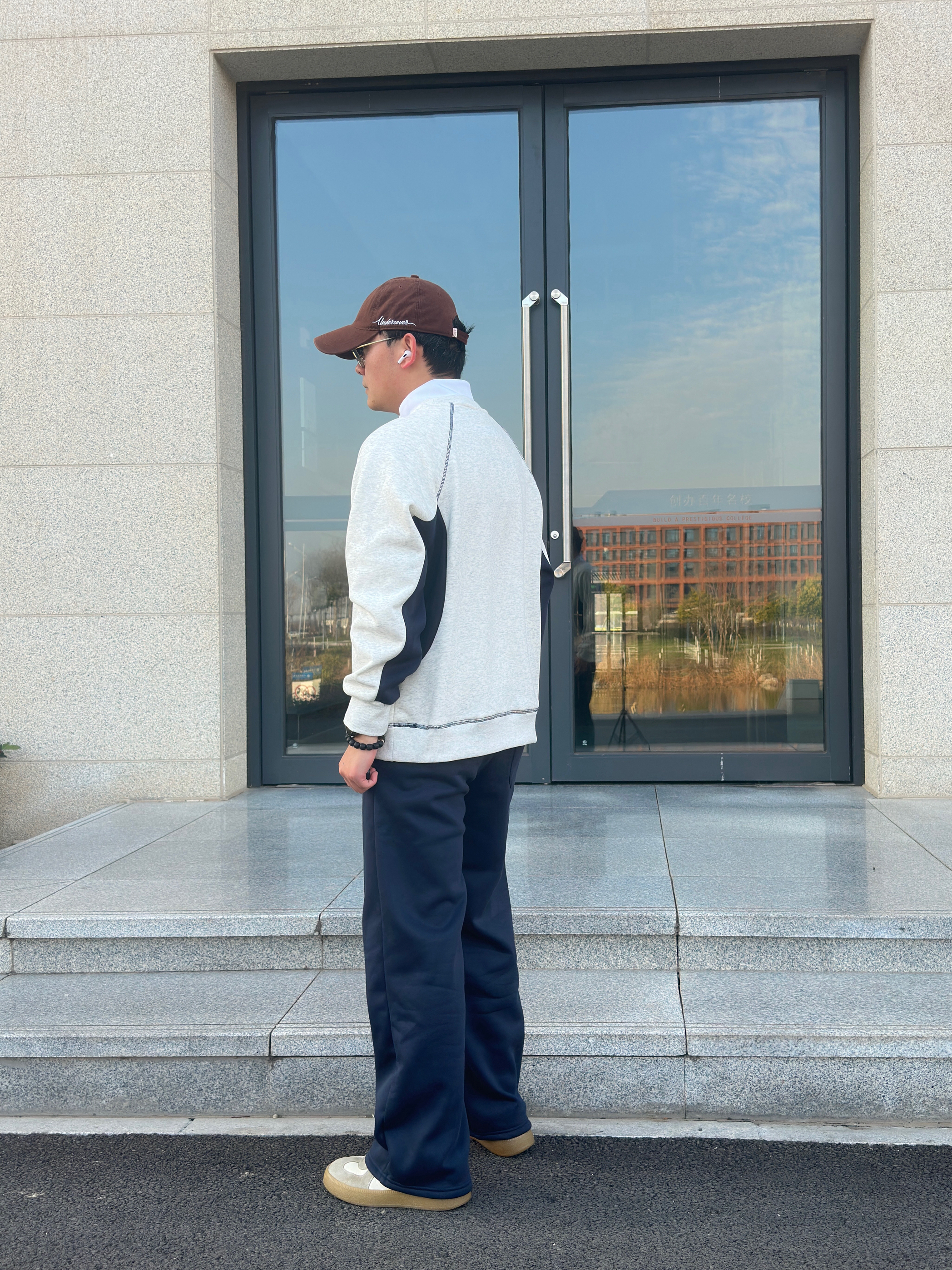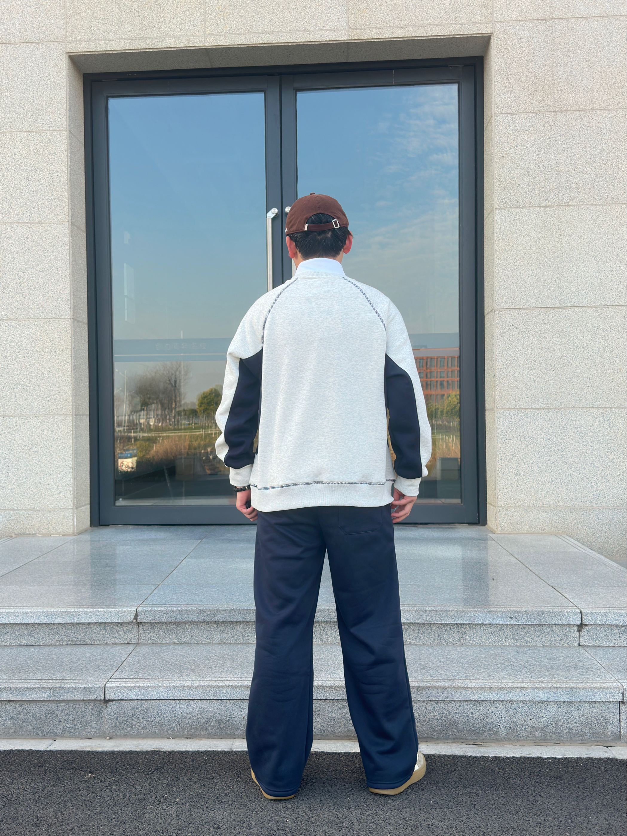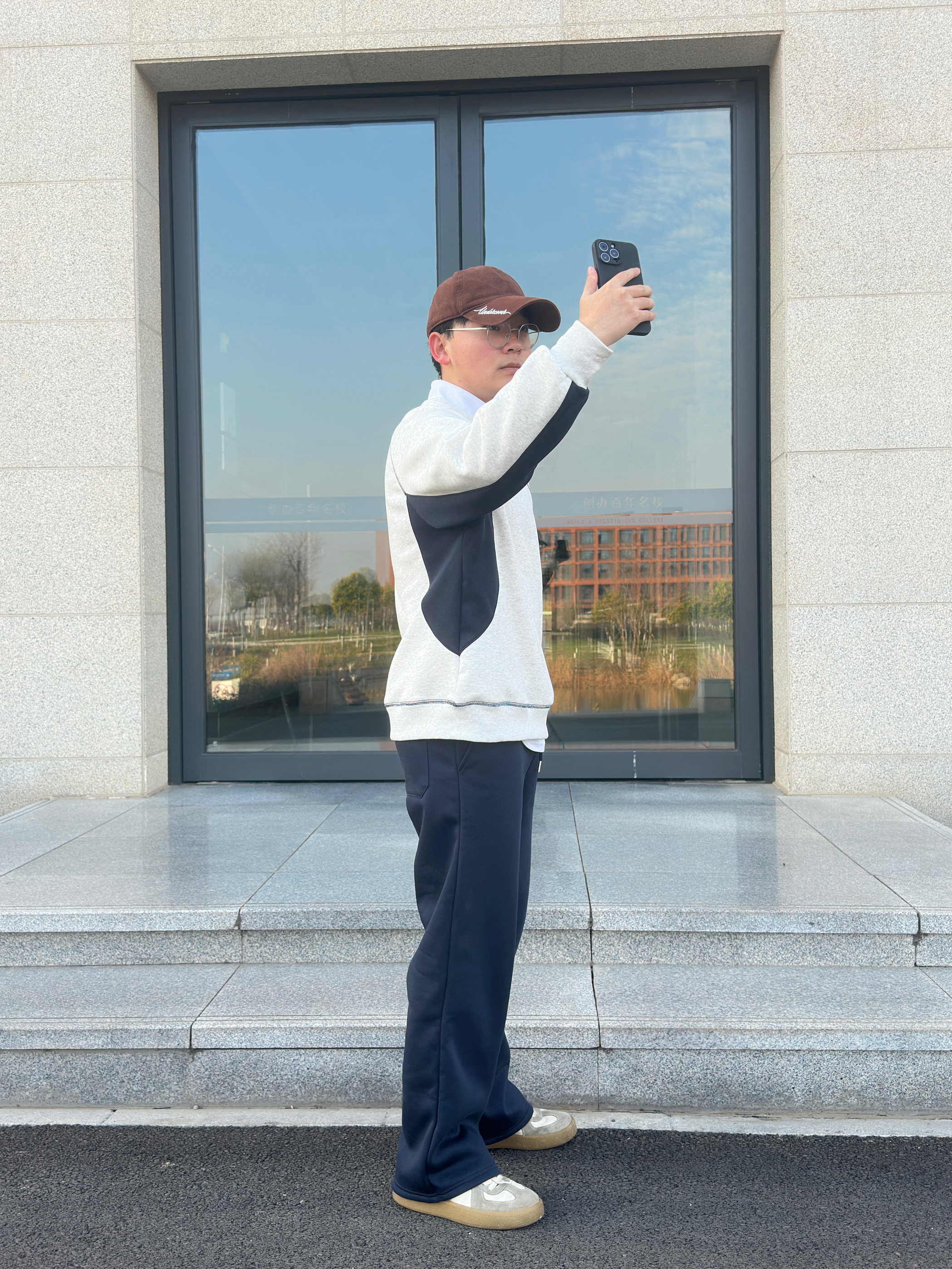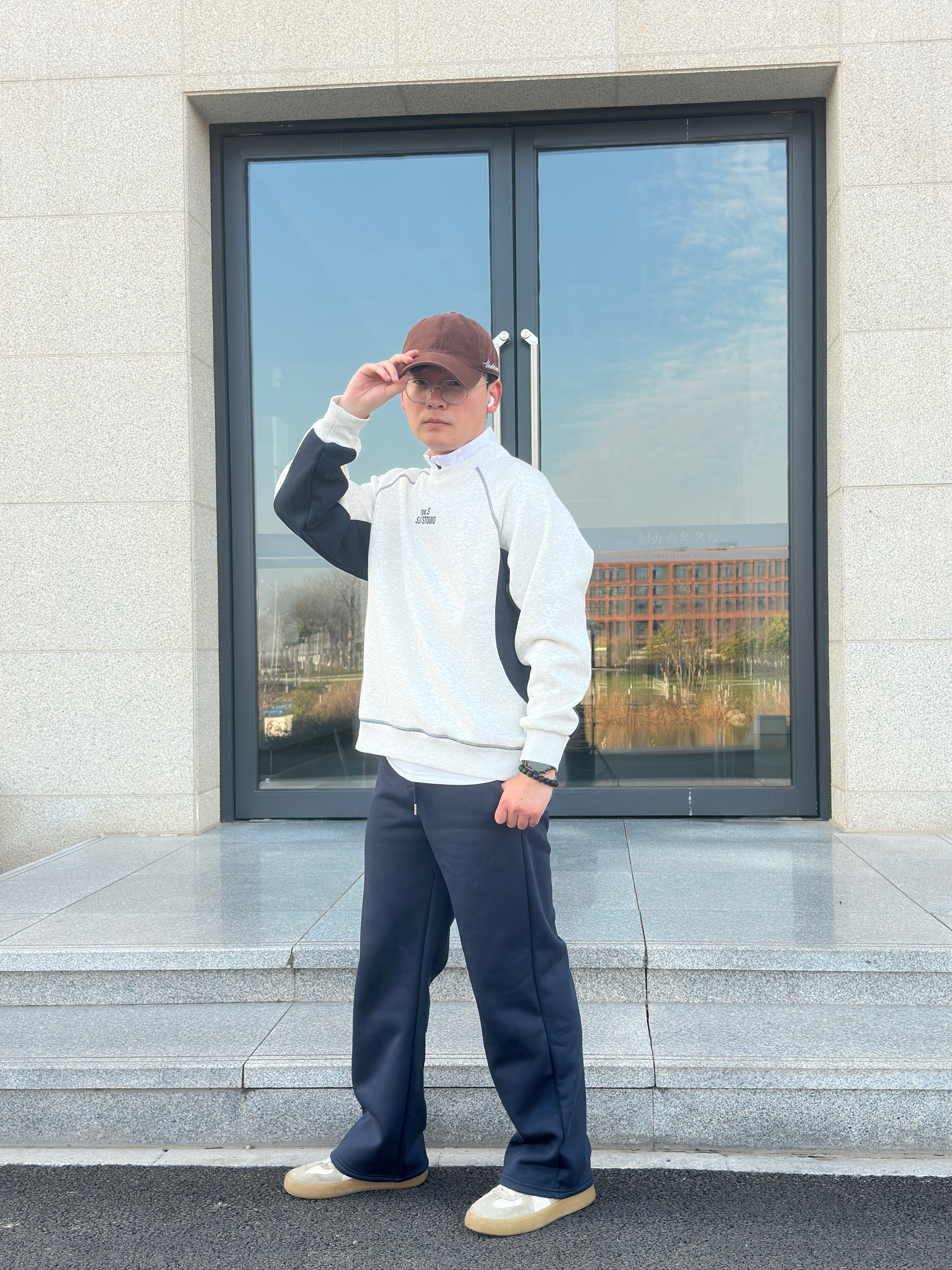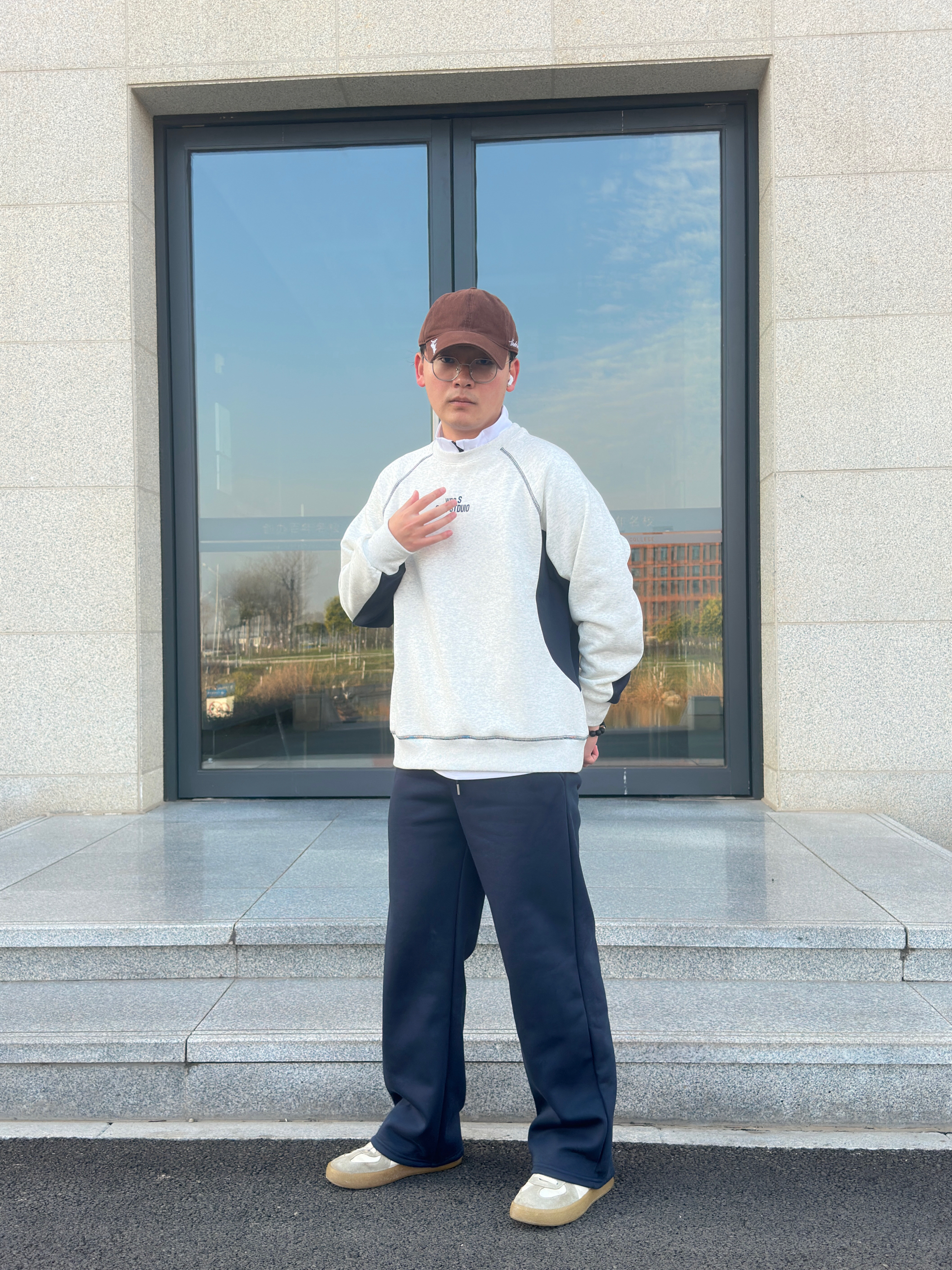 浅灰拼藏青的卫衣戳到我了! 撞色袖管刚好中和了纯色的单一 毛边带点小格调,差点被人以为衣服穿反了 里面叠件白衬衫露个领边 下装选了同色系藏青卫裤,垂坠感不拖沓 卫衣是加绒款但不闷,卫裤口袋够深,揣手机钥匙不硌得慌 心得就是:同色系+小细节叠穿,不用费脑也能穿出清爽利落,这才是打工人的“无痛穿搭”吧~