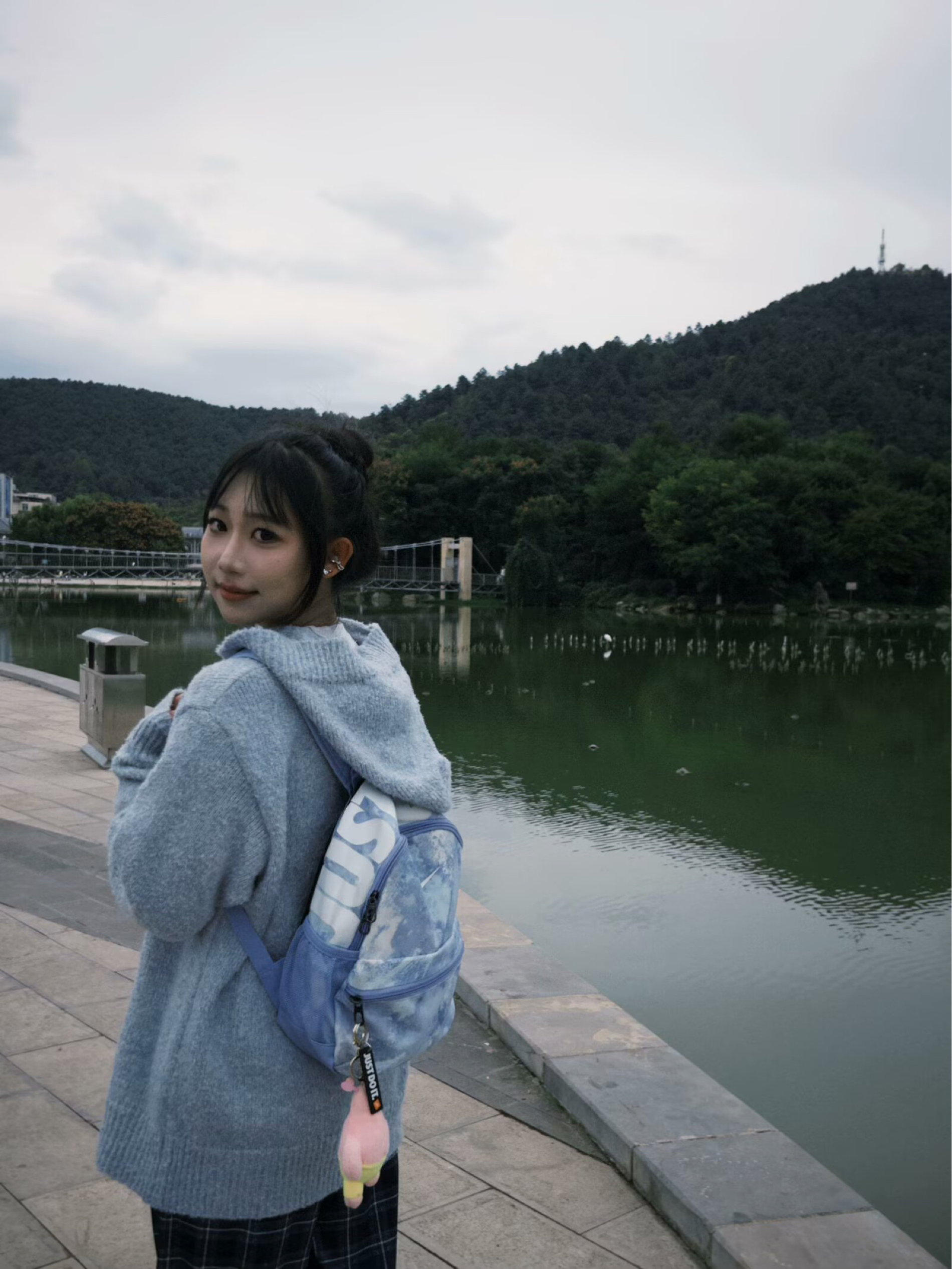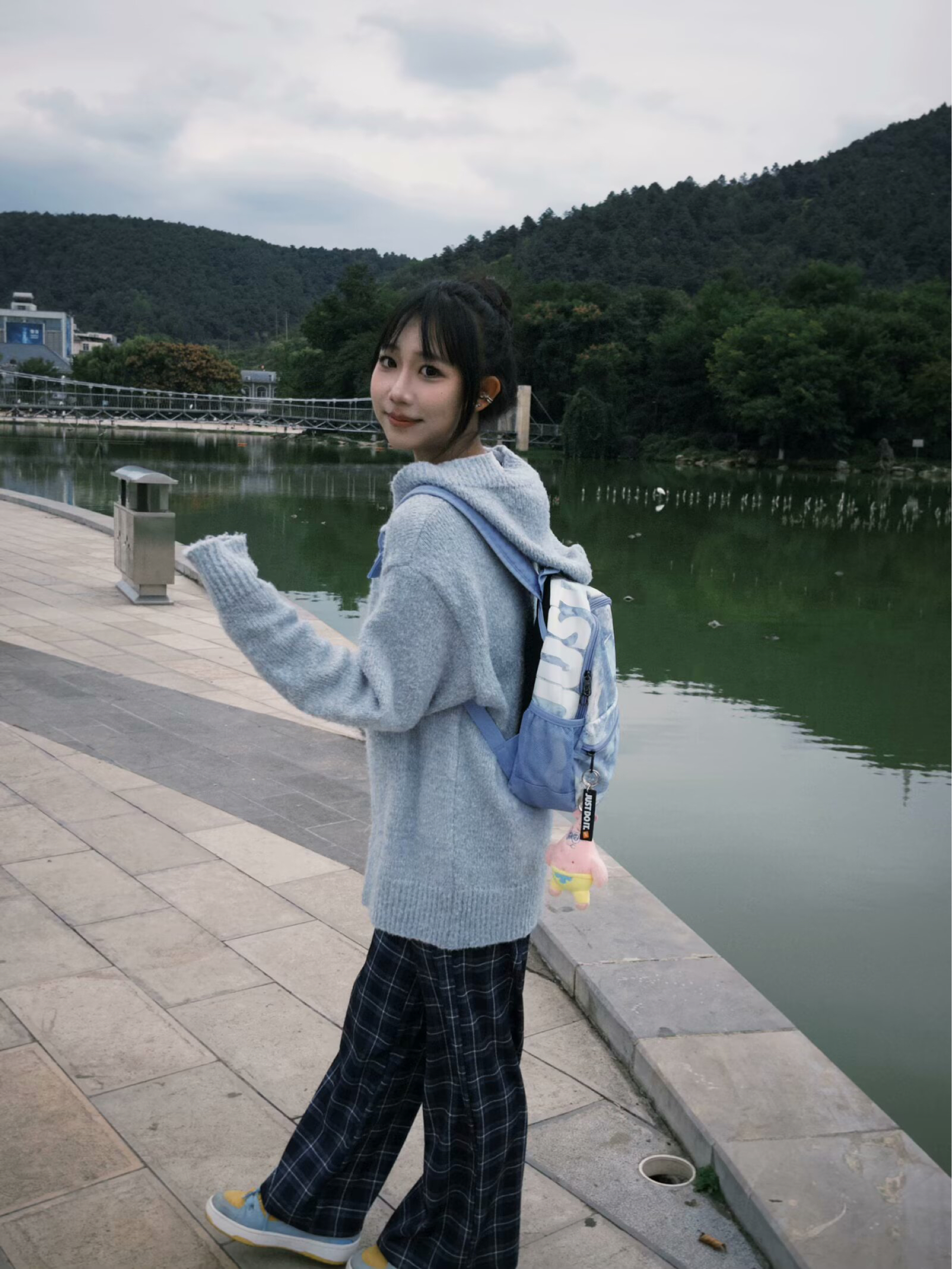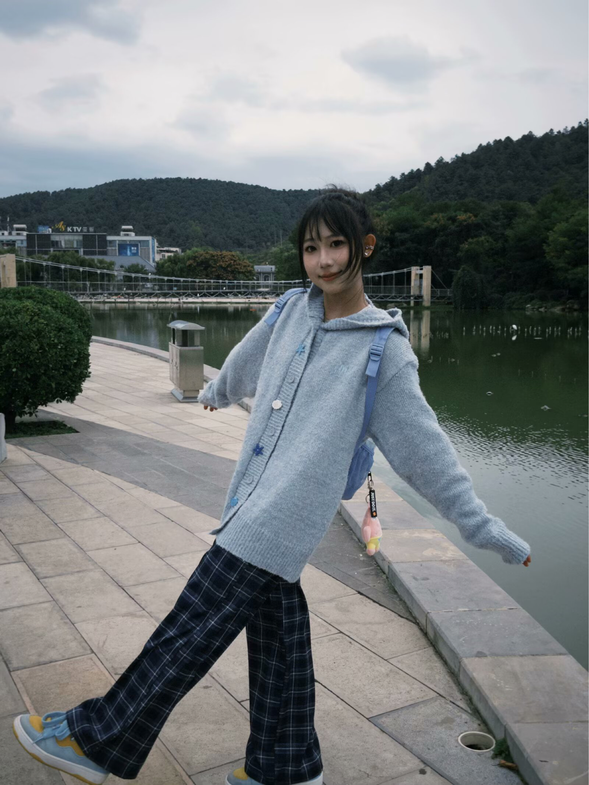 浅蓝连帽针织开衫软糯减龄,深色格纹阔腿裤复古显瘦,黄蓝撞色鞋点亮小心机。整体风格慵懒中带点俏皮,湖边漫步或校园出街都适配,轻松营造韩系小姐姐氛围感,谁穿谁是温柔本体!