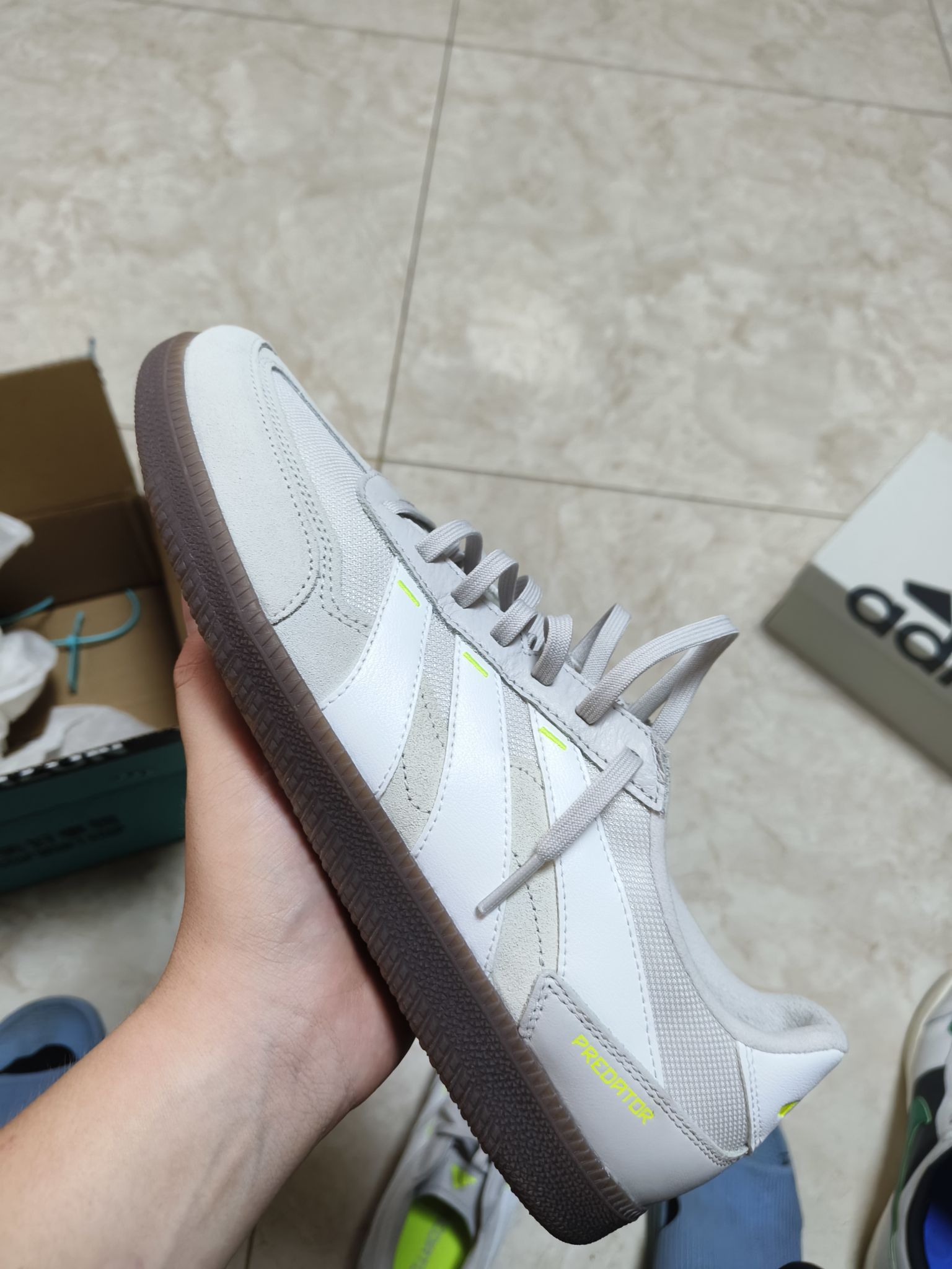 独特设计的足球风德训鞋 侧边三条杠大logo➕灰黄颜色搭配真的不错