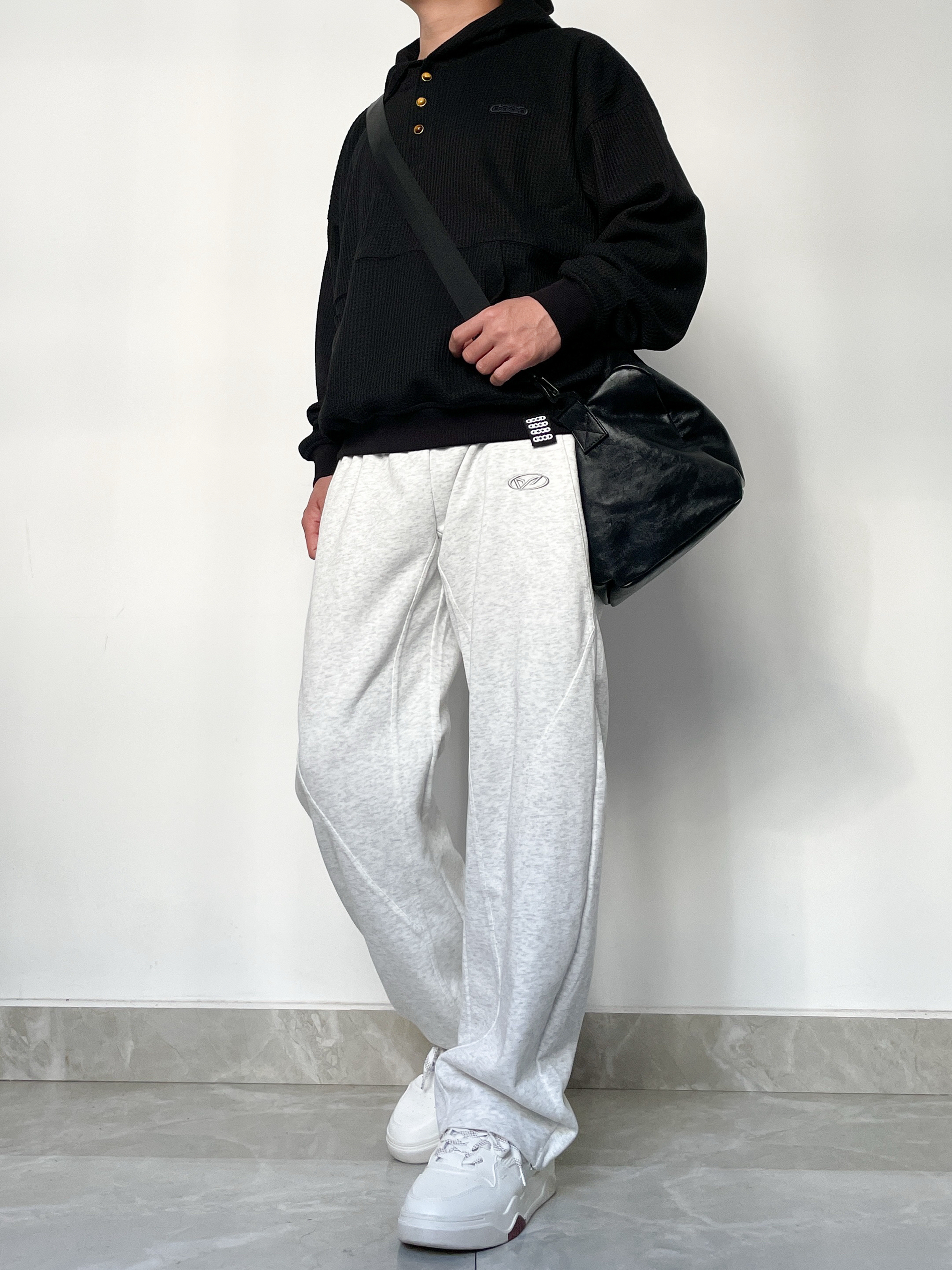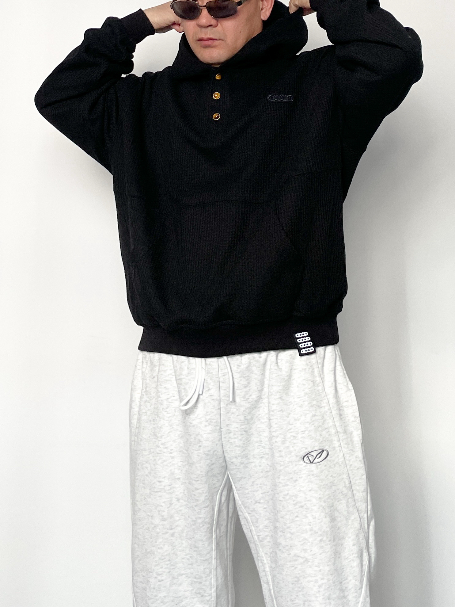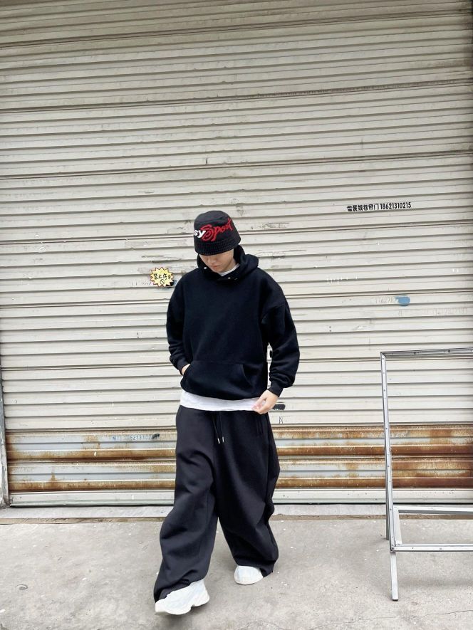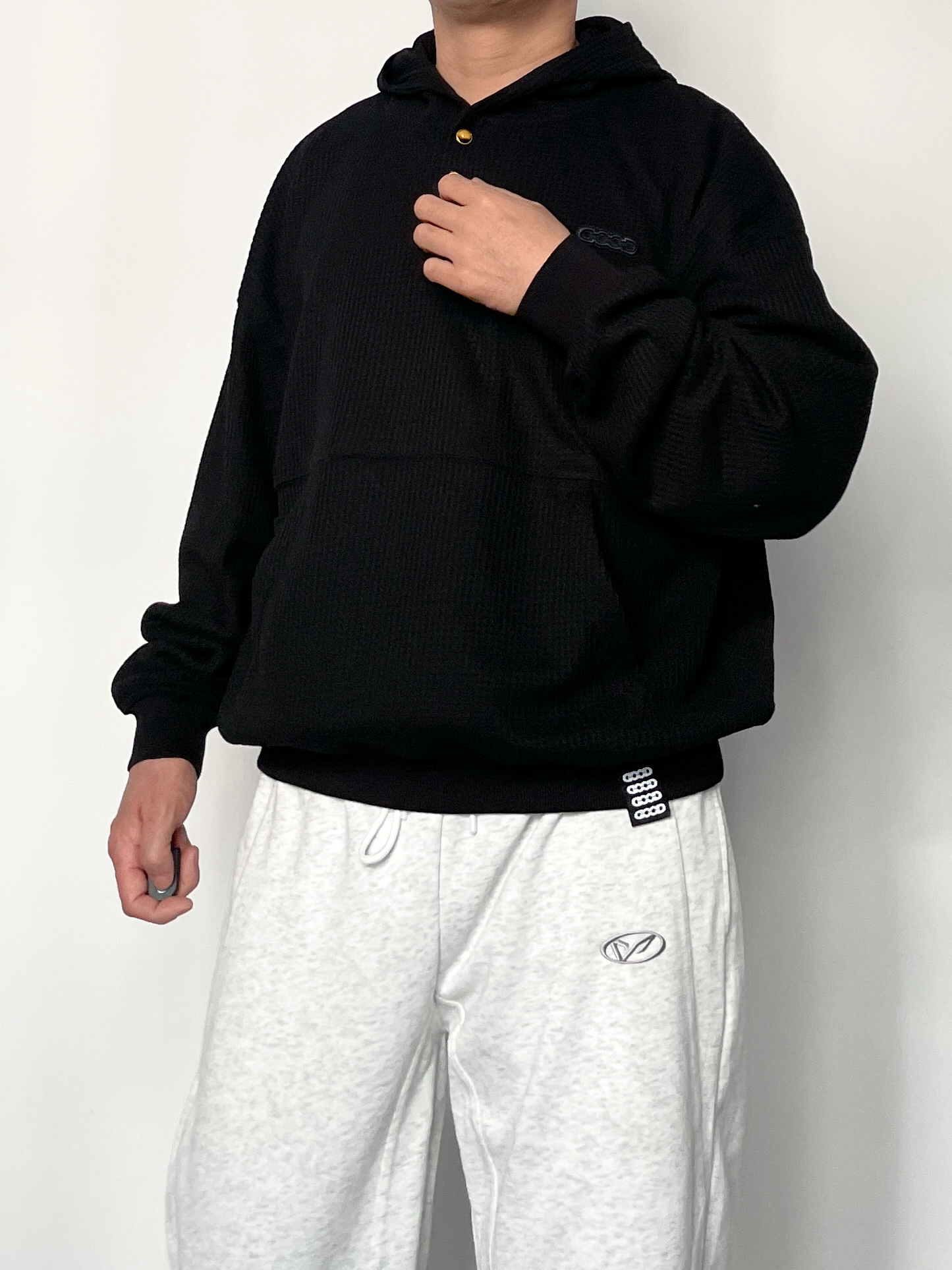 ❤️hi宝子们好!🤌今日分享: 秋冬舒适感穿搭也能穿出高级帅! 今天上身一件GOOD华夫格连帽卫衣 金扣+暗纹logo的细节太戳人,华夫格面料自带质感,宽松版型裹着超舒服! 裤子搭配浅灰阔腿卫裤 垂坠感面料+简约小标设计,慵懒又不拖沓,浅灰调还能中和上衣的厚重感~ 这套“黑+浅灰”的松弛搭配,日常通勤、休闲出街都能直接穿,舒服又有腔调!