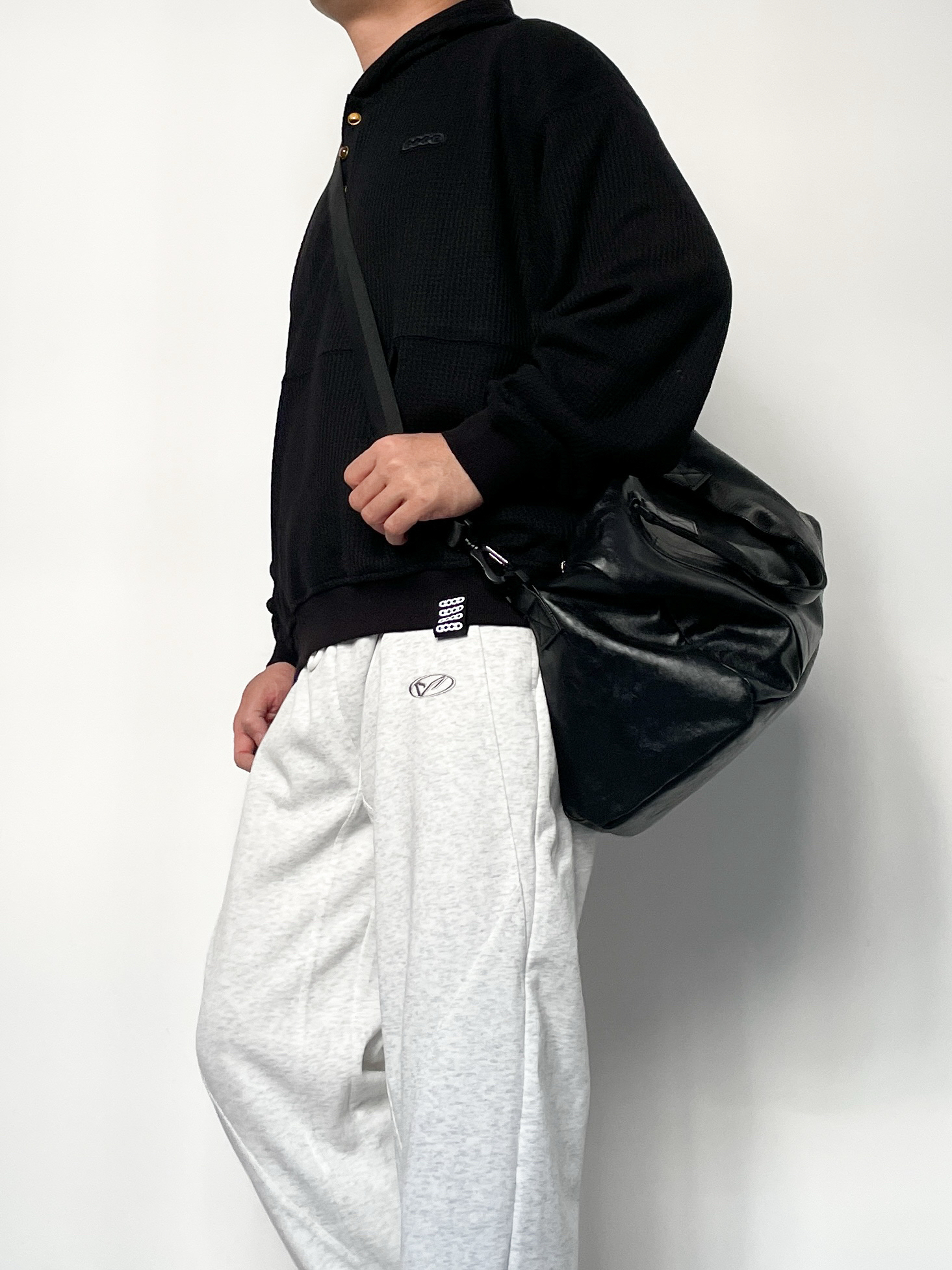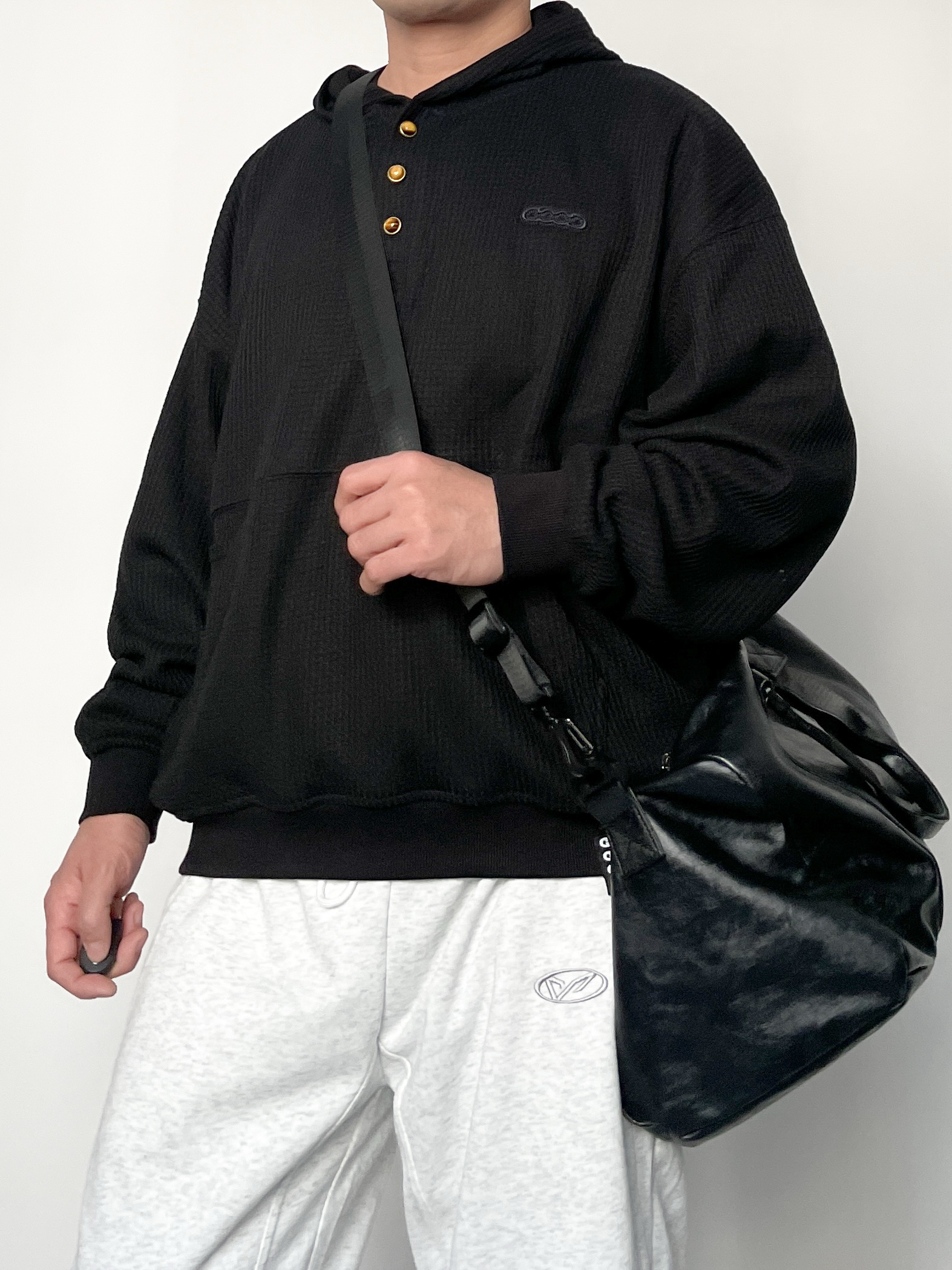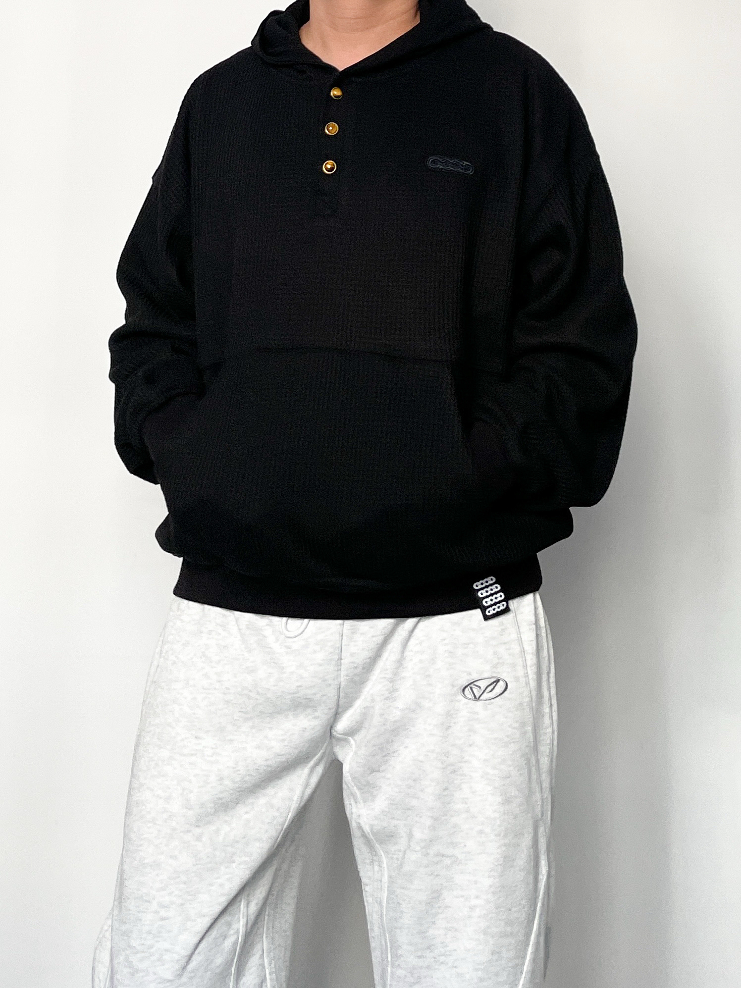 ❤️hi宝子们好!🤌今日分享: 秋冬舒适感穿搭也能穿出高级帅! 今天上身一件GOOD华夫格连帽卫衣 金扣+暗纹logo的细节太戳人,华夫格面料自带质感,宽松版型裹着超舒服! 裤子搭配浅灰阔腿卫裤 垂坠感面料+简约小标设计,慵懒又不拖沓,浅灰调还能中和上衣的厚重感~ 这套“黑+浅灰”的松弛搭配,日常通勤、休闲出街都能直接穿,舒服又有腔调!