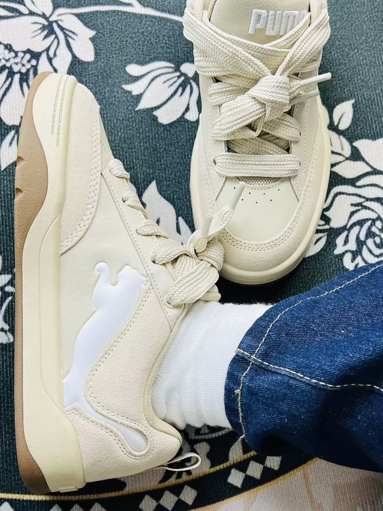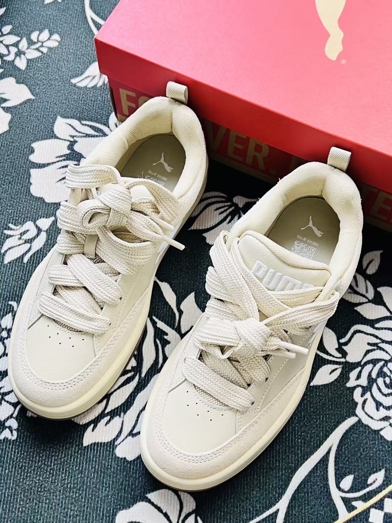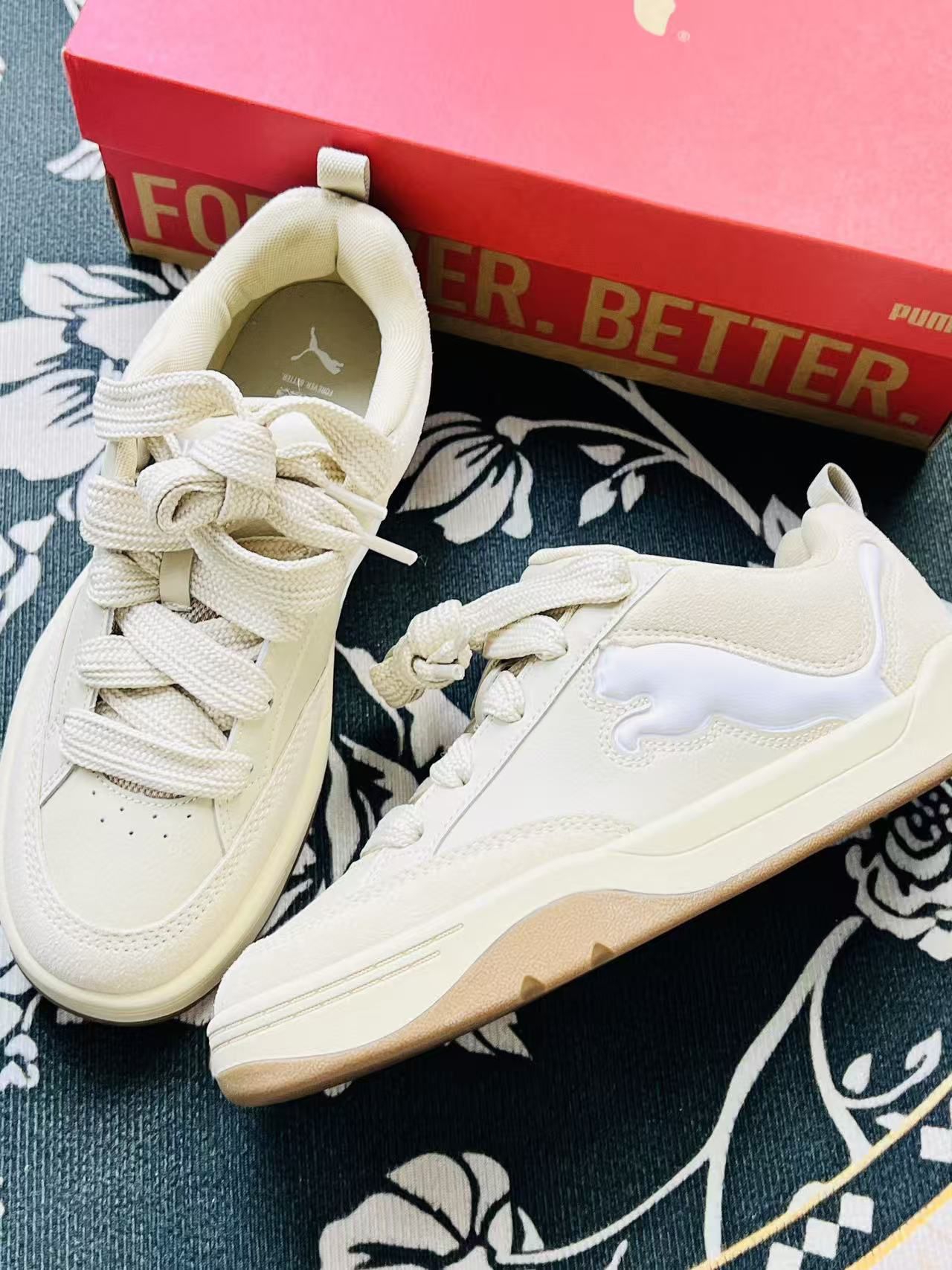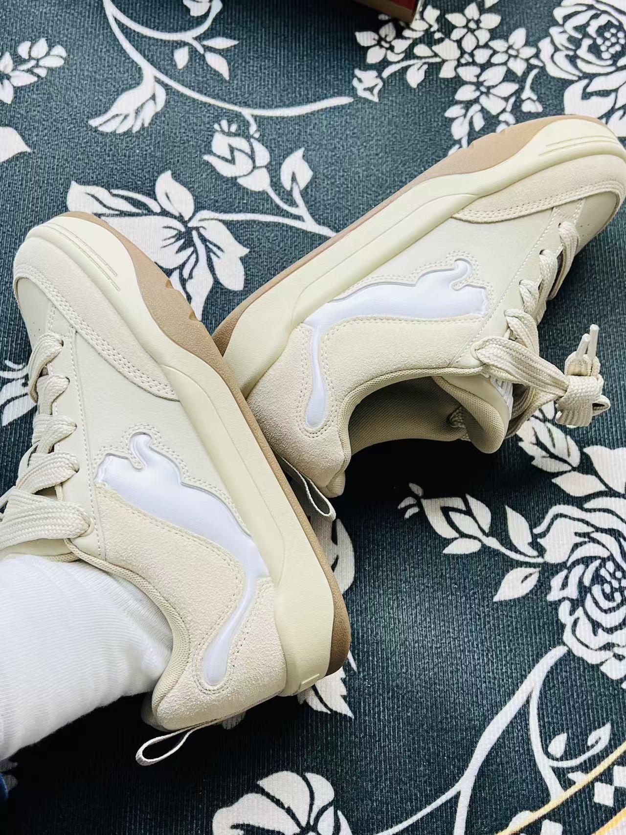 这双Puma的米色系板鞋到手试穿了快一周,第一感觉是脚感比想象中软乎,鞋底不是硬邦邦的那种,上下班走半小时的路,脚后跟也没觉得硌得慌😌。 米白加奶咖底的颜色特别讨喜,配浅色牛仔裤或者卡其色裤子都很搭,鞋身那个亮面的Logo不扎眼但又有点小细节,不用特意想搭配也不会出错。两双换着穿的时候,能感觉到鞋面的布料比较轻,不像有些板鞋会闷着脚,天气稍微热一点也能接受。 缺点也挺直接:鞋带是那种偏厚的...