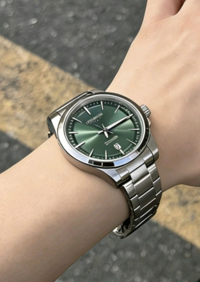 38mm尺寸细腕也能hold,绿盘在光下超有质感。精钢表带耐造不刮手,自动机械机芯走时稳,72小时动储不用频繁调。100米防水洗手游泳都不怕,通勤约会戴都合适,情侣凑对戴超吸睛~