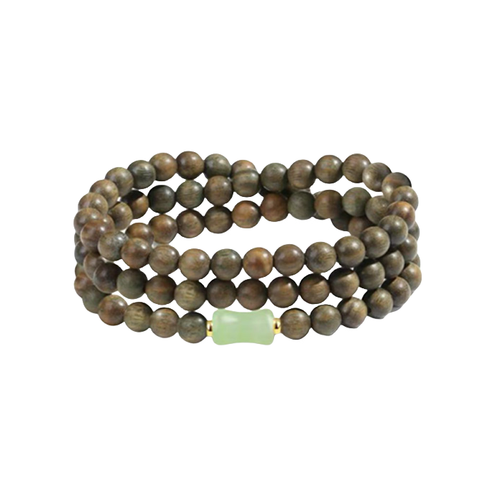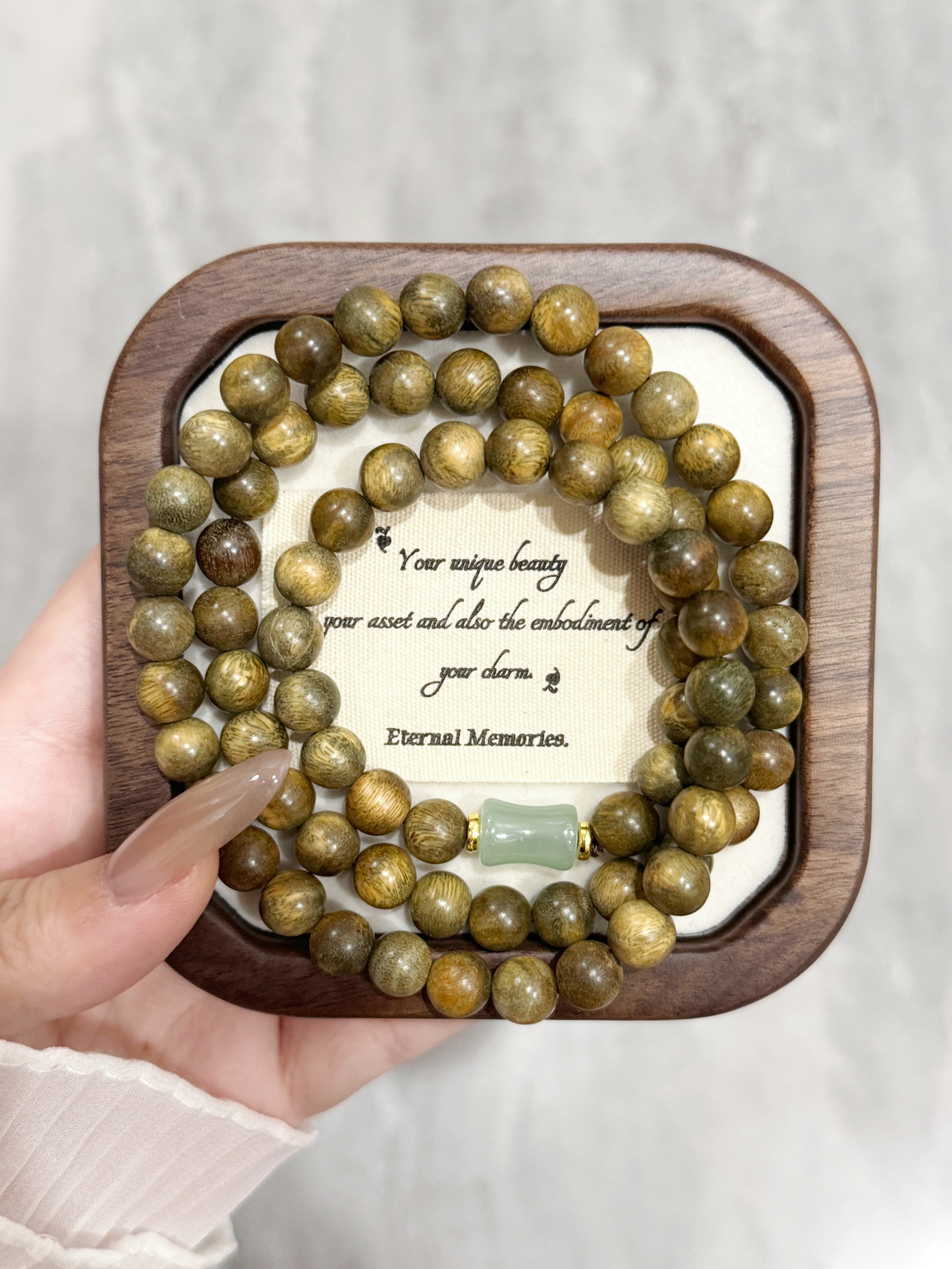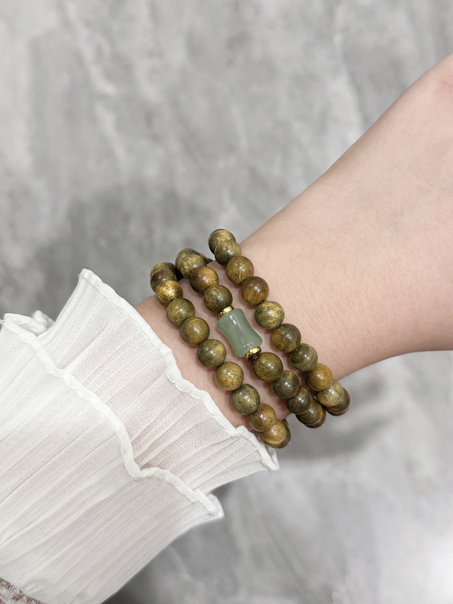 一抹沉香绕腕间,藏着自然的温润与岁月的静雅。绿檀木珠串起的温柔,搭配翡翠竹节的清雅,每一次抬手,都是与东方雅致的不期而遇。 木质的醇厚香气缓缓散逸,在喧嚣里寻得一方心安,既是日常穿搭的别致点缀,也是独属于自己的温柔陪伴。