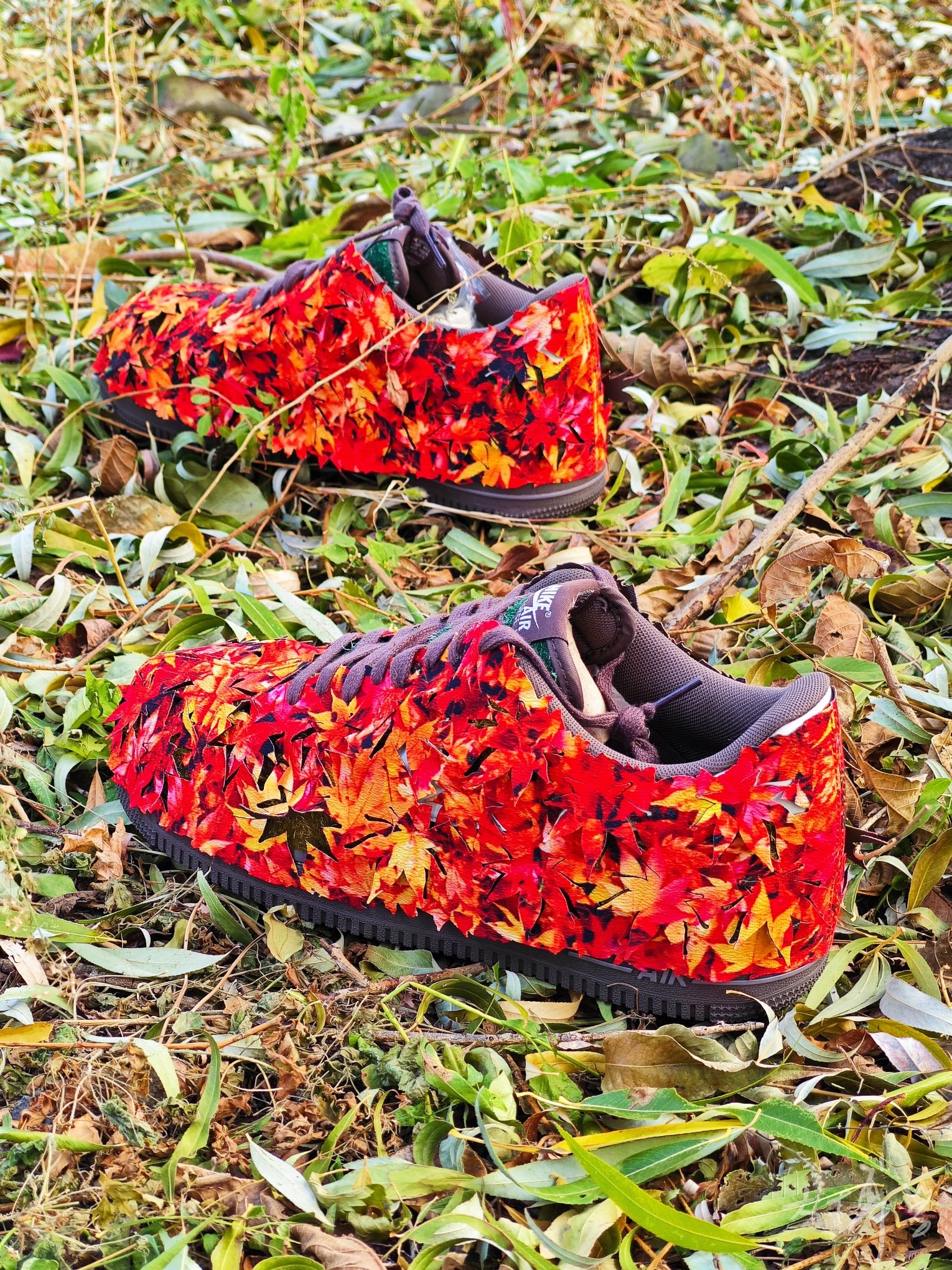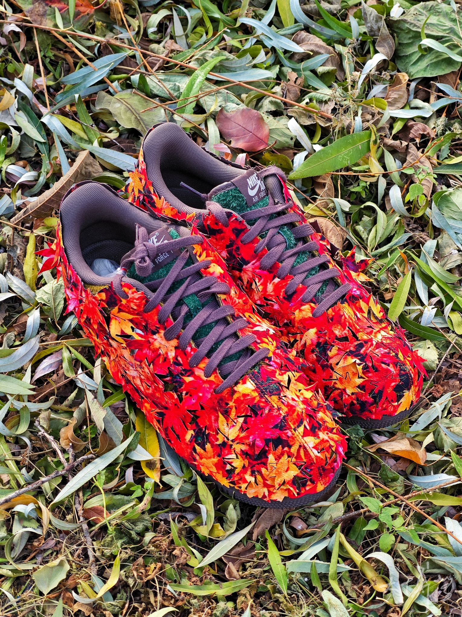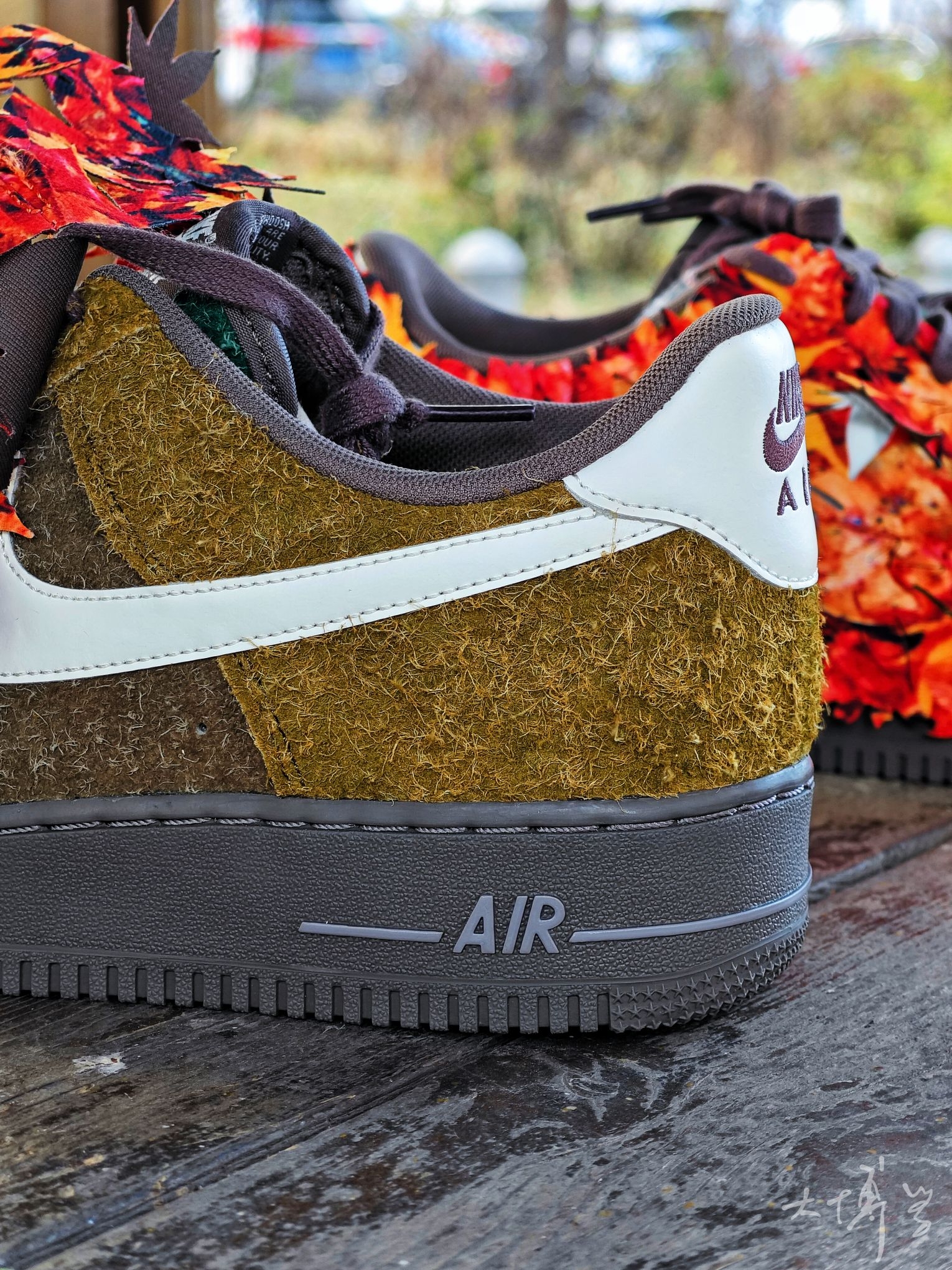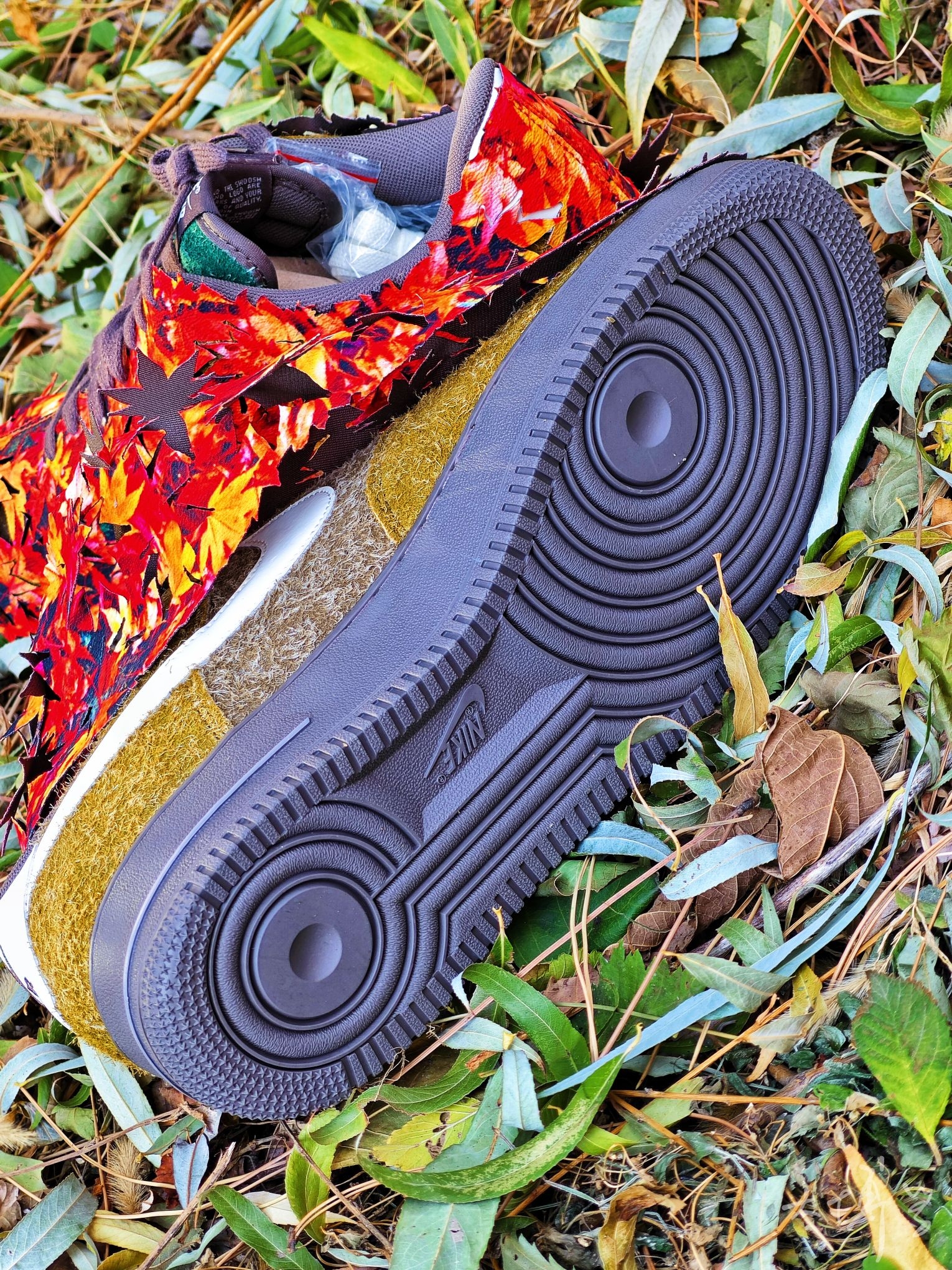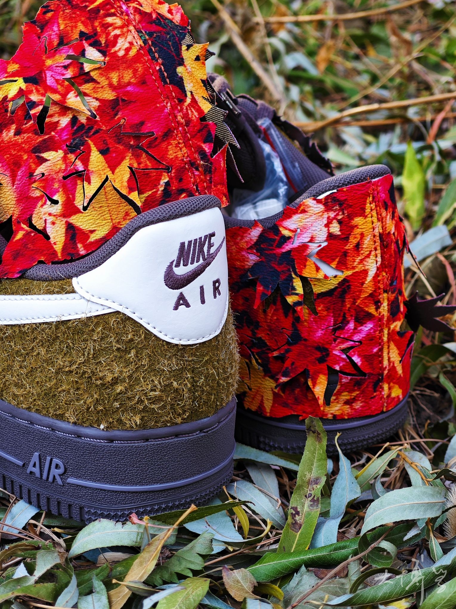 一款让我眼花缭乱的AF1 鞋面外层可剥离设计 表层印刷红、黄、橙三色枫叶图案 并且用激光雕刻出一些枫叶轮廓 很立体,也很凌乱 下层鞋面是毛绒麂皮 就像是落叶下的枯草植被 整体模拟秋天落叶景象 上脚效果出众 就像把秋天穿在脚上 但是麂皮怕水、红叶层怕刮 适合拍照,不太适合走路