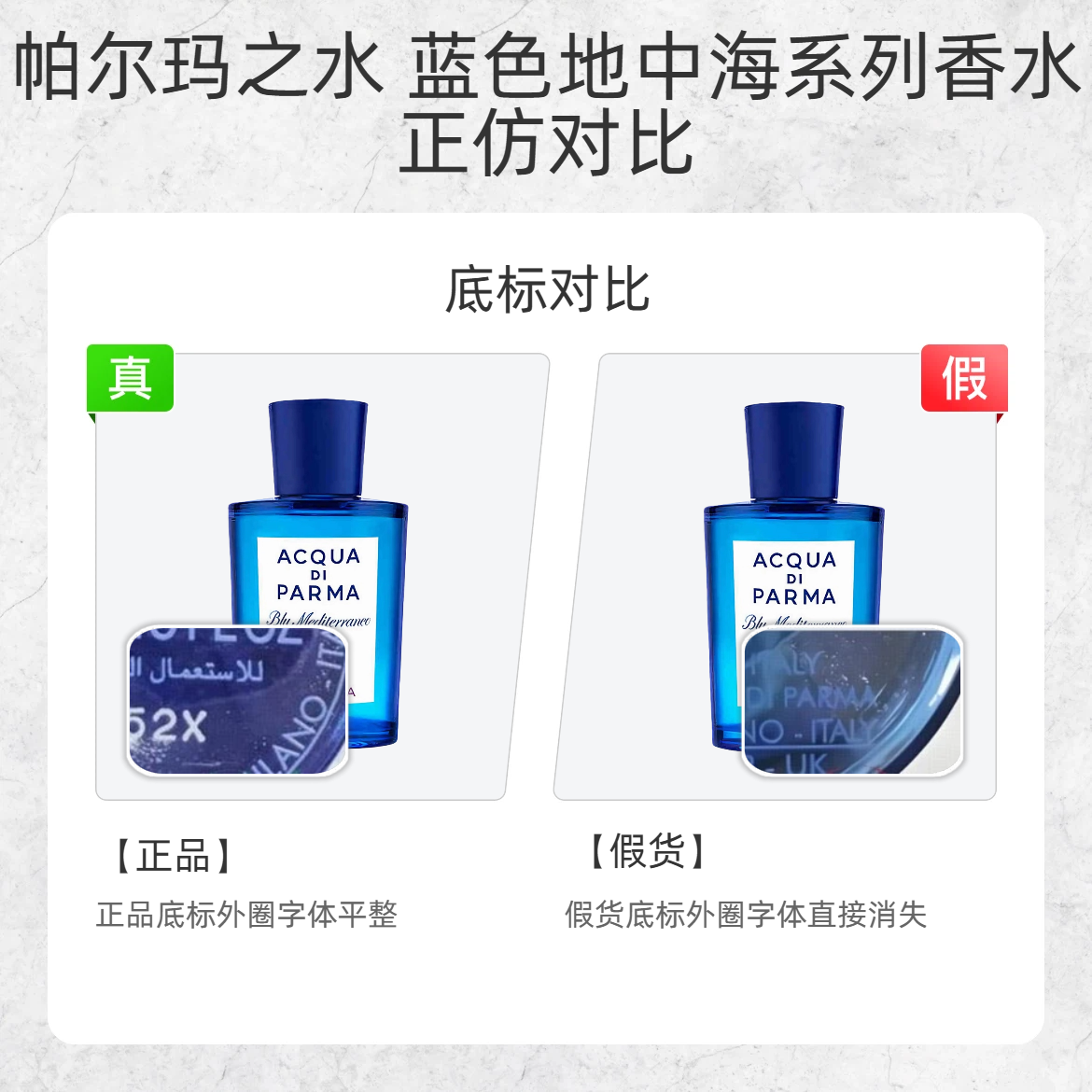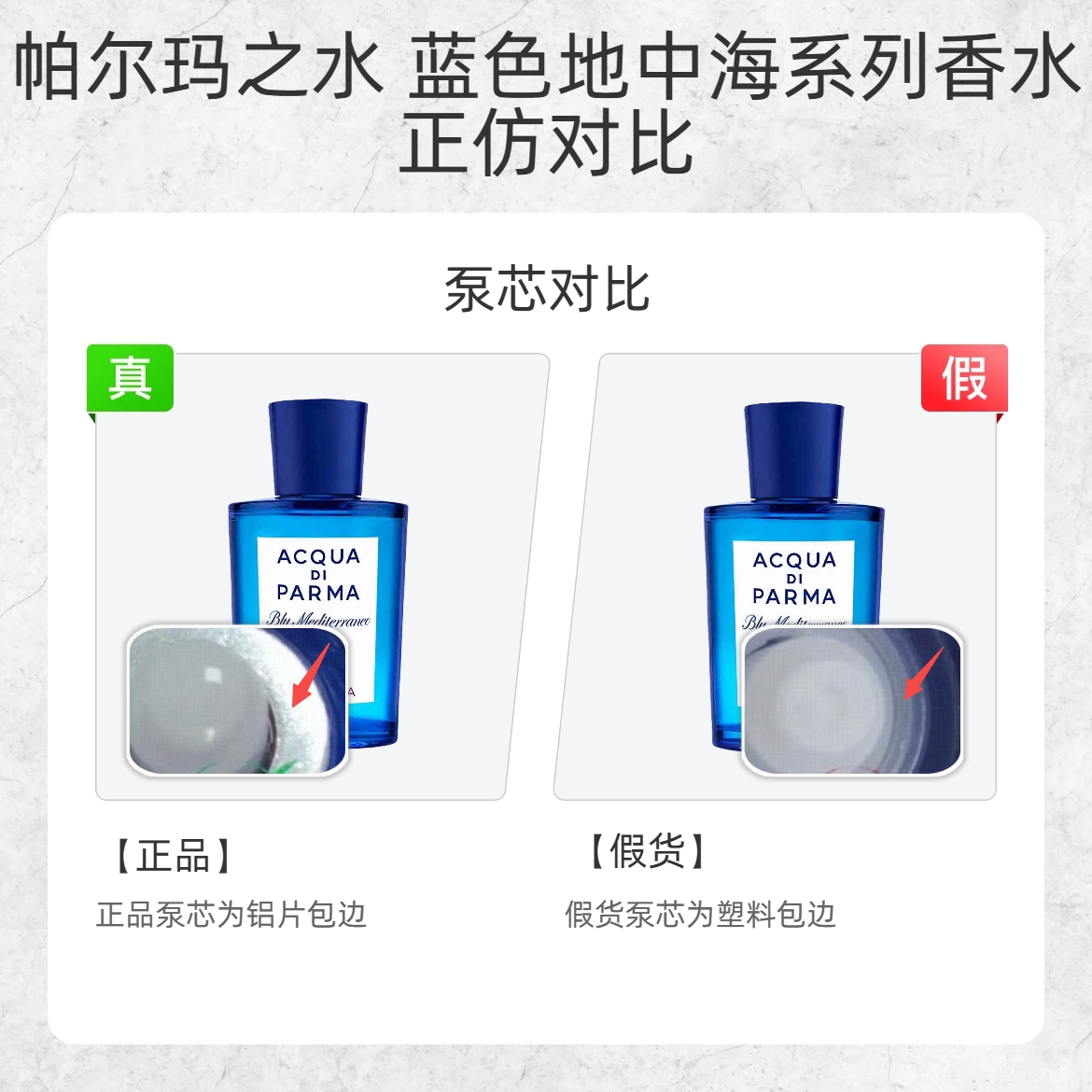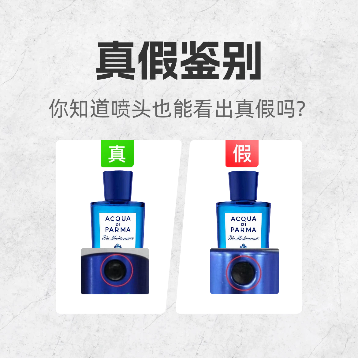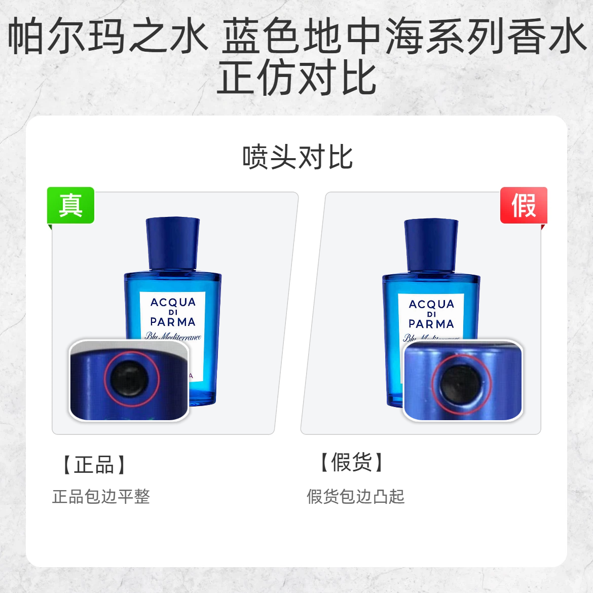 谁还没被这瓶 “地中海的蓝” 戳中过!但假货真的太会蹭热度了😡 今天手把手教你 3 招辨真假,买前必看! 1️⃣ 喷头细节 ✅ 正品喷头:包边平整光滑,边缘没有凸起 ❌ 假货喷头:包边明显凸起,做工粗糙 2️⃣ 底标字体 ✅ 正品底标:外圈字体清晰平整,无模糊 / 断字 ❌ 假货底标:字体直接 “消失”,印刷敷衍到离谱 3️⃣ 泵芯材质 ✅ 正品泵芯:铝片包边,金属质感 ❌ 假货泵芯:塑料包...