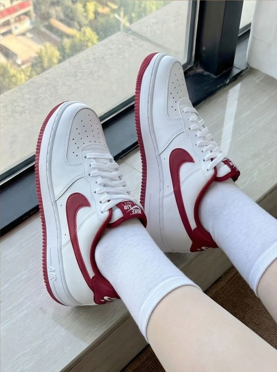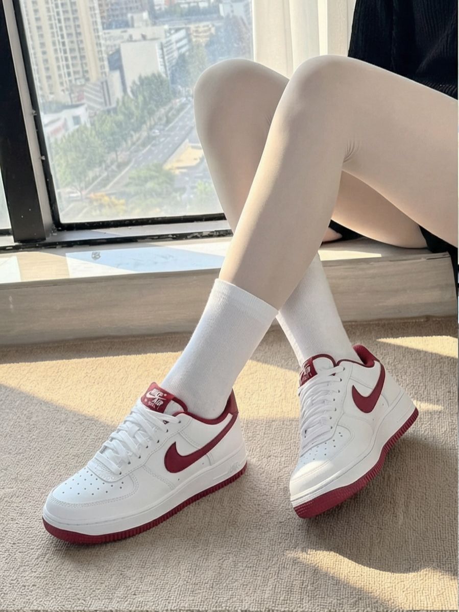 姐妹们快把显白穿搭焊在脚上!纯白鞋身配酒红 swoosh+鞋底,低饱和配色巨显贵!搭奶白中筒袜秒变漫画腿,牛仔裤/裙装都hold住,校园感+韩系氛围直接拉满~皮质软fufu,日常通勤暴走不磨脚,阳光下酒红细节超有质感!新春蛇年配色寓意又吉利,送礼自穿都绝~谁懂啊,这双才是显白天花板!