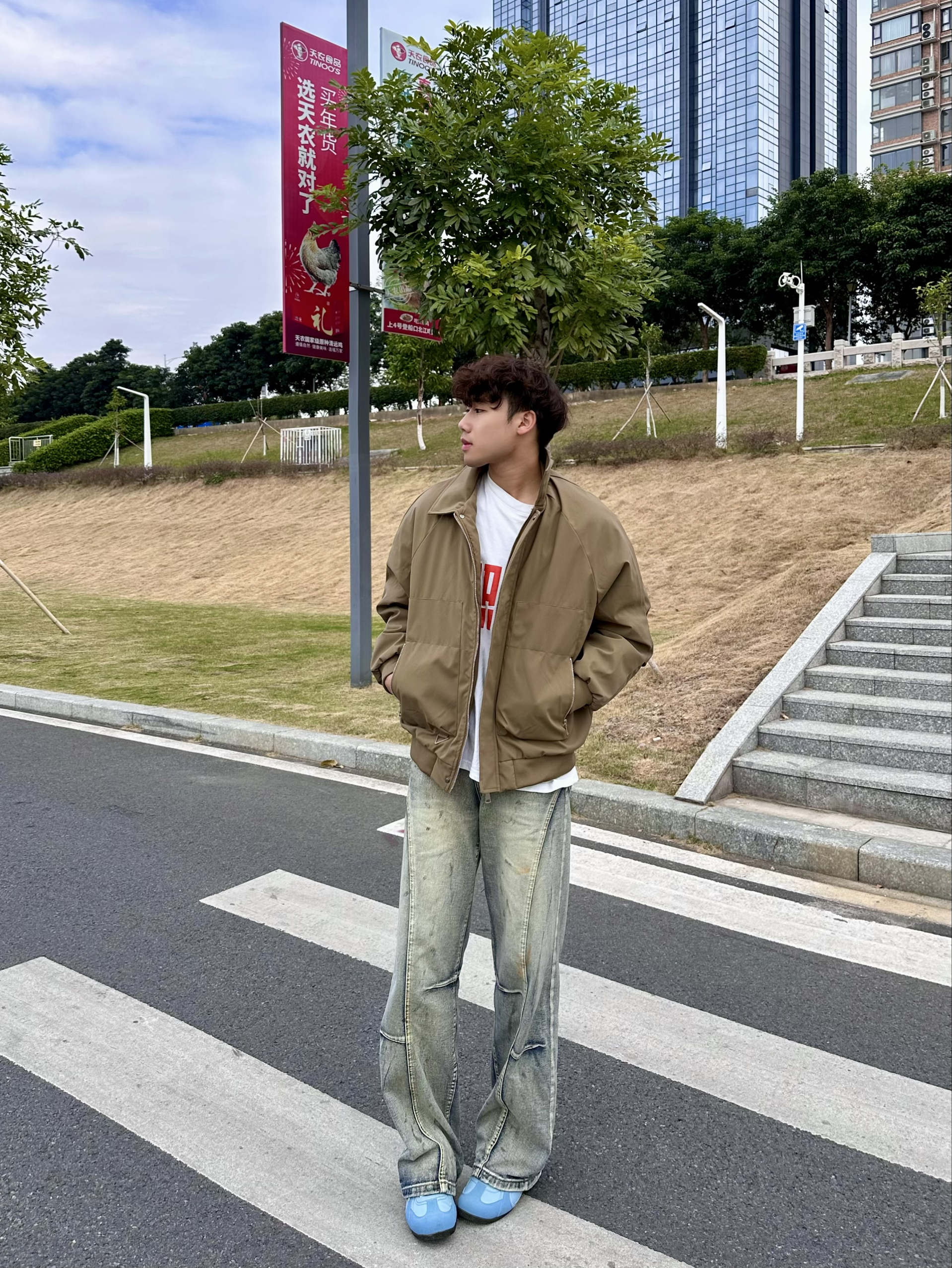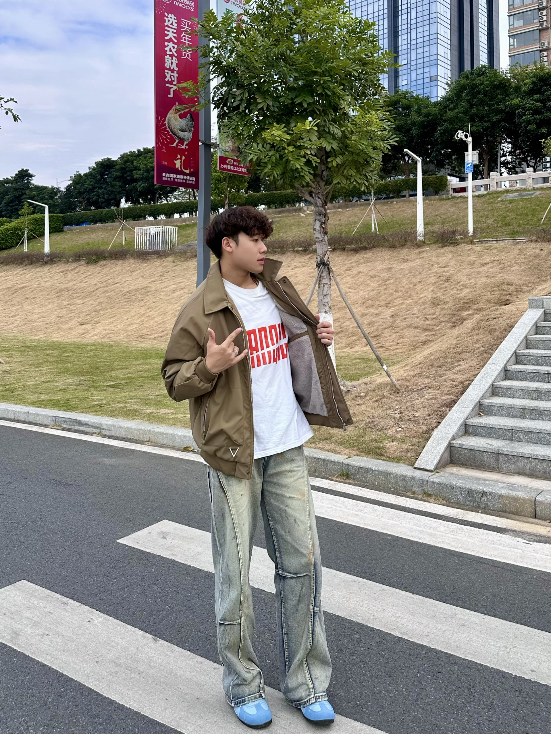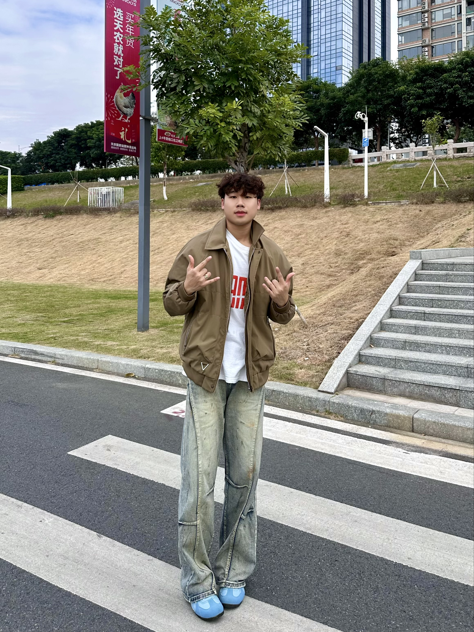 今天搭的这套走街头风,卡其色外套配白T打底,简单又有层次感。浅蓝牛仔裤的阔腿版型很藏肉,和外套的宽松感呼应上了。最后踩双蓝鞋提个亮点,整体就是不用费脑的搭配,出门溜达穿着也舒服。