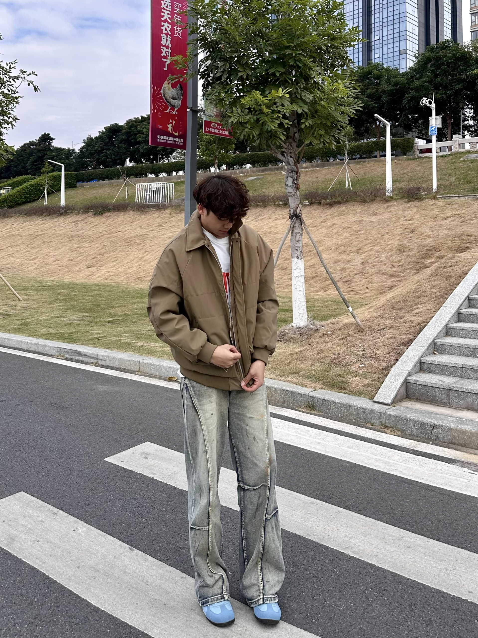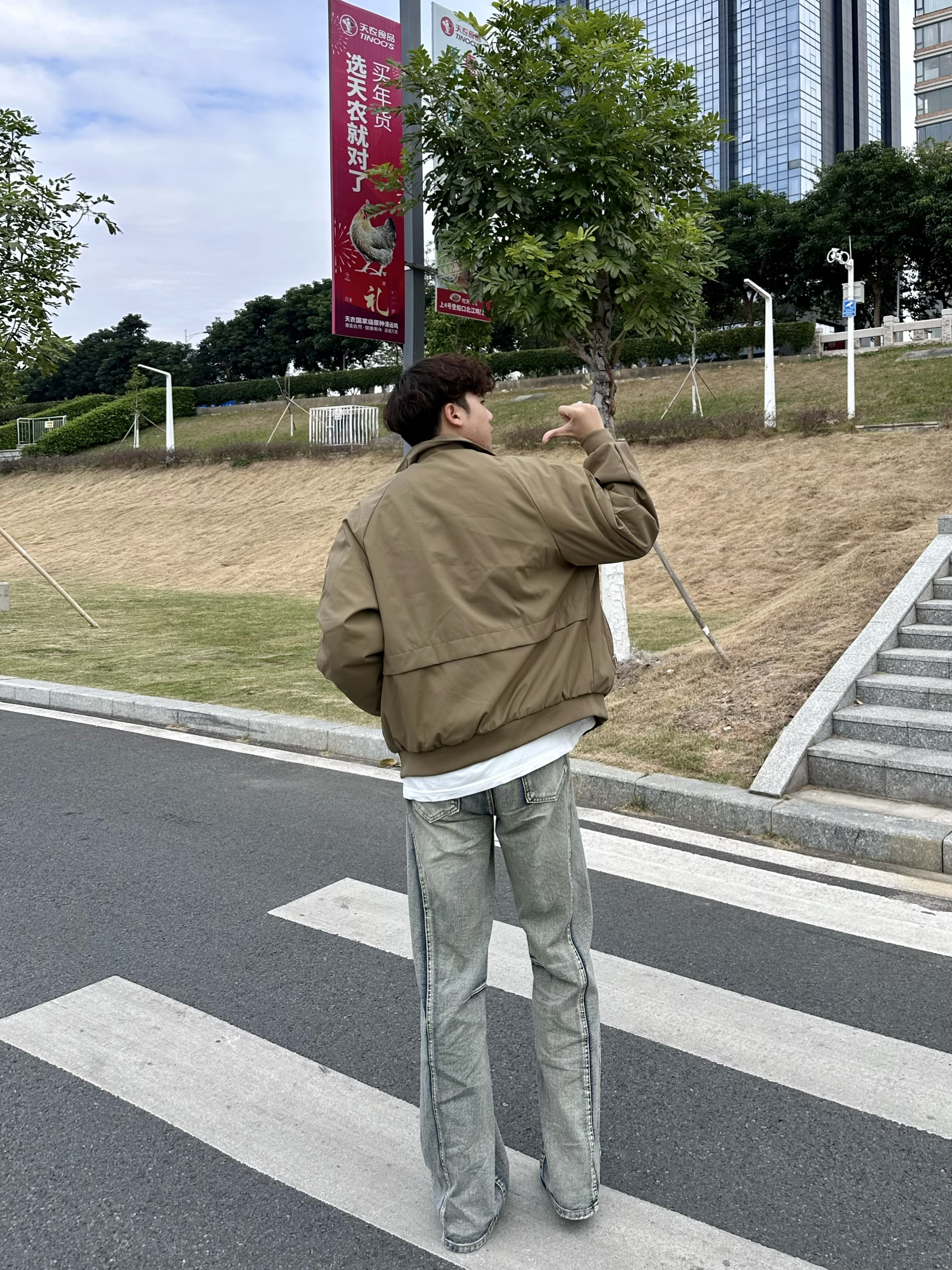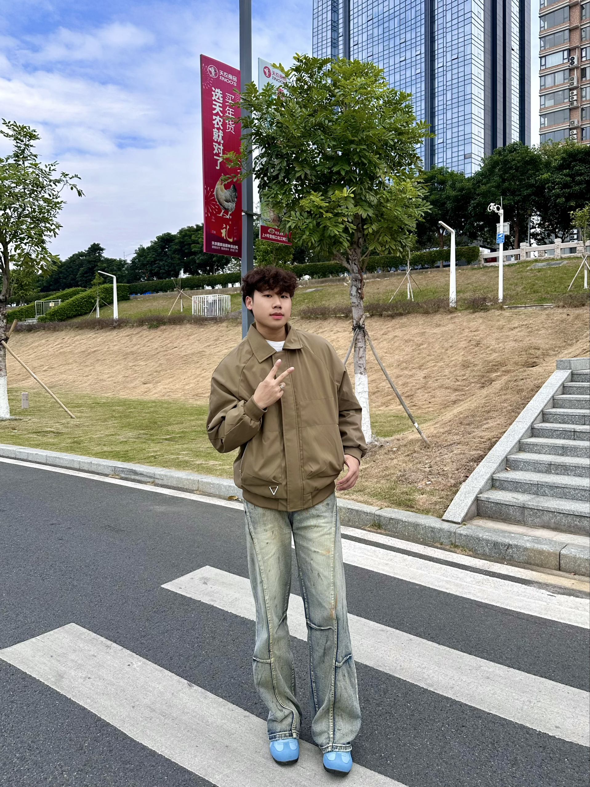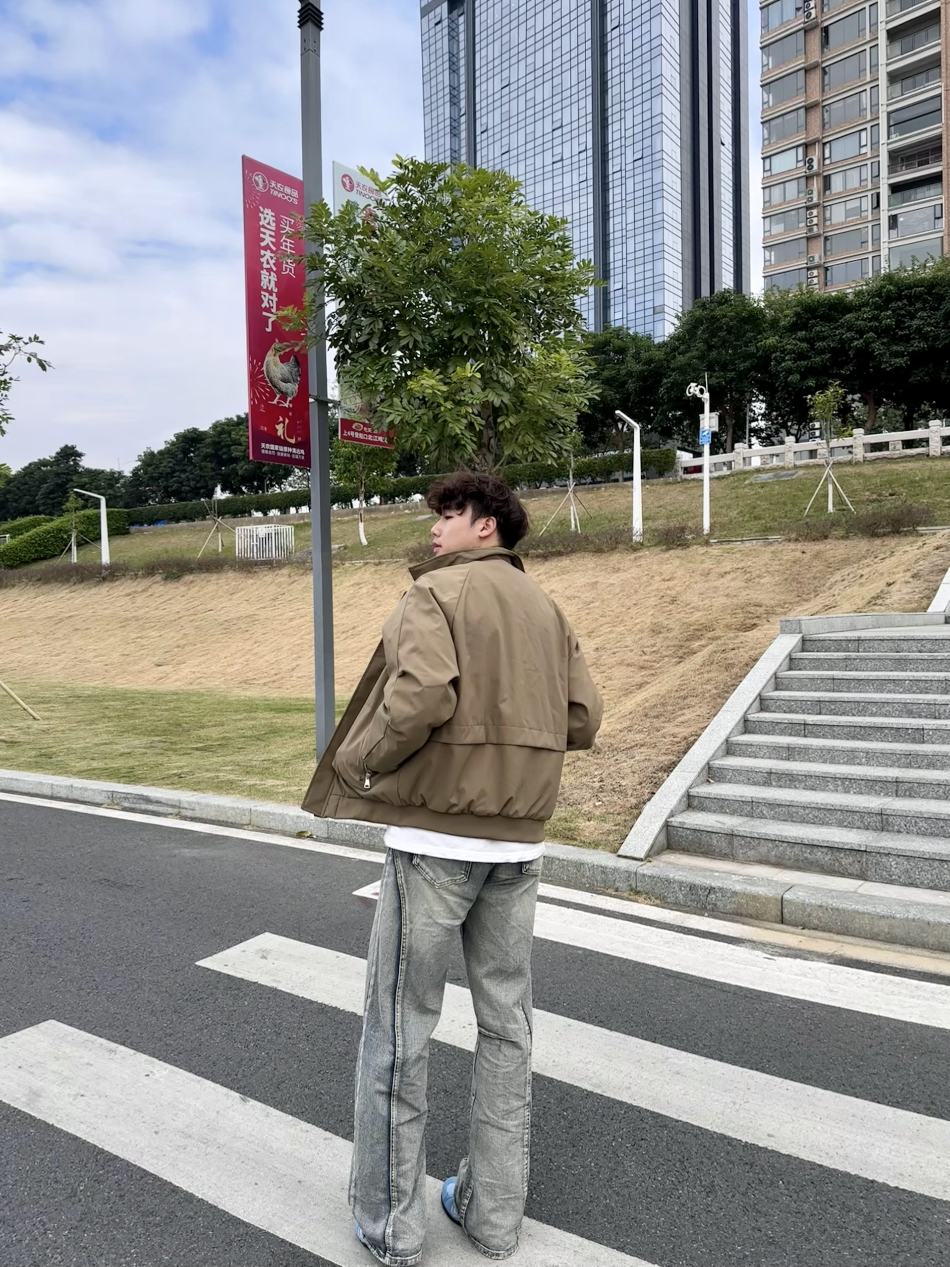 今天搭的这套走街头风,卡其色外套配白T打底,简单又有层次感。浅蓝牛仔裤的阔腿版型很藏肉,和外套的宽松感呼应上了。最后踩双蓝鞋提个亮点,整体就是不用费脑的搭配,出门溜达穿着也舒服。