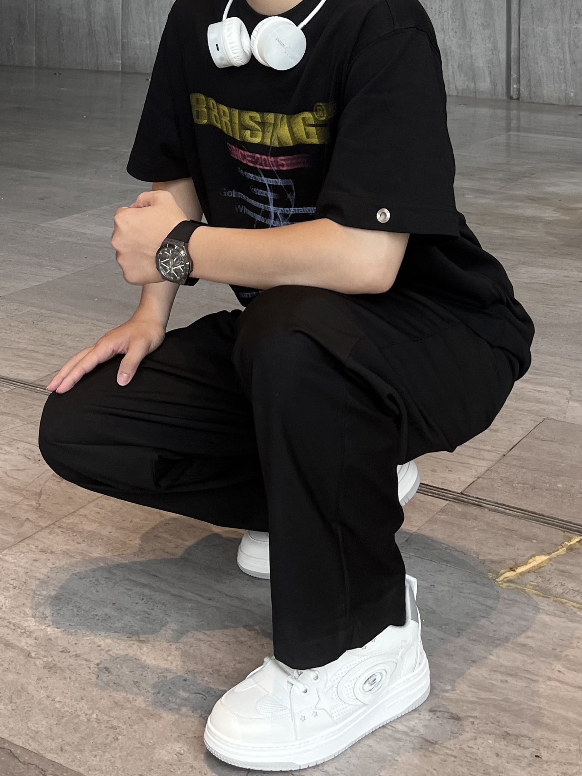 黑白灰干净的基础色最容易搭配✔️ 今天是一身黑色系穿搭分享👋🏻 一件简单的黑色T恤➕休闲西裤 上繁下简的搭配既不会单调还很高级 鞋子可以作为我们的点睛之笔📝 今天上脚的是 马克华菲 芬达板鞋 白色极简风适合日常通勤出门搭配 上脚好舒服而且颜值好好看干净清爽
