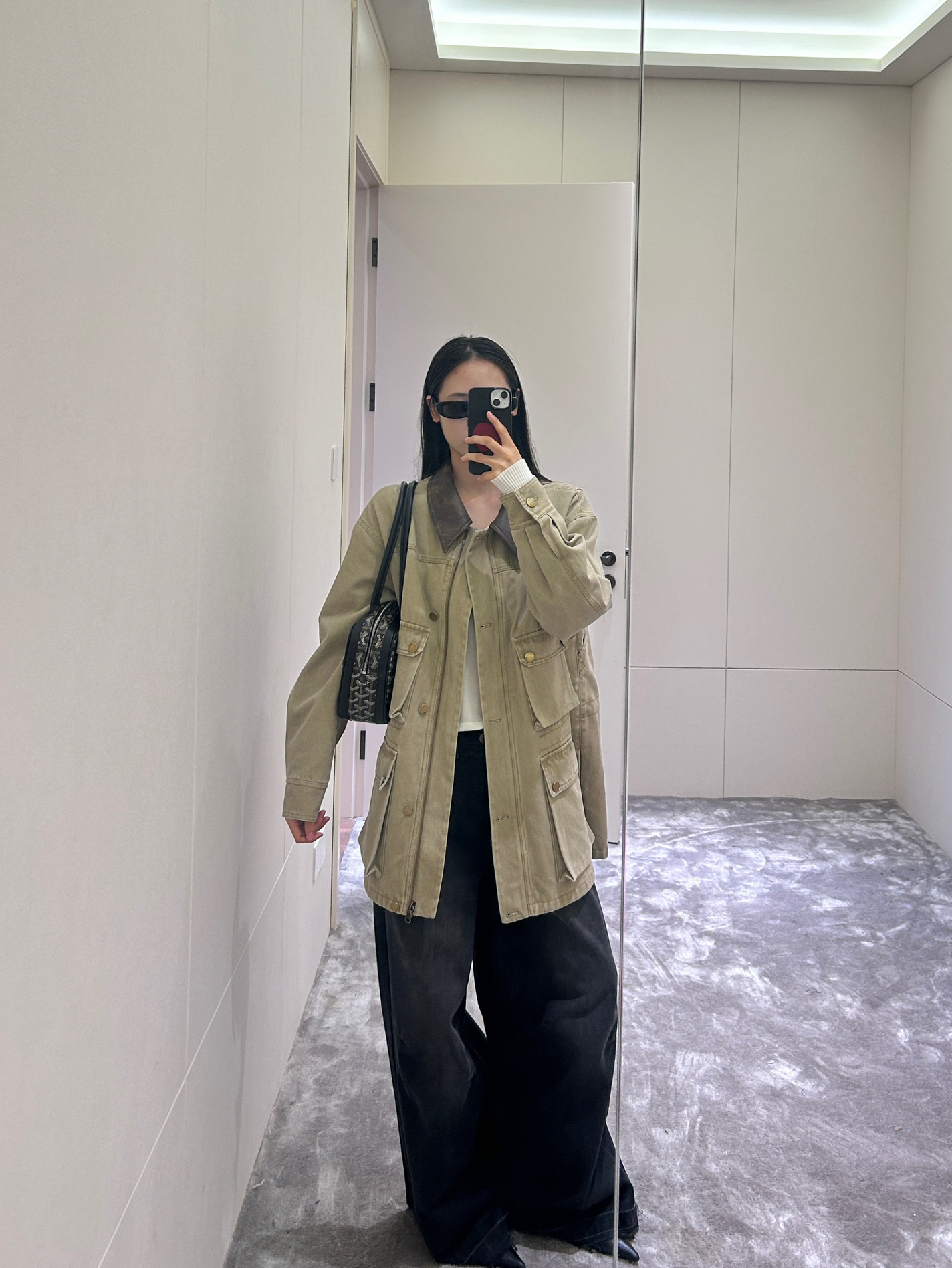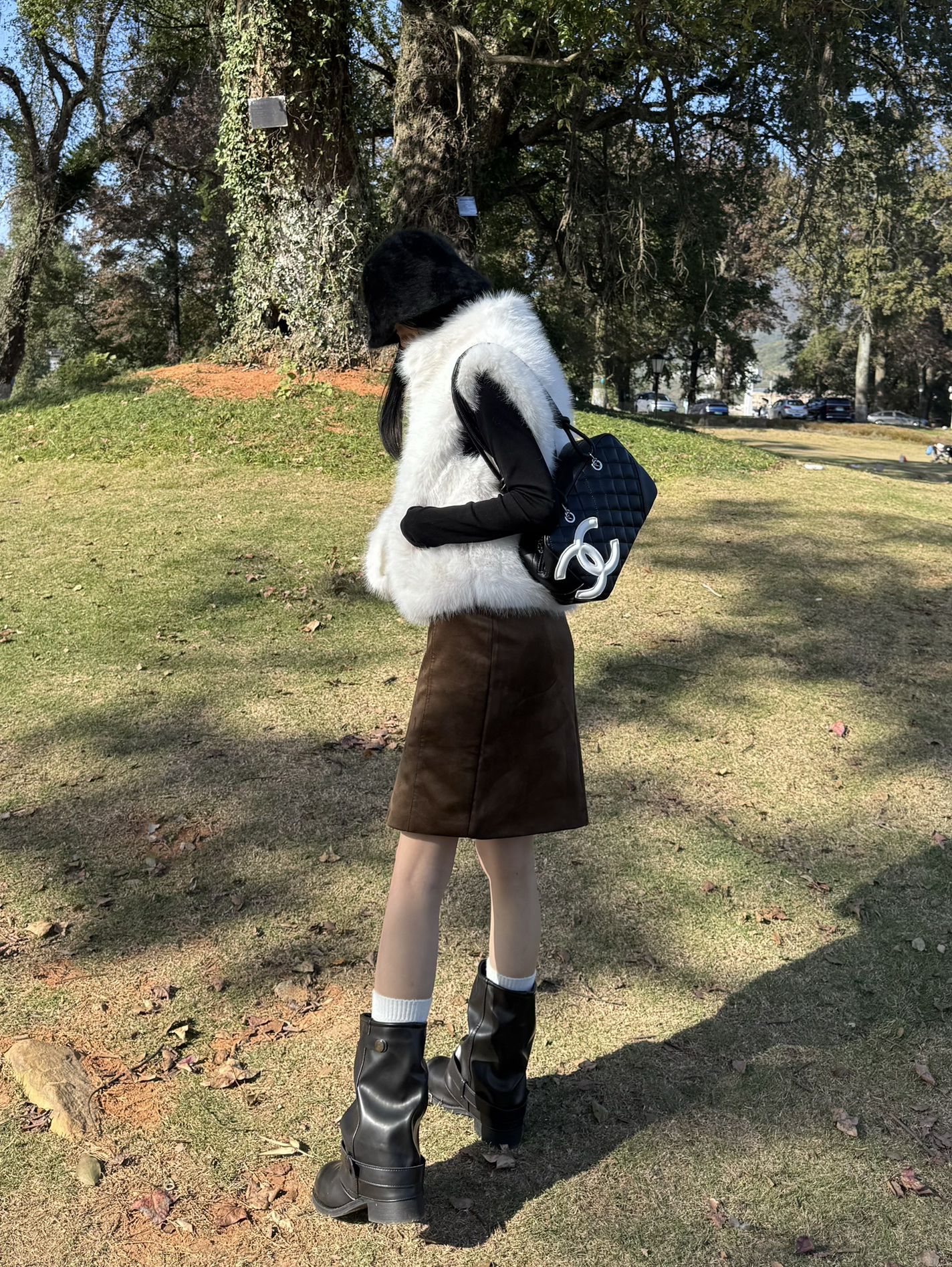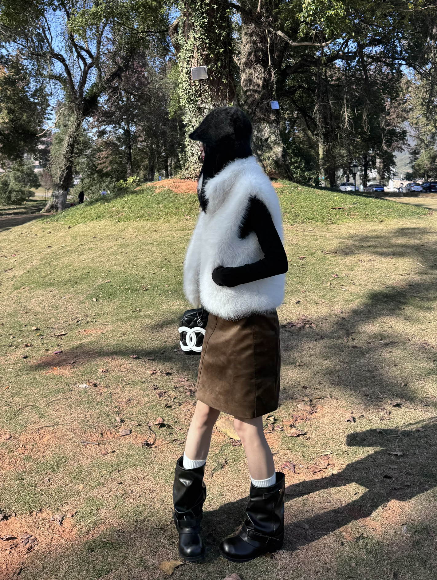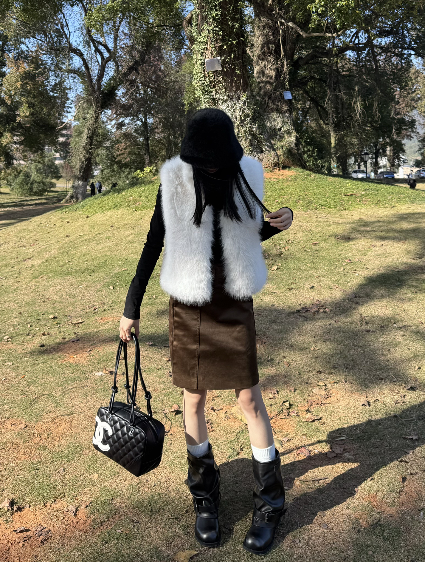 白狐毛马甲像裹了件软乎乎的雪团,往黑长袖外一搭,冷调里瞬间掺了甜;配棕褐皮裙收住松弛,黑靴+白袜戳中复古细节,黑包顺着暗调走。往草地一站,阳光裹着毛绒质感,是“逛公园都像在拍秋冬画报”的打扮~