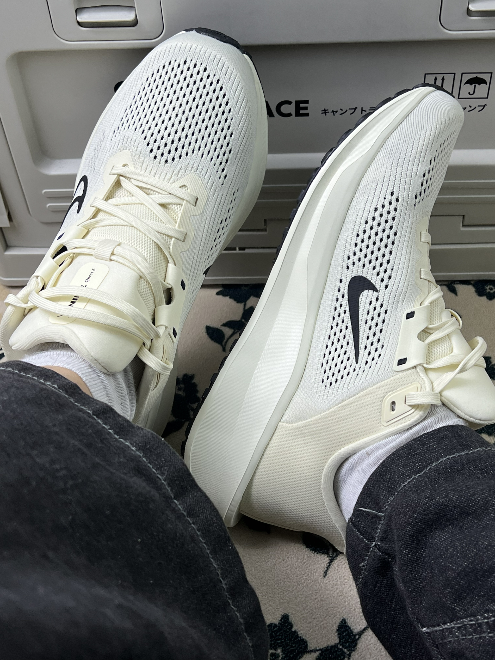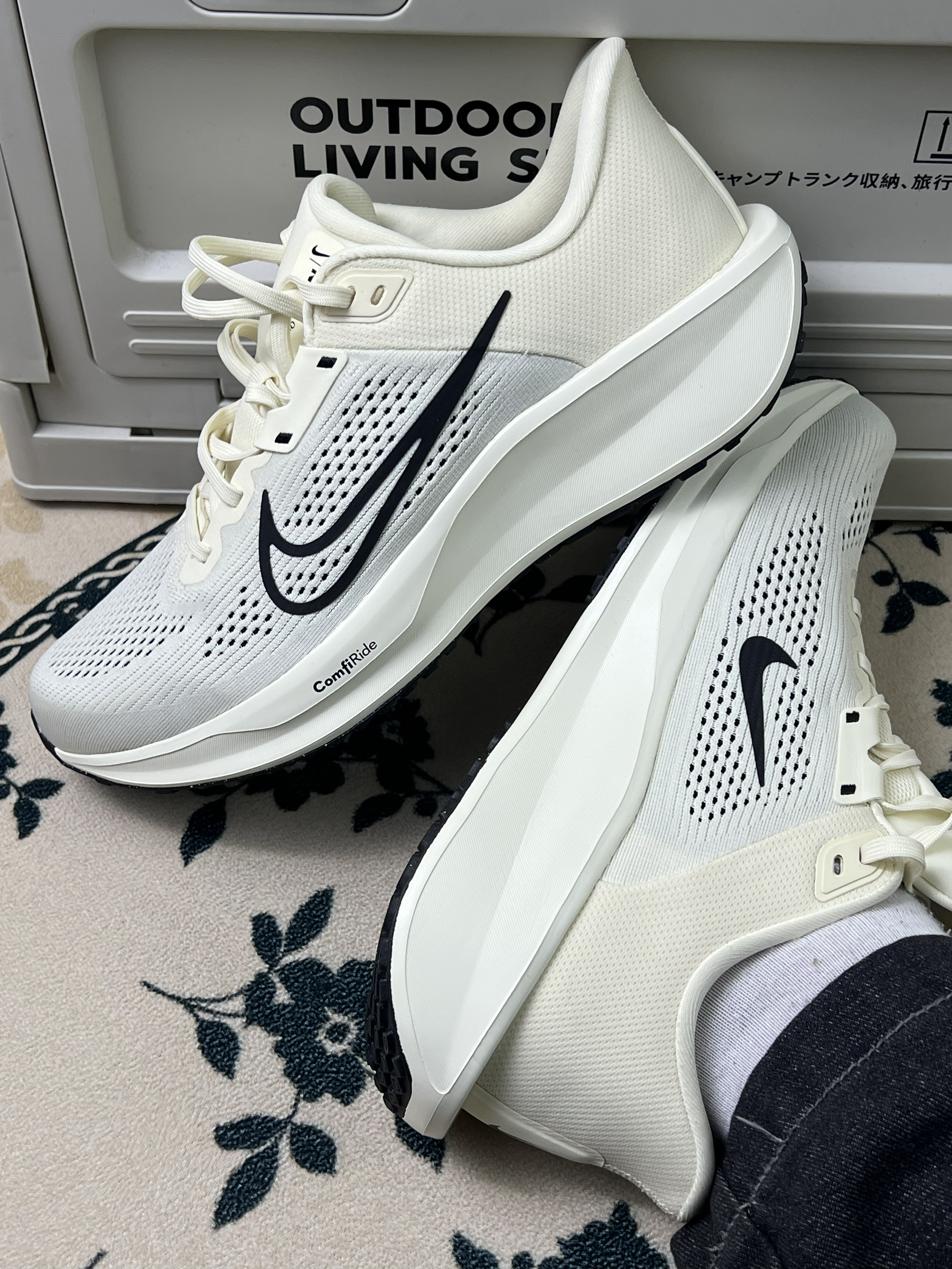 这双在露营箱上拍了好久的白灰NIKE,上脚后发现它舒服得刚好。 小优点⚡️ 网面确实透气,夏天穿没闷过脚。中底软硬适中,通勤走半小时,脚底不会“抗议”✨ 最好搭的是各种浅色下装,配这条深灰牛仔裤和白袜,简单不出错。 缺点 鞋舌内侧的标签有点存在感,头几次穿建议配中筒袜。浅色网面太容易“记事儿”,在户外箱上放一会就沾灰,穿出门得更小心。包裹性属于“宽松宅”型,脚瘦的朋友可能会觉得有点空。 ...