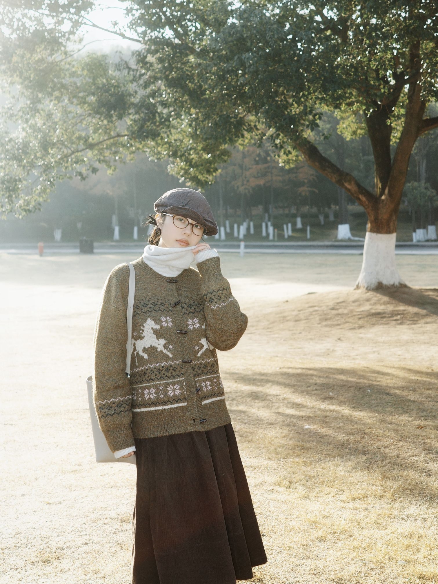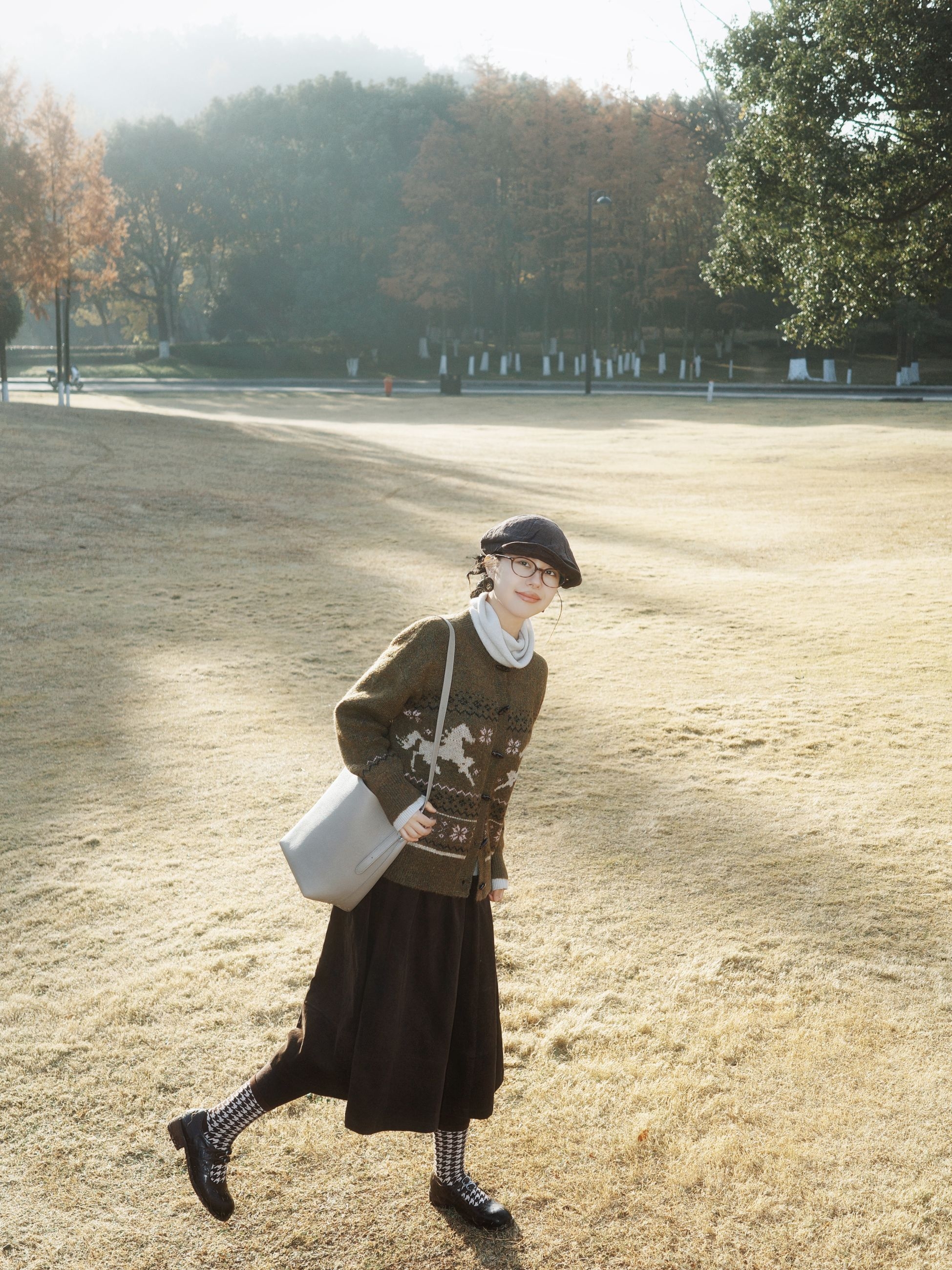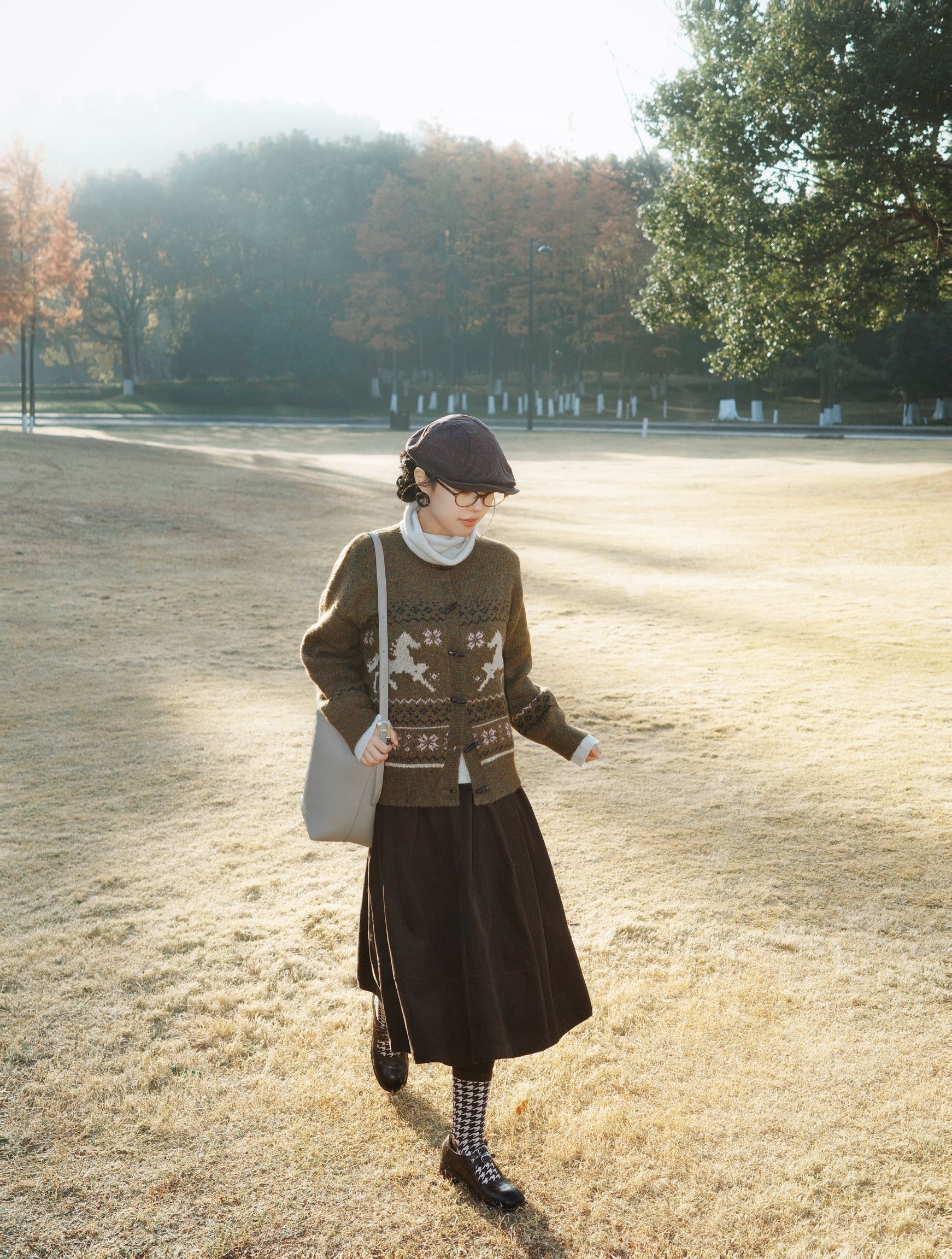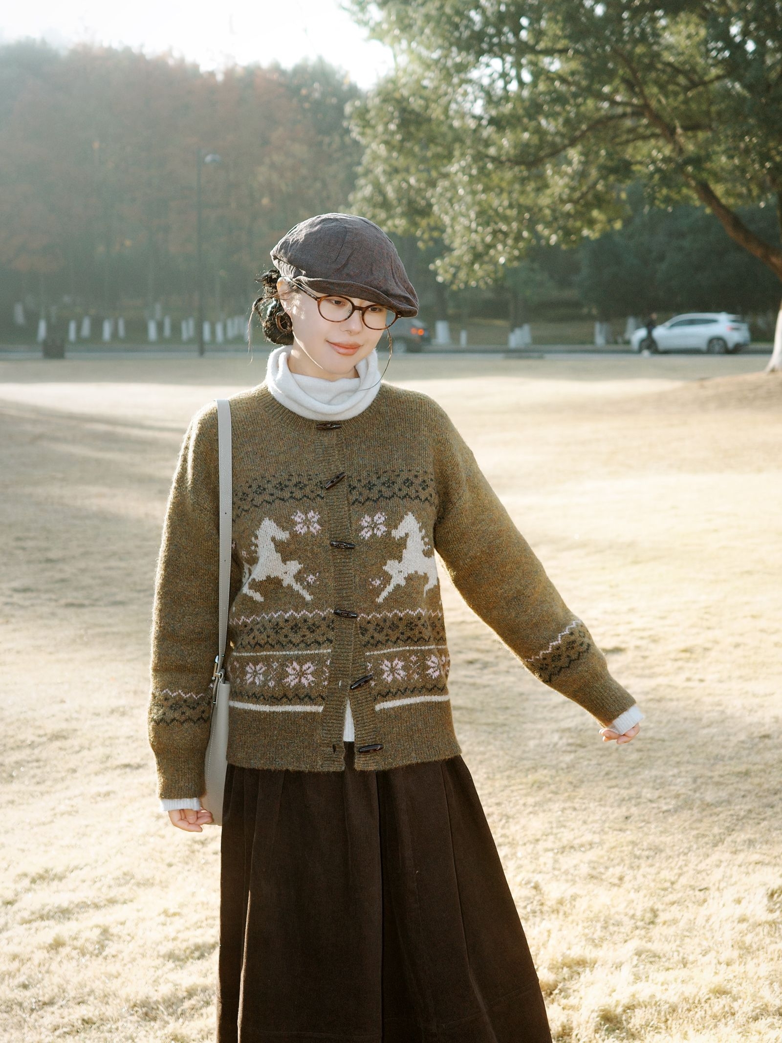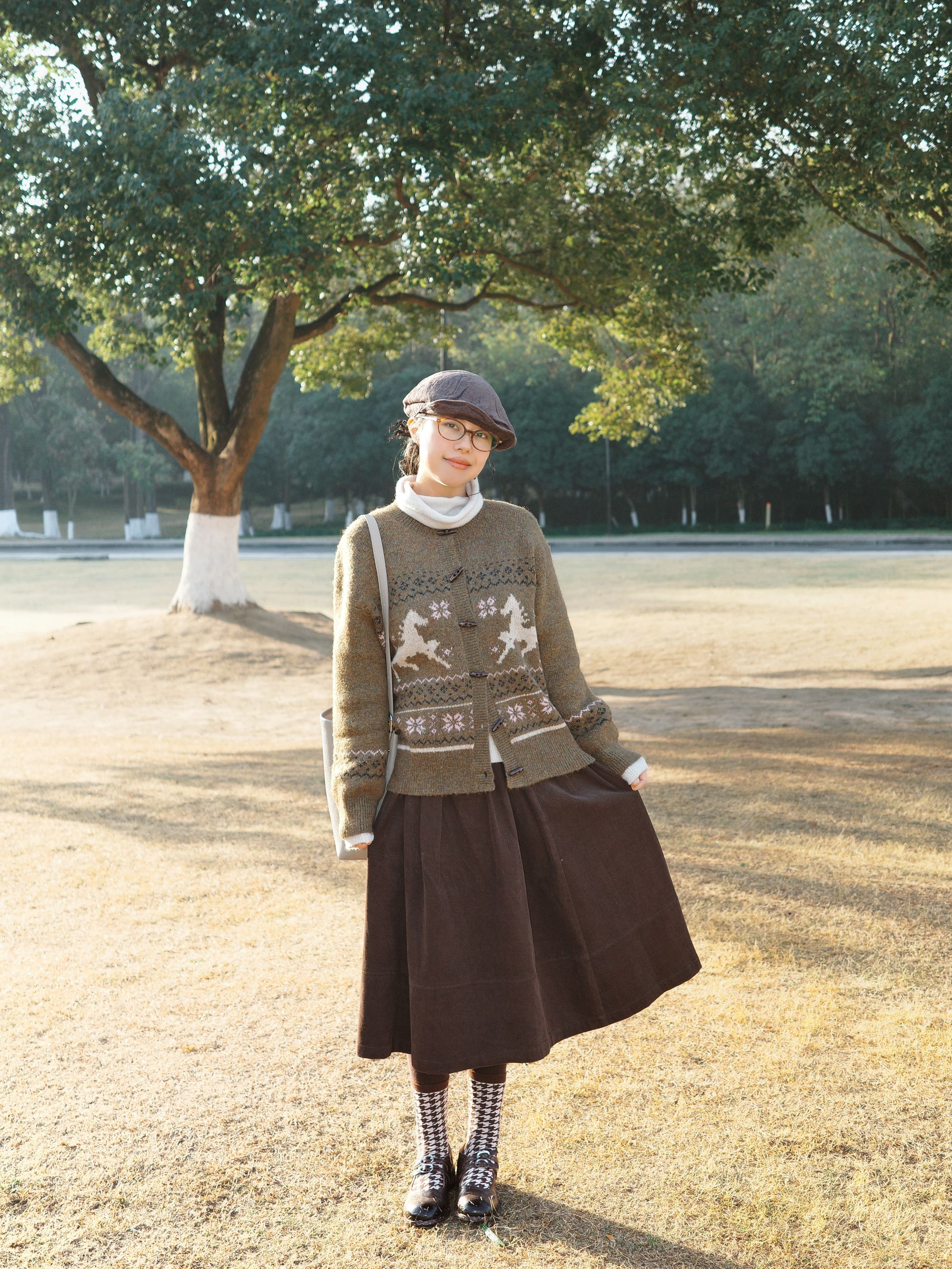 冬日公园漫步,费尔岛针织毛衣拿捏温柔氛围感。橄榄绿色提花的毛衣满是复古味道,内搭白色高领打底,清爽又有层次~ 深棕色半身裙垂坠感刚好,配上黑白格纹袜子和黑色小皮鞋,再搭上报童帽和浅灰色单肩包,咖棕系的搭配在冬日里太协调了,复古风穿起来温柔又雅致~