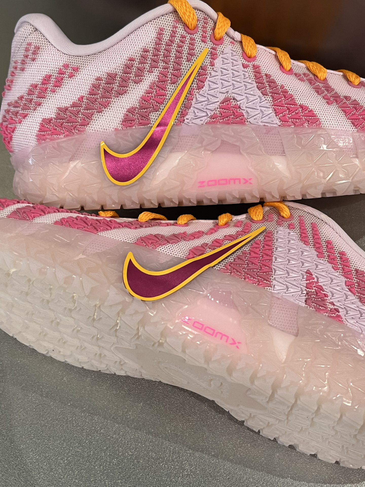 今年Ja3的调色盘真的很会,粉橙组合的新配色,很有情人节的感觉,但据说灵感其实是莫兰特喜欢的零食——软糖 整双鞋用深浅不同的粉色涂抹,侧面的Swoosh、后跟的熊爪,以及个人图案一个不少 实物比图片更有层次,不是那种单一的甜腻粉,这种“猛男粉”,兄弟们敢上脚驾驭吗⁉️ #新鞋零时差 #球鞋坦白局 #学生党打球穿什么 #谁还没双粉色耐克呢 #NikeJa3莫兰特3