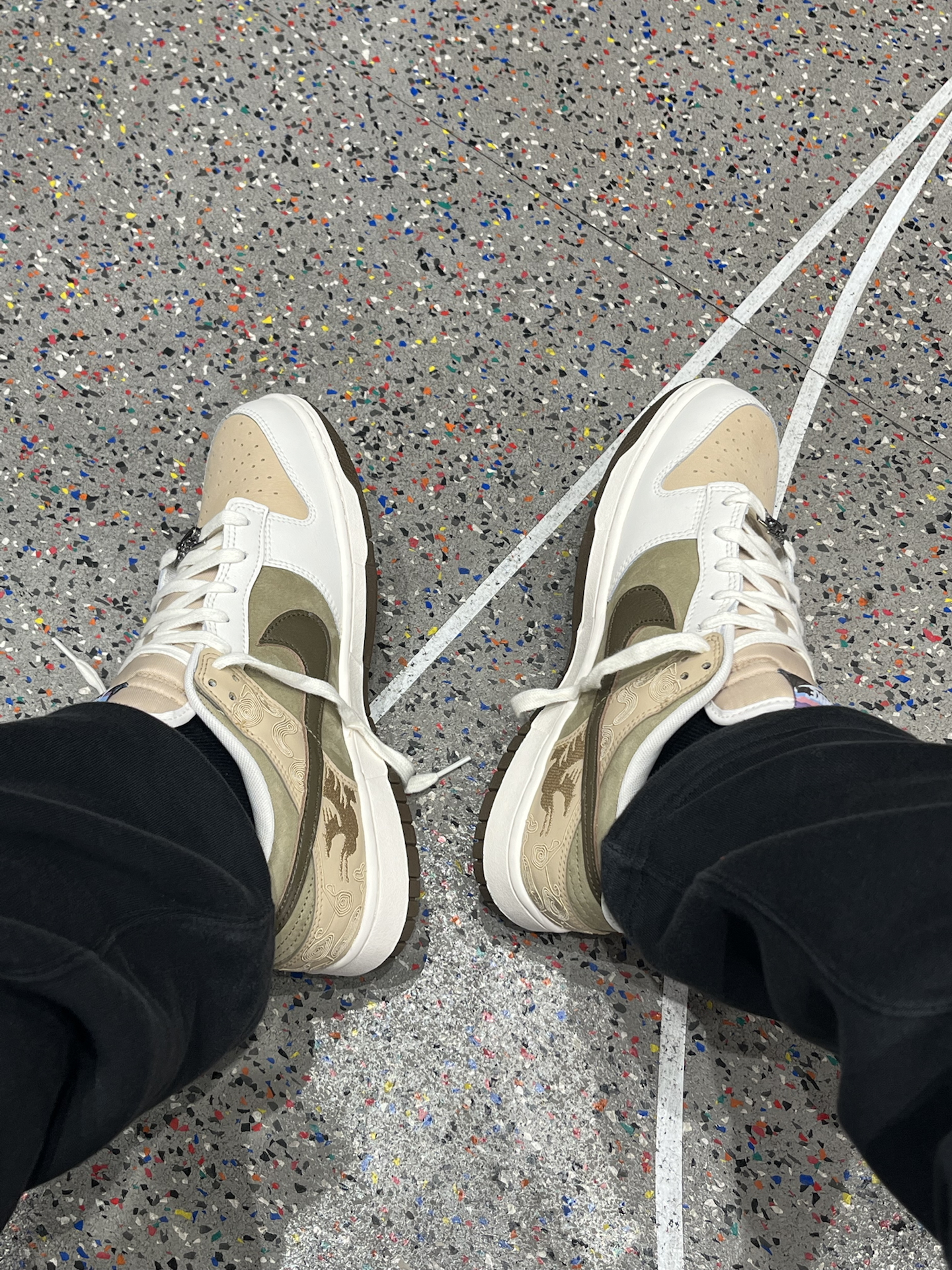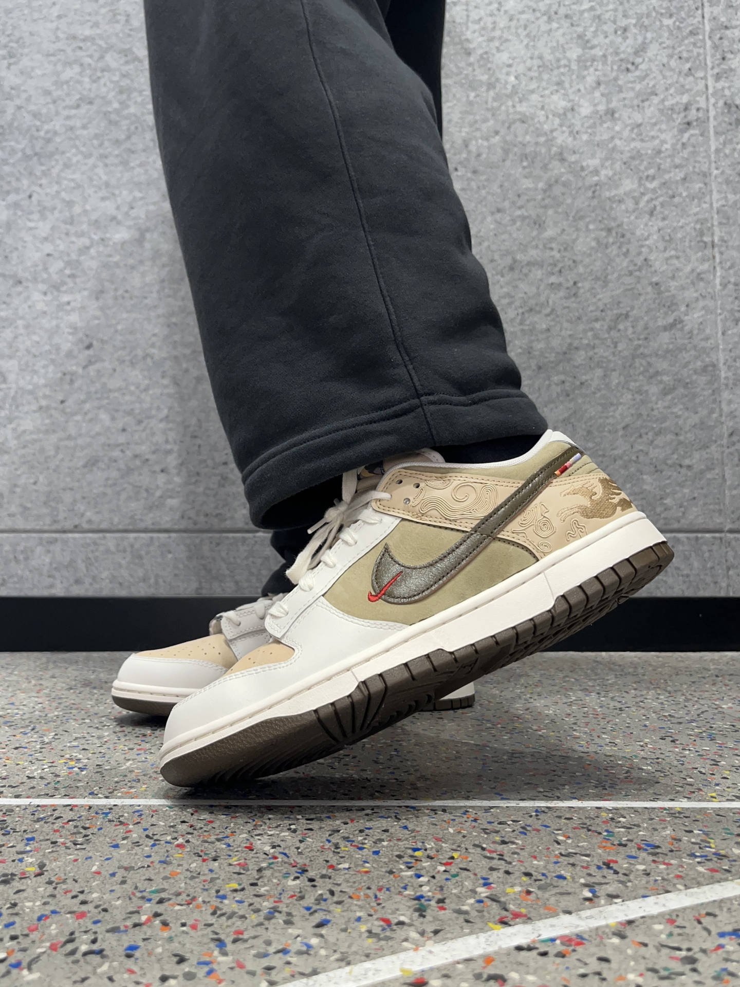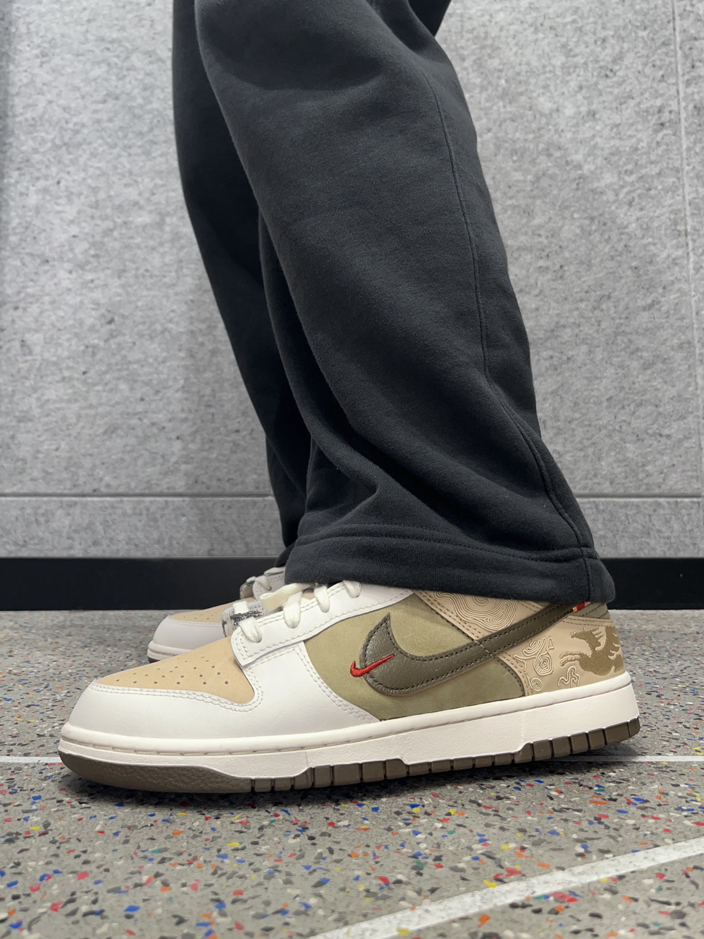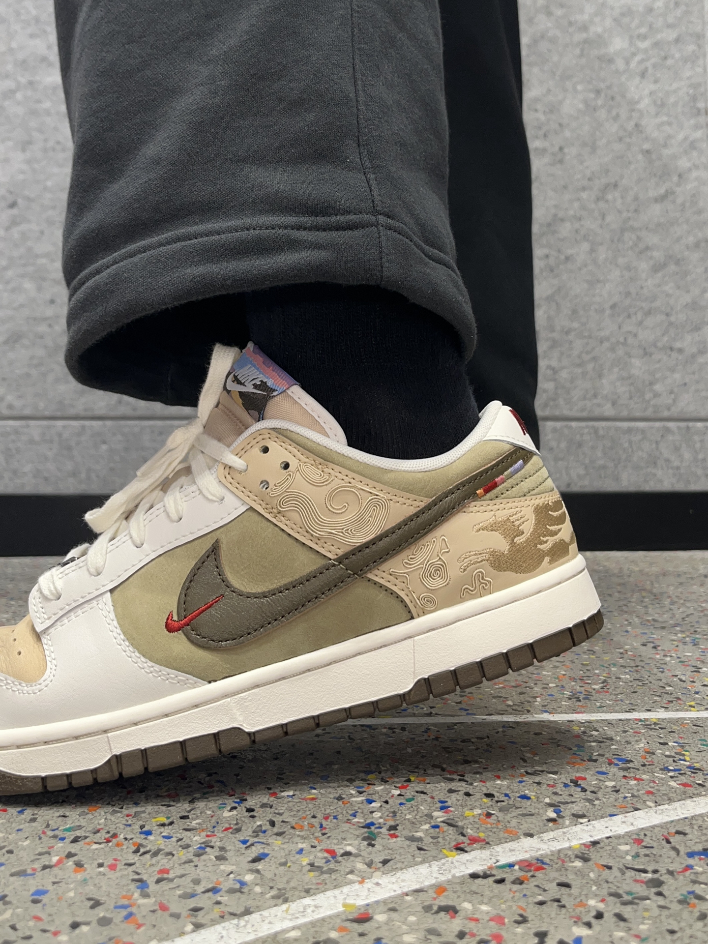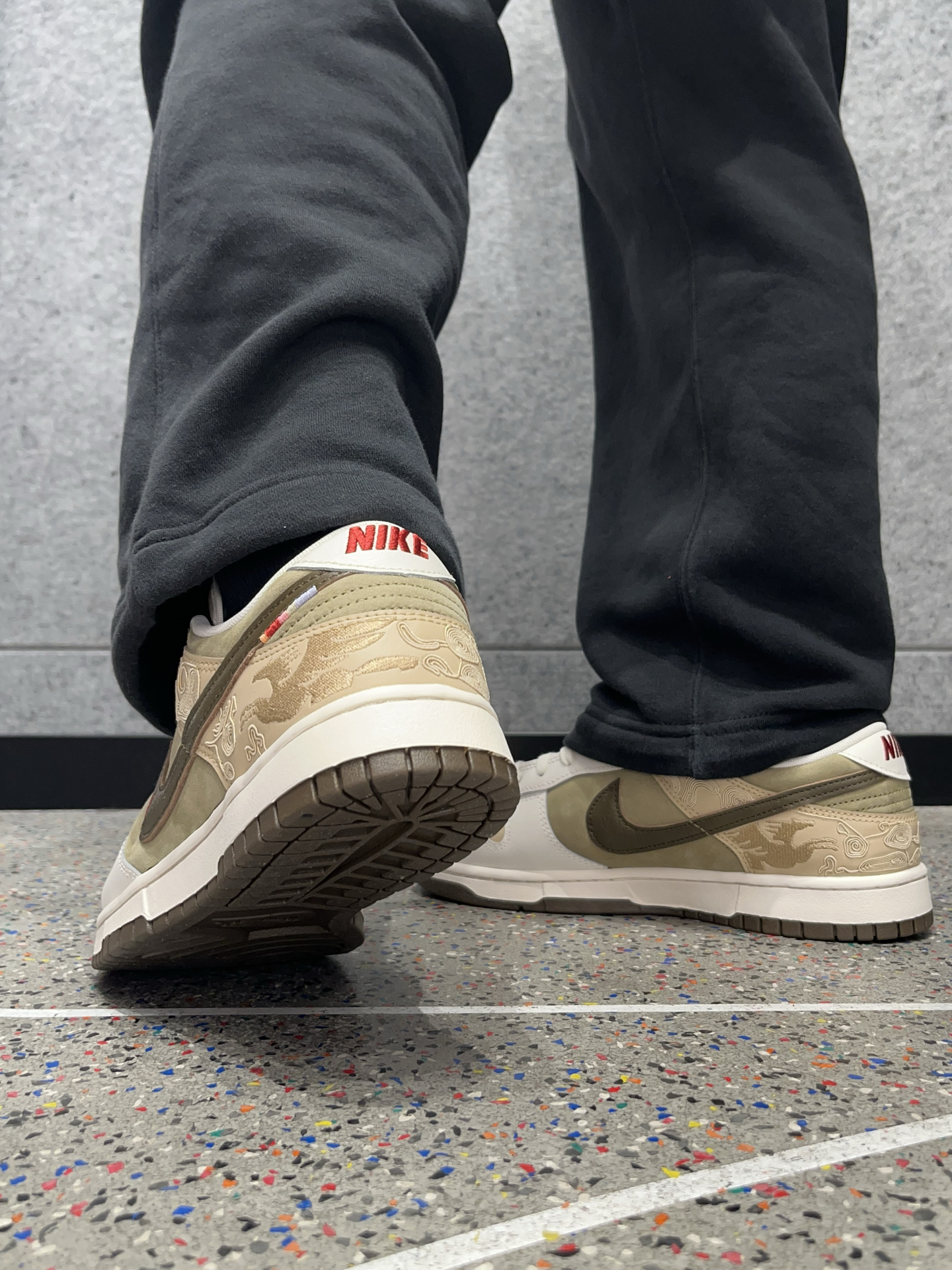印象里蛇年Dunk才过去没多久,马年CNY就来啦,实物到手,赶紧上脚蛮帅的⁉️ 米棕➕橄榄绿的色调很复古,而且吸引我的则是新年的细节,满载好的寓意~ 侧面环绕的祥云刺绣、带翅膀的飞马鞋带扣,鞋垫上都是奔腾的飞马… 2.5厘米左右厚度,上脚还是有显高的,搭配直筒牛仔裤或灰色卫裤,应该都会很出片~ #马年限定好鞋 #马年本命年送礼 #马年定制鞋 #低头拍双鞋 #元旦炸圈限定鞋
