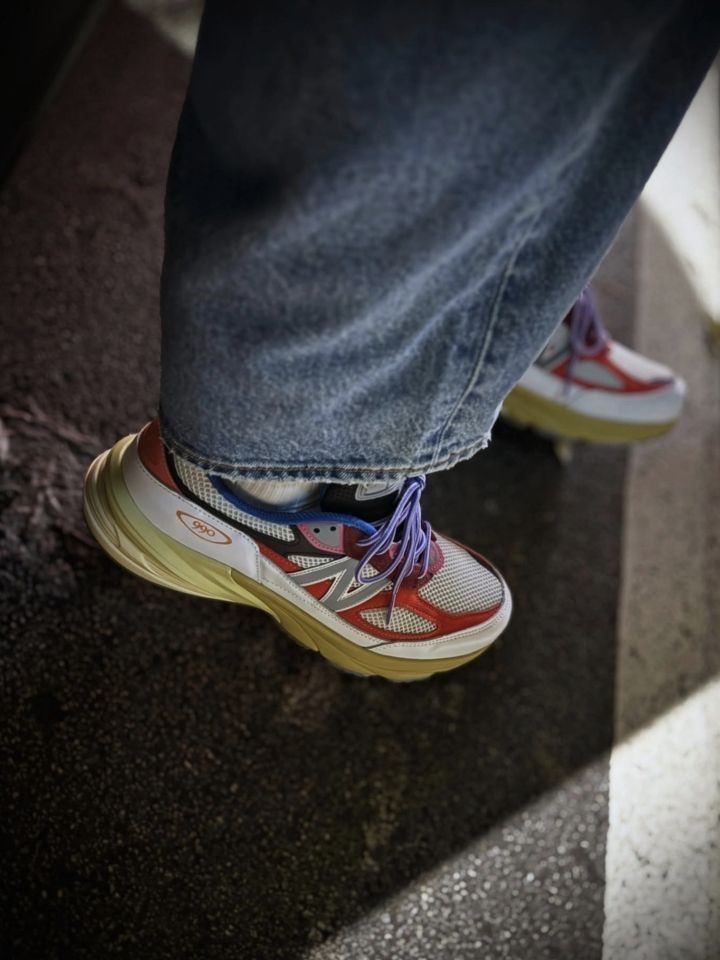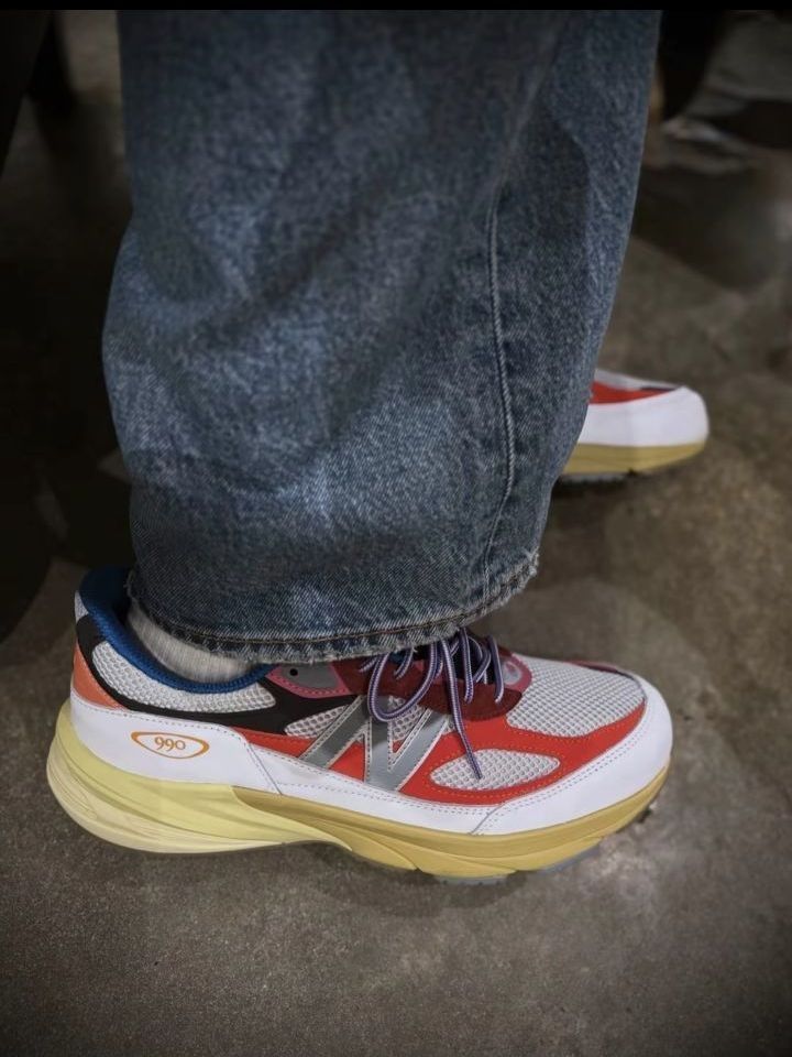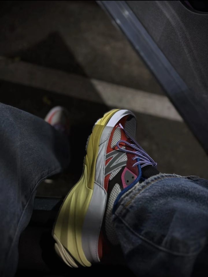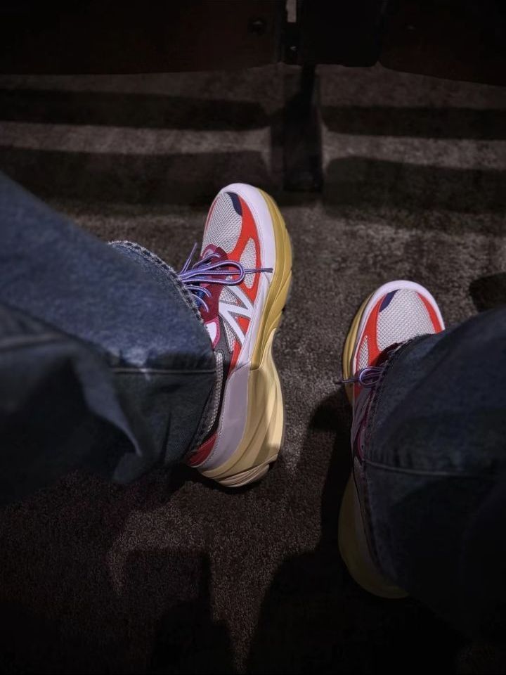 这双Action Bronson联名的NB990v6美产款,算是近期踩得最衬暗场氛围的一双。 白网面裹着红紫撞色,做旧黄底透着复古调,FuelCell中底软弹又稳,踩在影院绒面地毯上,蜷在座位里都觉得脚感舒服。 搭的是深色牛仔,裤脚随意堆在鞋帮,影院暗光里鞋身的撞色刚好跳脱又不刺眼,不用刻意摆姿势,那种懒悠悠的休闲松弛感就漫出来了