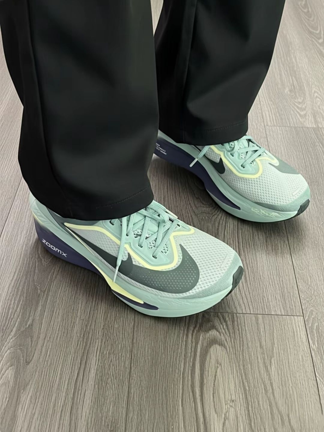 跑了几天,总结优缺点如下: 1. 优点 脚感+推进力:ZoomX泡棉+全掌碳板,软弹缓震同时有明显弹射感,脚感挺澎湃的😊 轻量透气:单只仅约265克,双层网眼鞋面,透气性还是可以的👌 颜值:配色清新高级😍,我这双好像叫松石绿,也能兼顾日常穿搭👔 2. 缺点 脚型局限:前掌偏窄,宽脚需选大半码,否则易挤脚🦶 足弓问题:中底较高,足弓支撑偏弱,疲劳后易酸痛