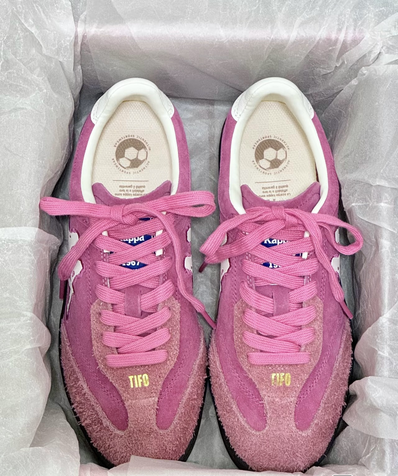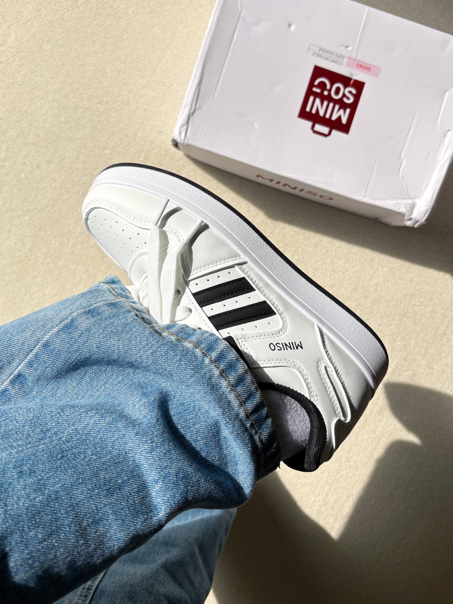终于买了心心念念的鞋子啦 打开的一瞬间被质感和细节感动到了! 麂皮的T字头和鞋身有光泽感的细腻皮料,烫金的徽标和字,黑白金配色,整体的精致细节质感满满,上脚舒适柔软无需磨合期,可以适配各种裤子