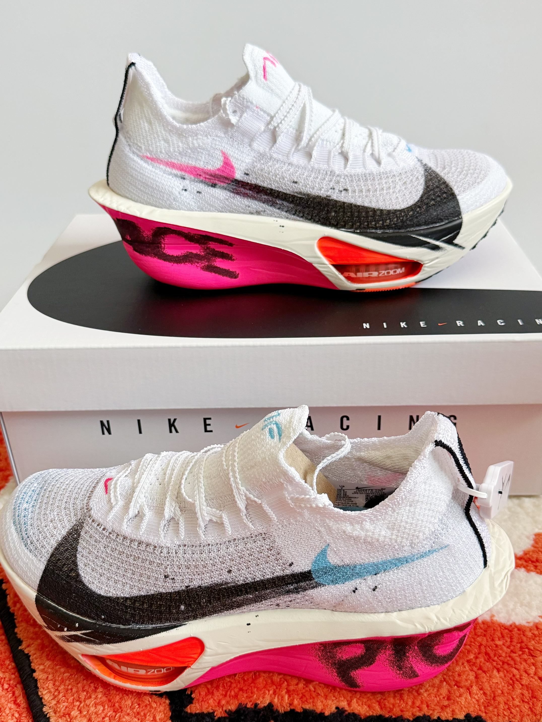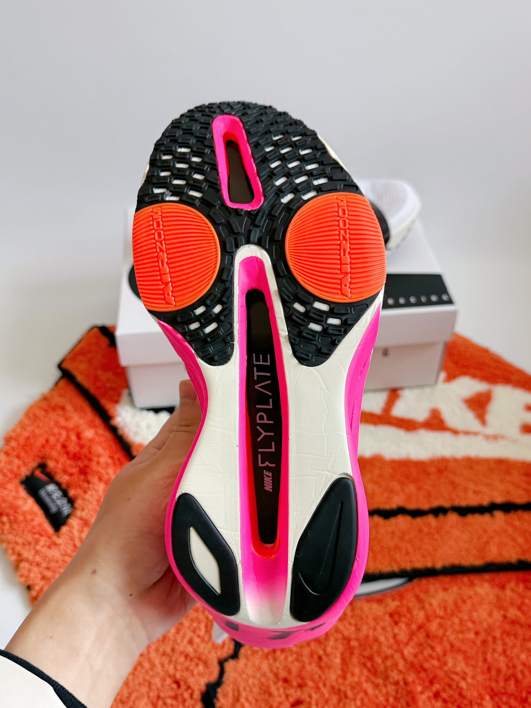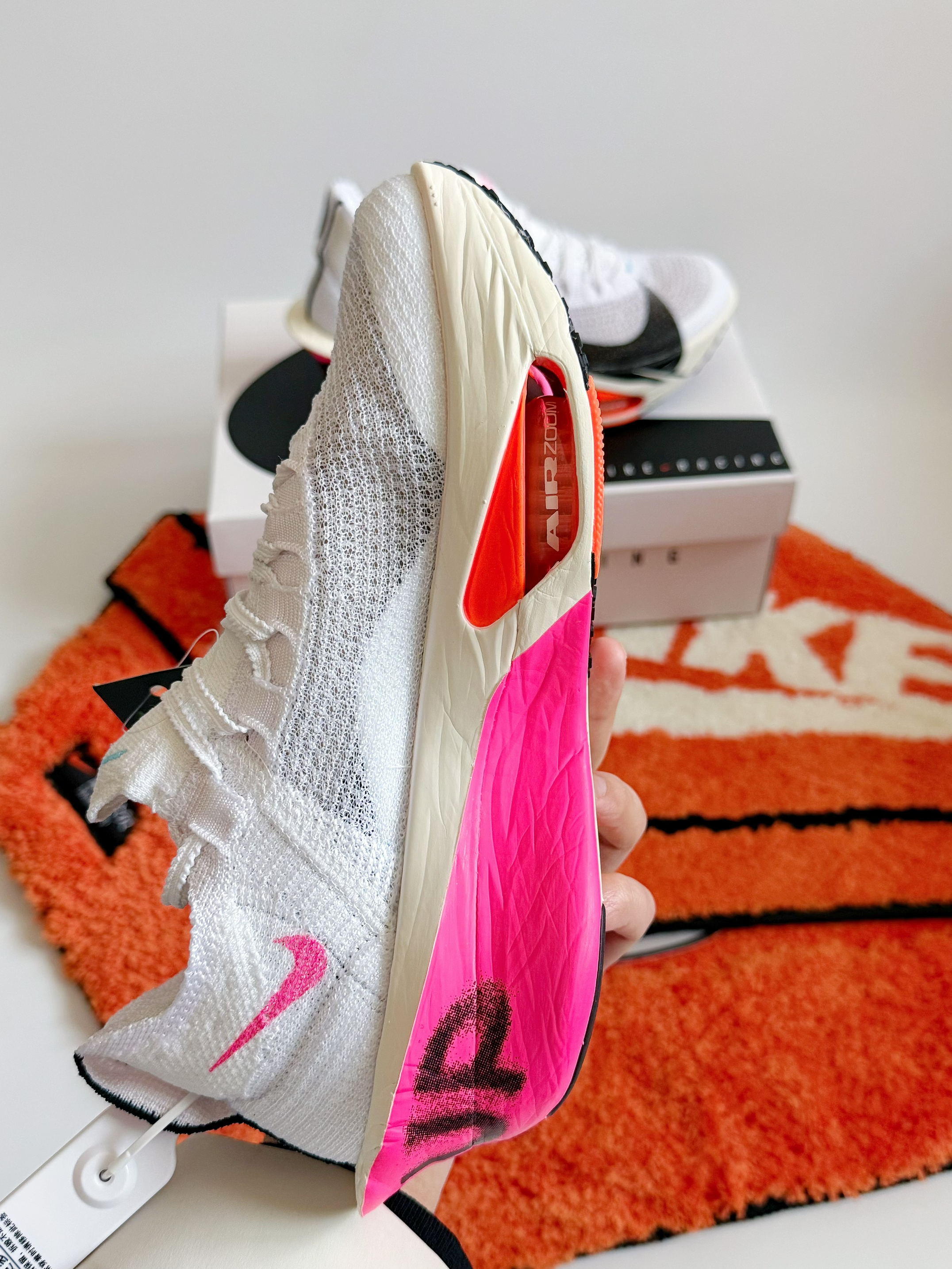 🌈 我的第一双顶缓跑鞋了也算是——Nike AlphaFly3 上马限定配色 这个👆🏻配色真的我觉得是AlphaFly3颜值里面比较能打的一双了 左右不对称的鸳鸯配色整体来说真的很好看 粉中底后跟 以及后跟的字母印花 设计感满满 这也是唯一一个双钩设计的AlphaFly3 这个让我还是最喜欢的一个点 果然 男孩子总是容易被不经意的小点给吸引到 怎么样❓ 有没有喜欢上这个配色