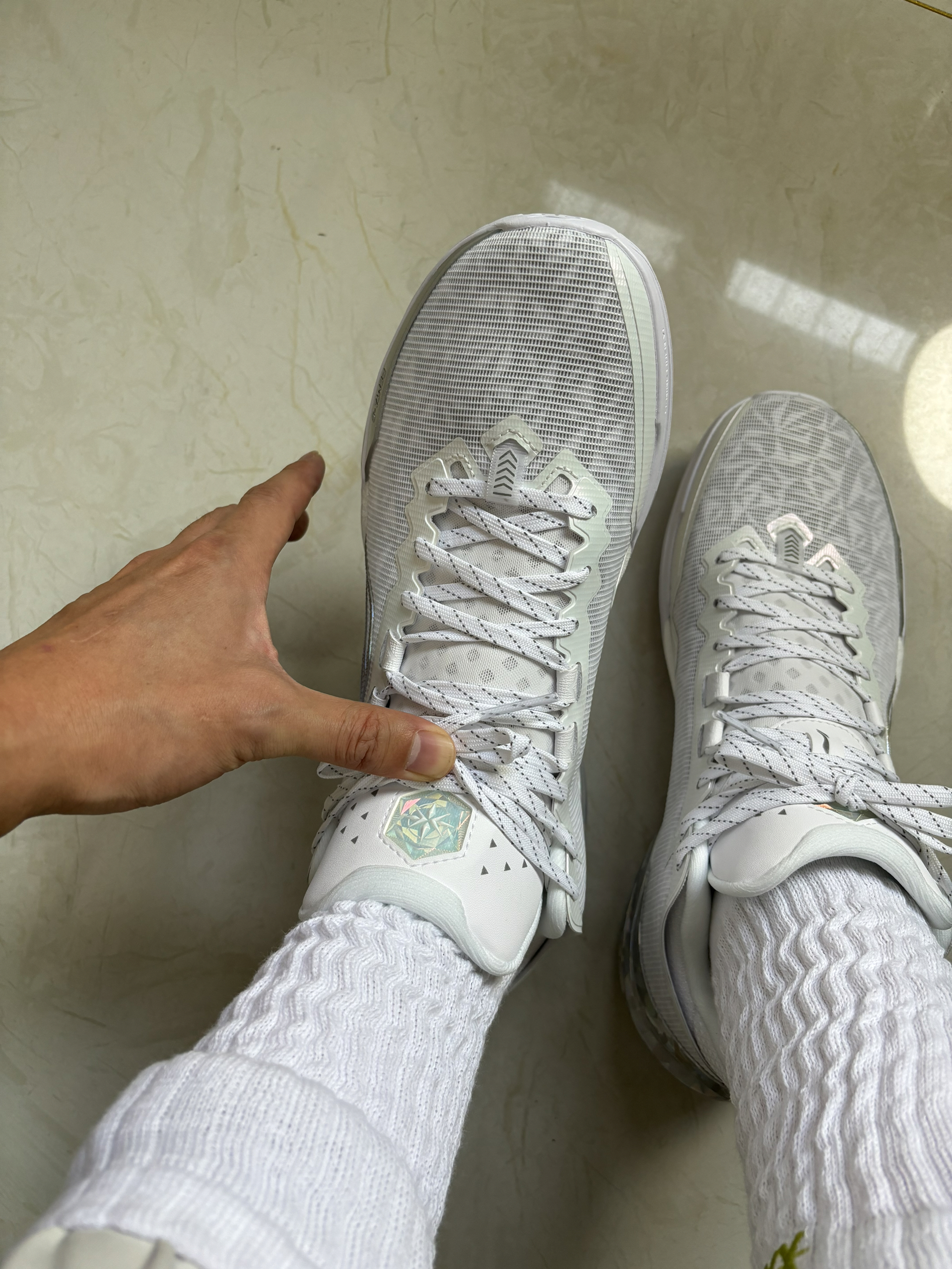 硬核球鞋实战派 利刃6的隐藏属性被我发现了啊 闪光灯一拍就可以发现了 鞋面都是可以反光的 很帅了女生穿应该也不错啊 我很喜欢他这个后跟半包的设计 这次脚型宽容度更高宽脚也可以 脚感后掌的缓震极限更好 尺码正常选择就行