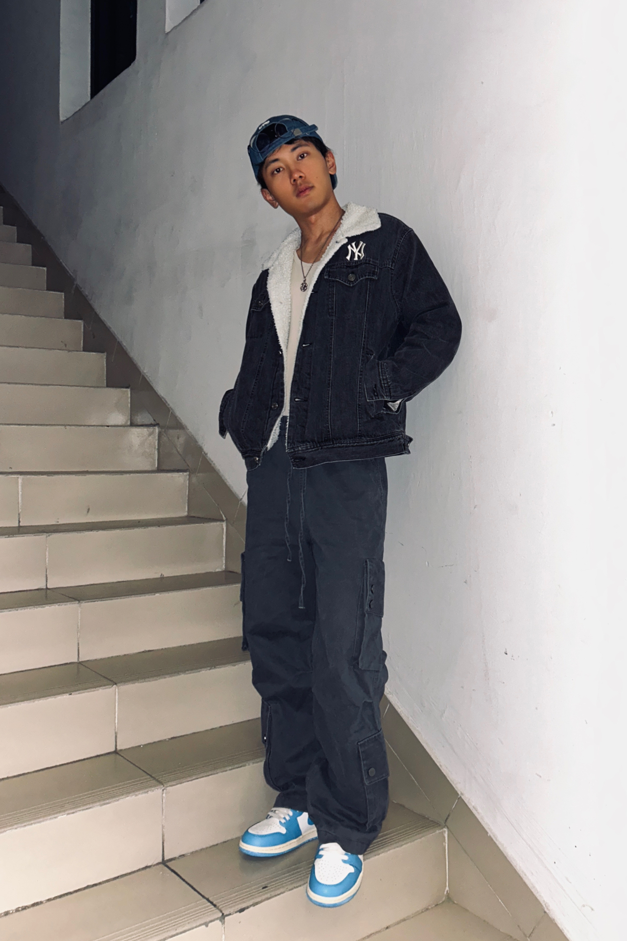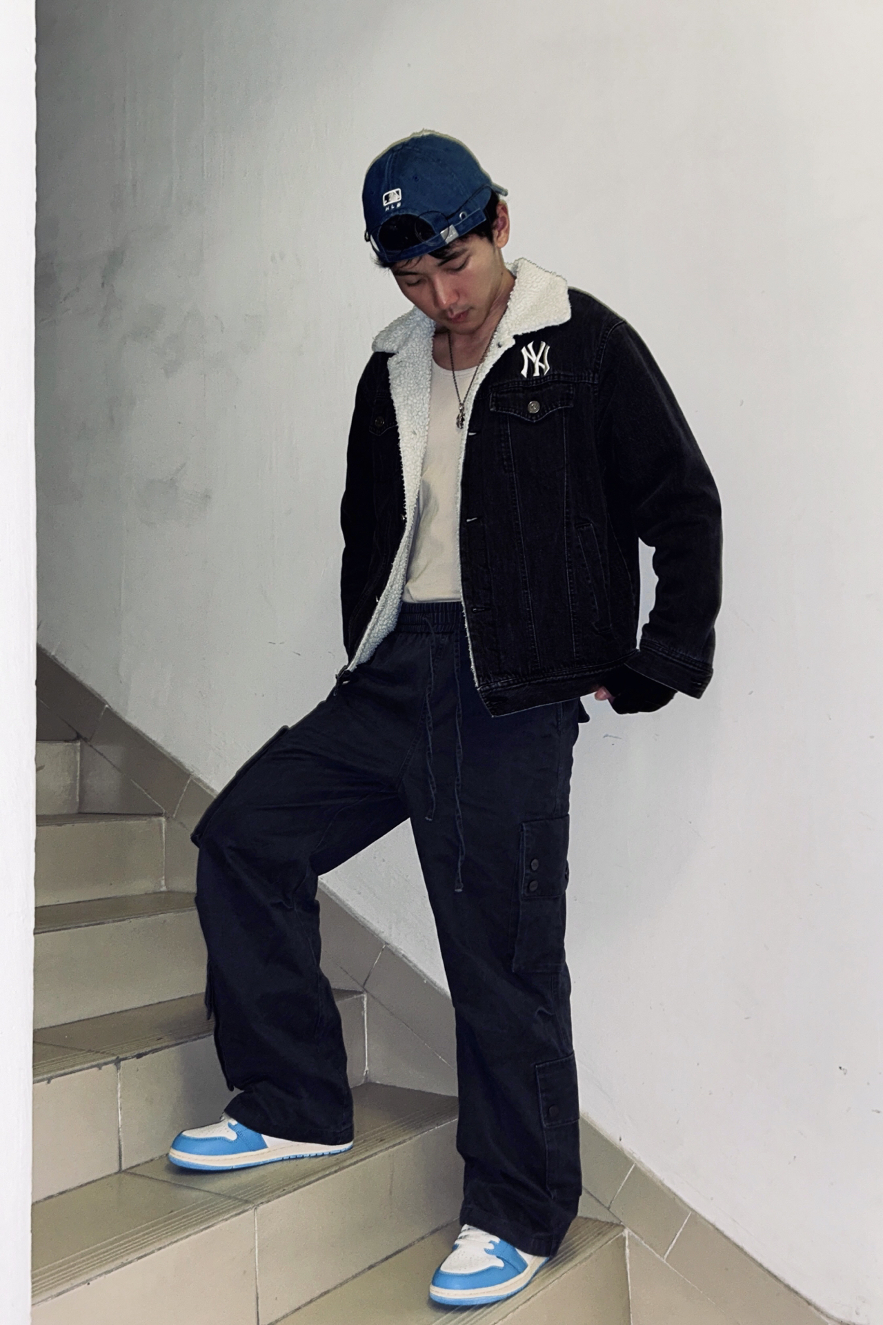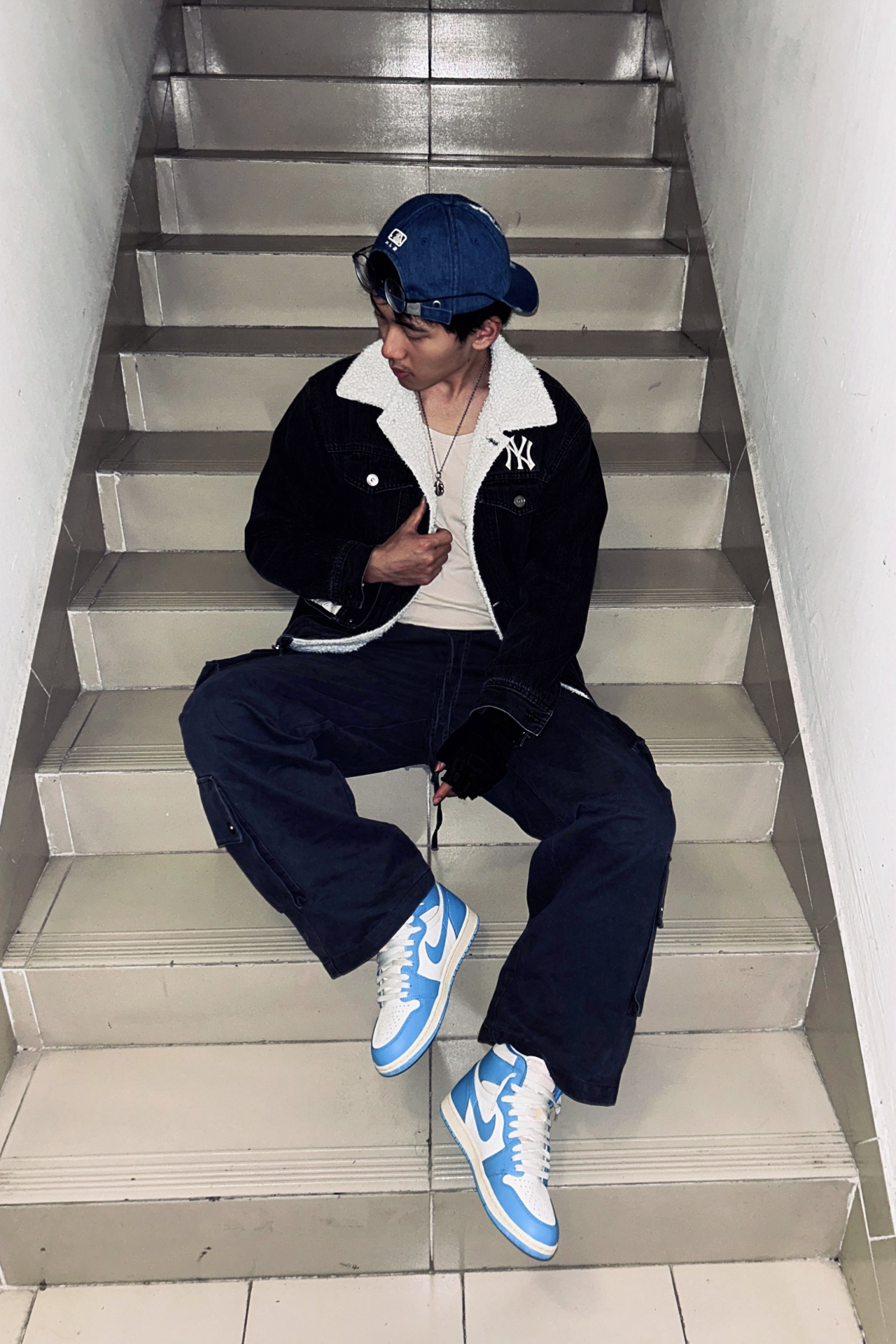 穿搭想出圈,配色和细节真的很关键~ 今天就分享一套我自己满意的出街穿搭👇 鞋子我的是 AJ1 北卡蓝,这双真的怎么穿都不会错,蓝白配色干净又带点少年感,上脚立刻把整体氛围拉清爽,回头率稳稳的✔️ 帽子是 MLB 蓝色牛仔帽🧢 颜色和北卡蓝正好呼应,材质是那种带一点复古感的丹宁,随便一戴就特别有街头味,还能顺便修饰一下头型😉 外套是一件 NY 黑色牛仔连帽夹克,黑色稳重、牛仔材质耐看,内搭随便...