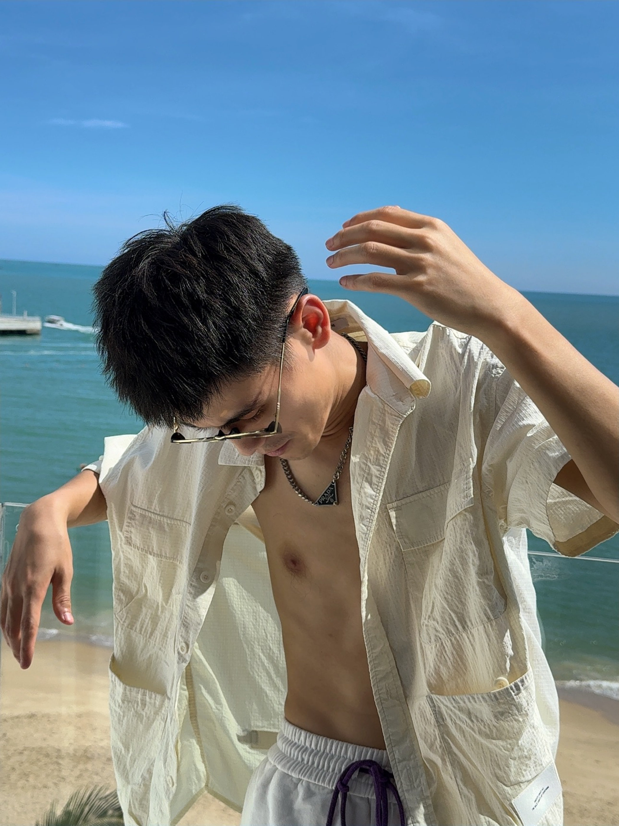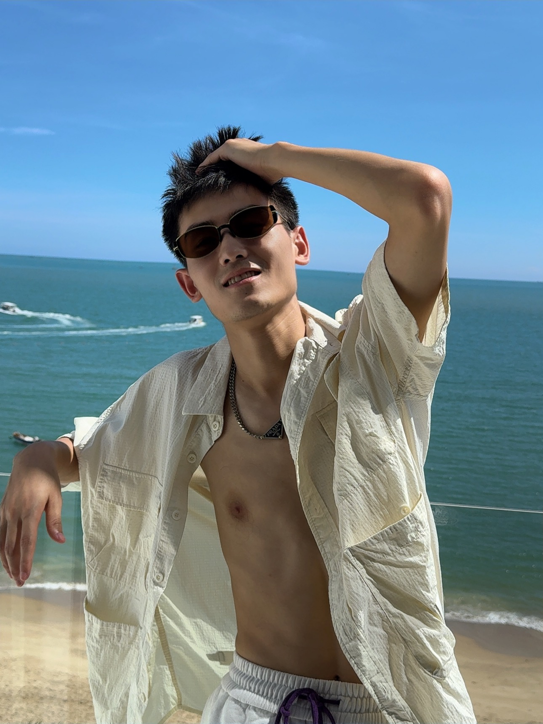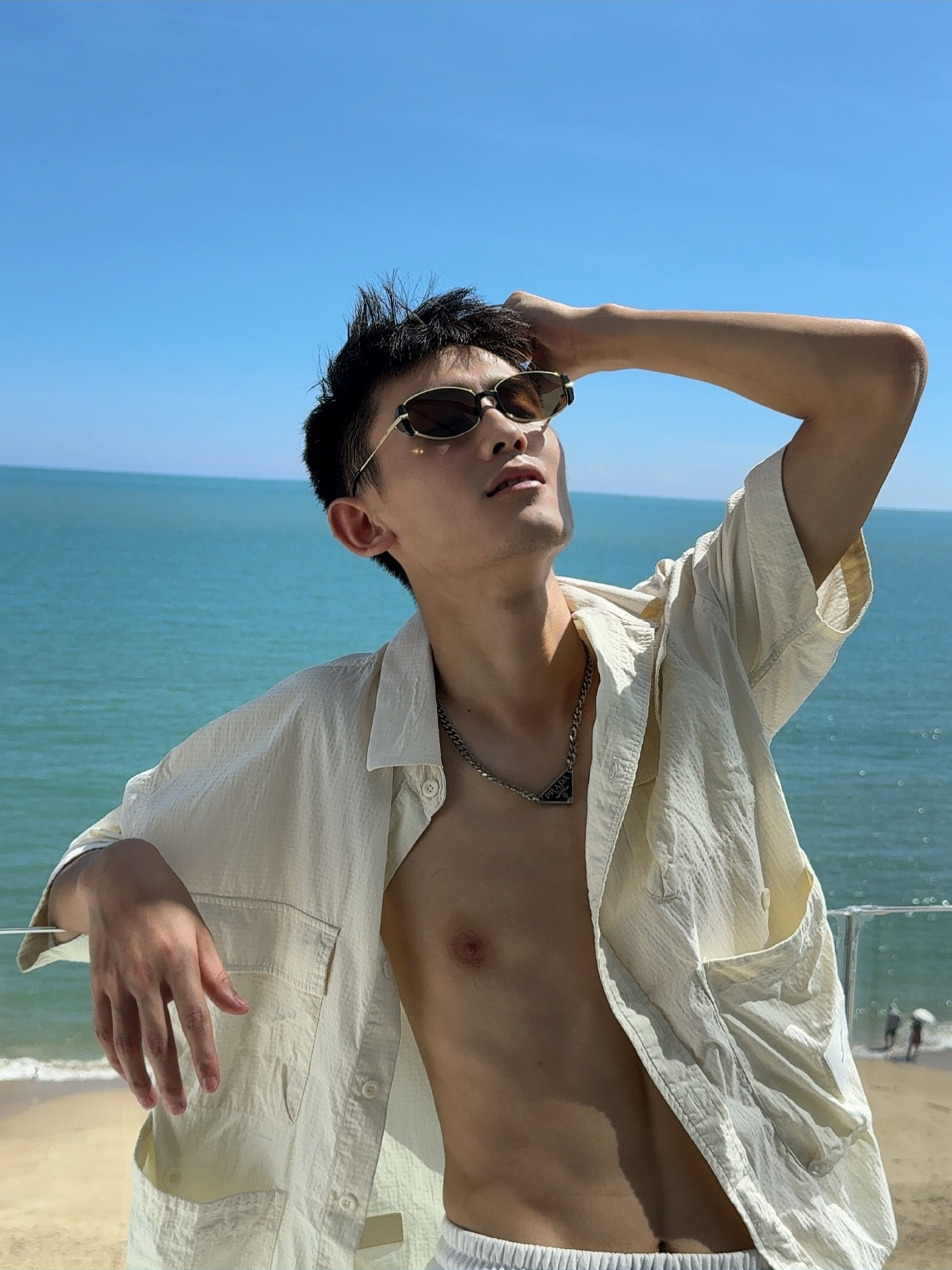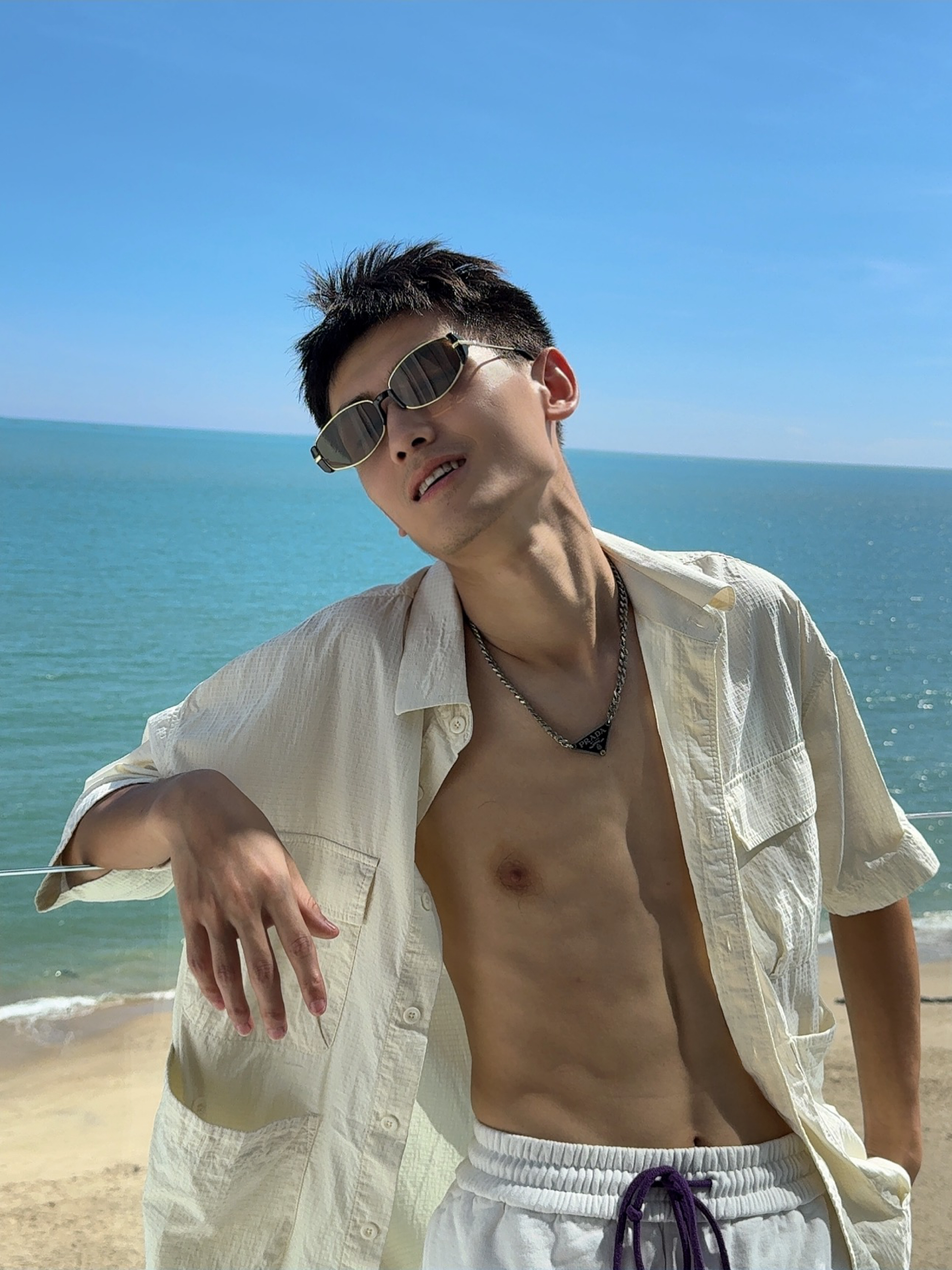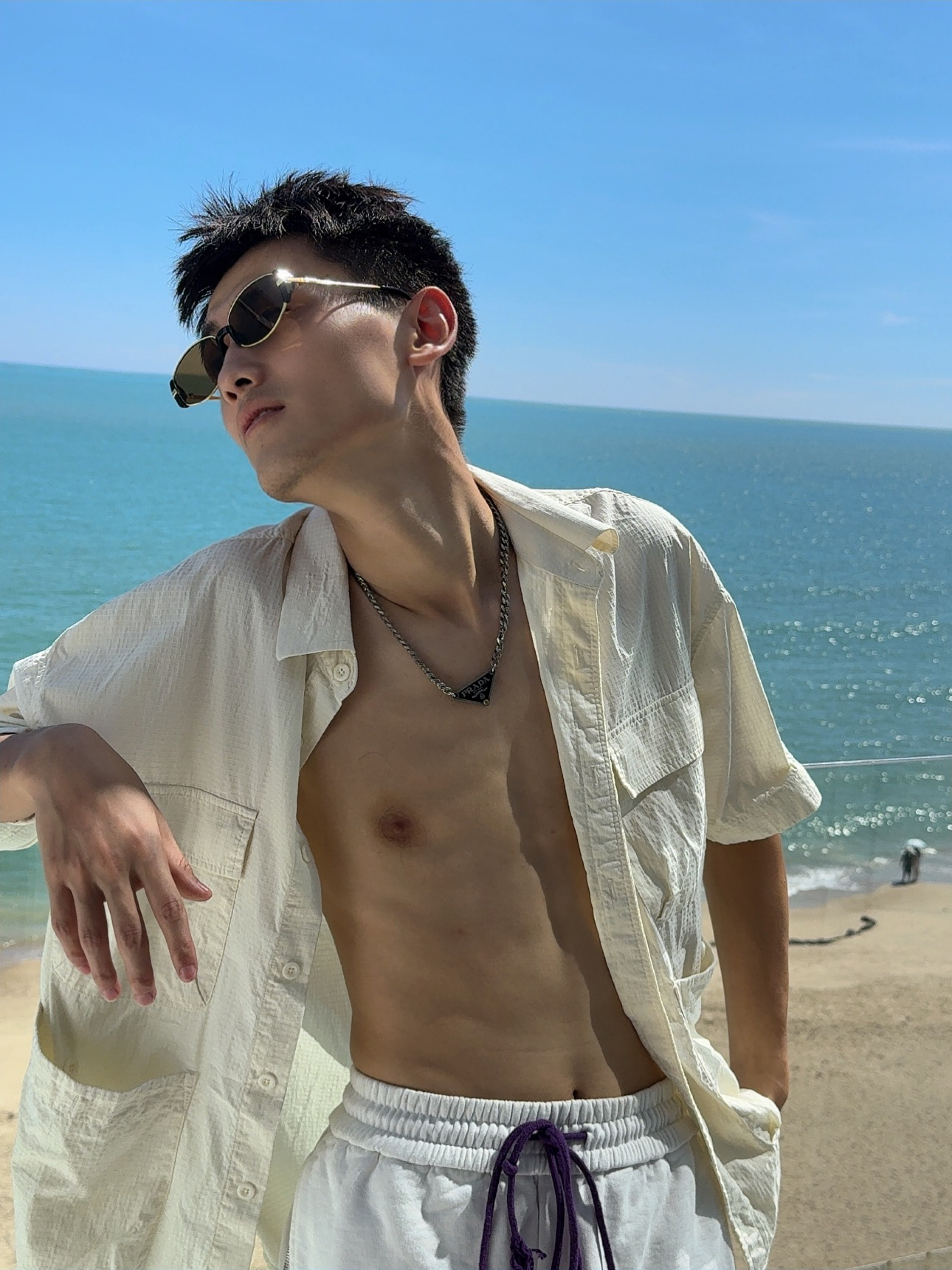 . 海边穿搭主打一个“衬衫半开,全靠海风撑场面” . 墨镜焊在脸上了,毕竟海边的阳光比我的帅气还耀眼 . 别人看海,我看自己的衬衫有没有被风吹得够型 . 海边松弛感?其实是被太阳晒得睁不开眼才捂的墨镜