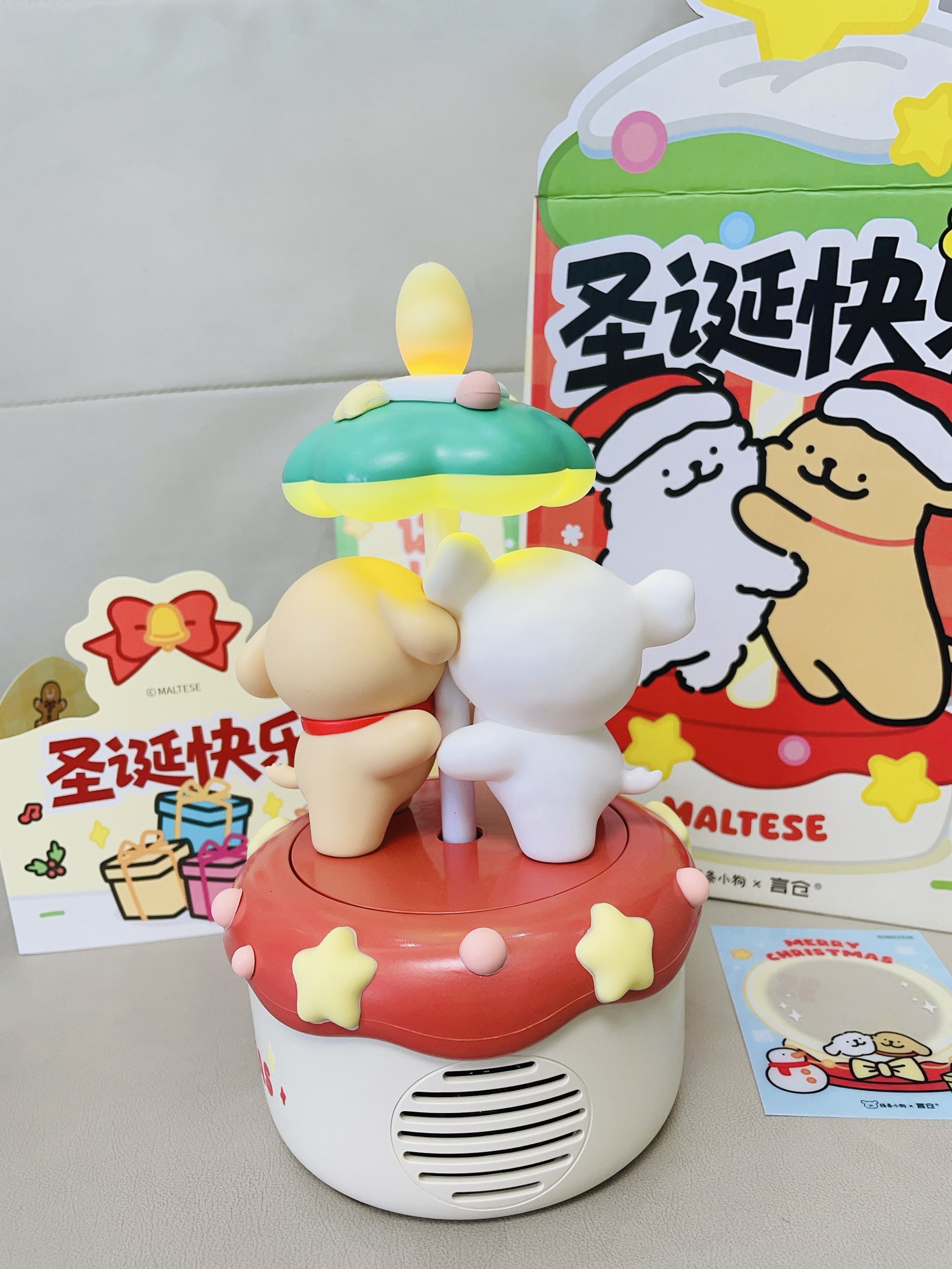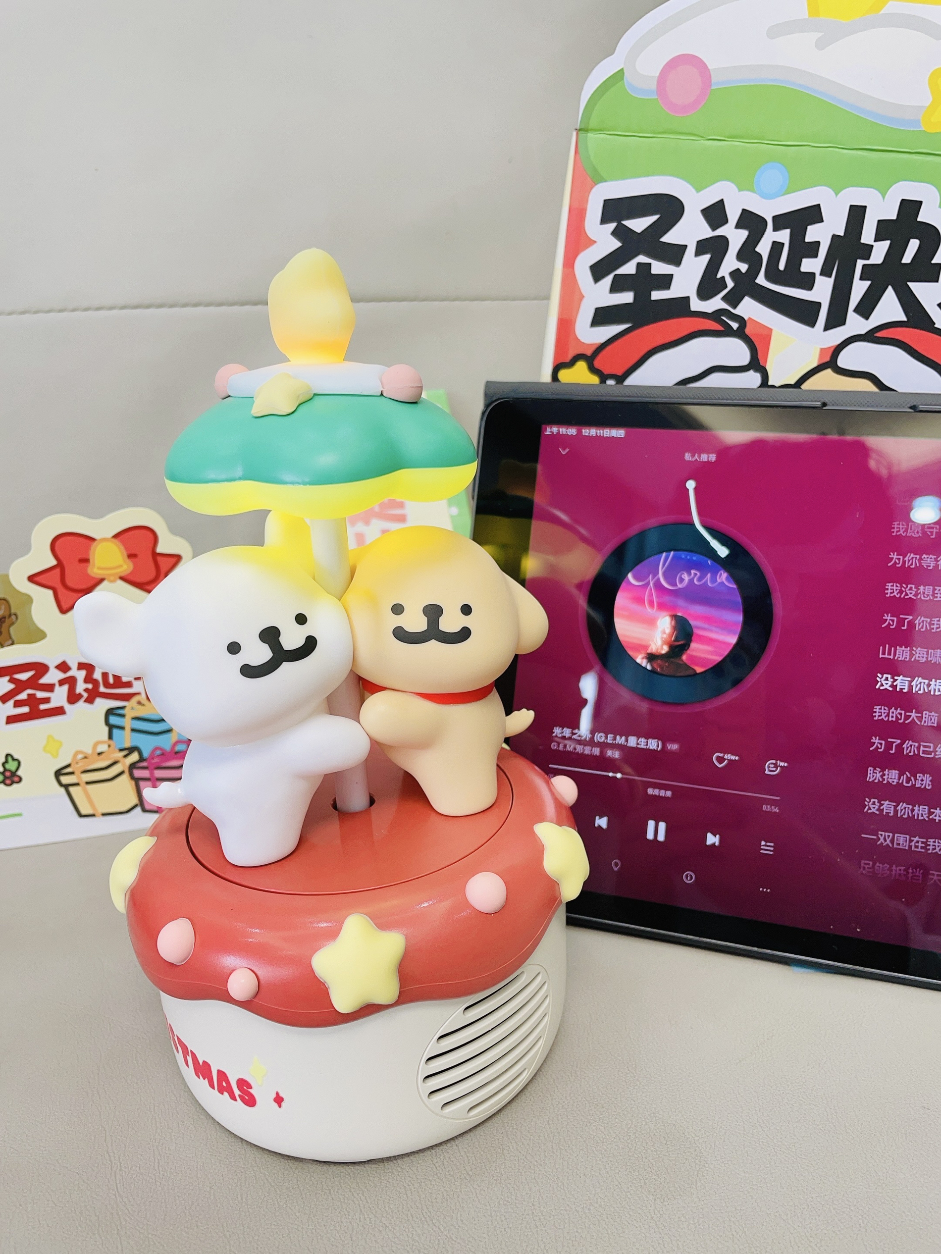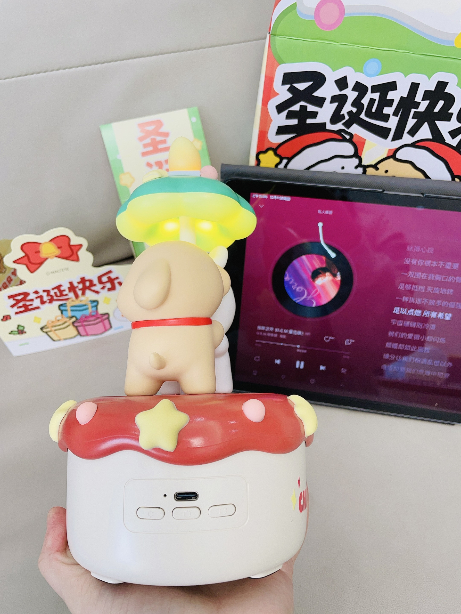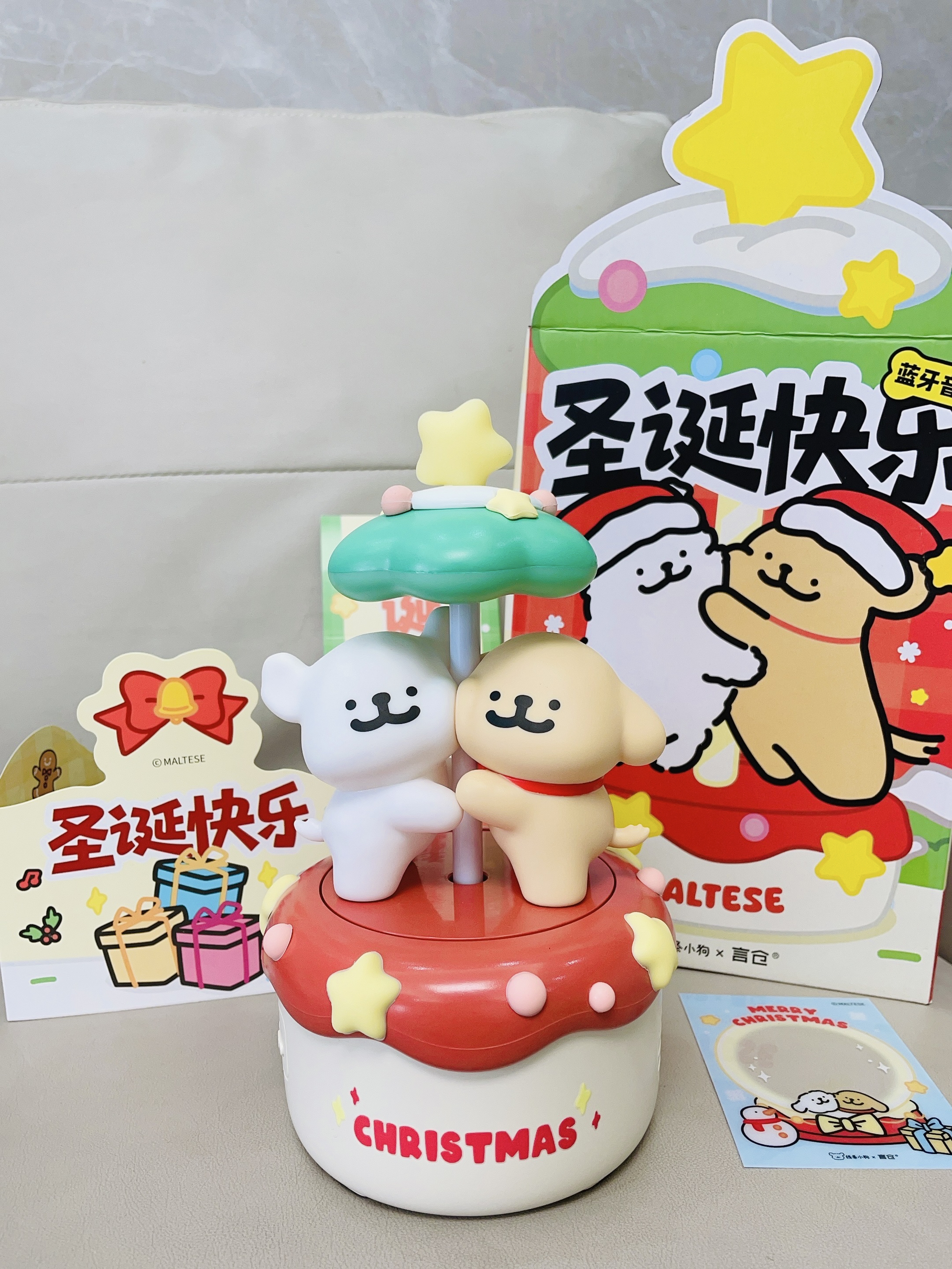 十二月啦又是年末的时候 还有半个月是一年一度的圣诞节 我给自己安排了新的音箱 言仓×线条小狗联名的旋转音箱 打开配色hin有圣诞氛围感 可可爱爱的 可以亮灯 晚上拿来当小夜灯我觉得不错 我试了一下连接蓝牙放音乐 音质hin不错 也可以当小摆件 礼盒包装精致 圣诞拿来送礼都可