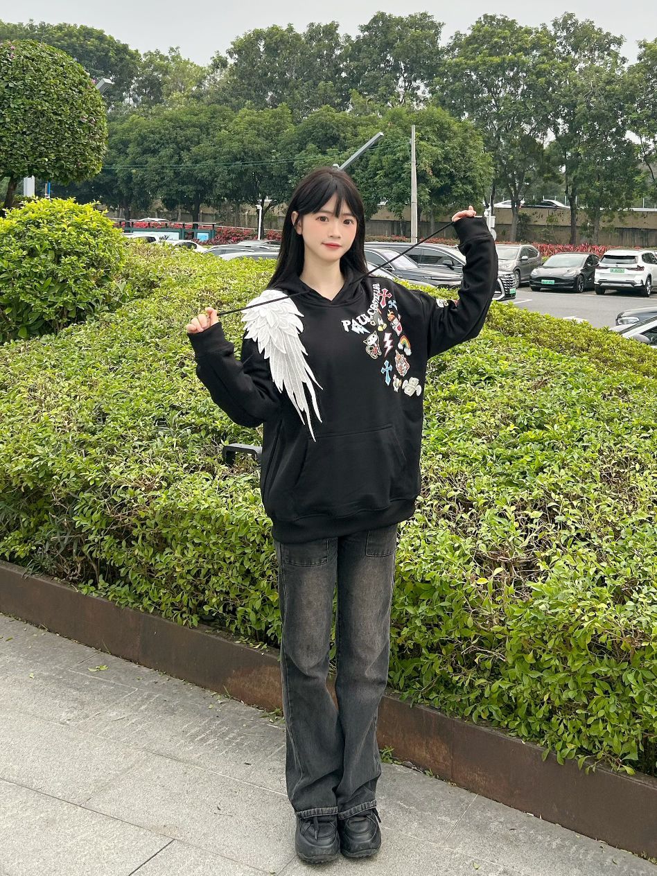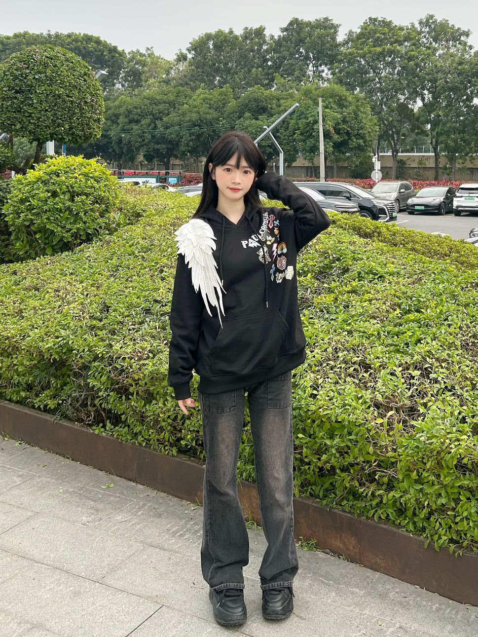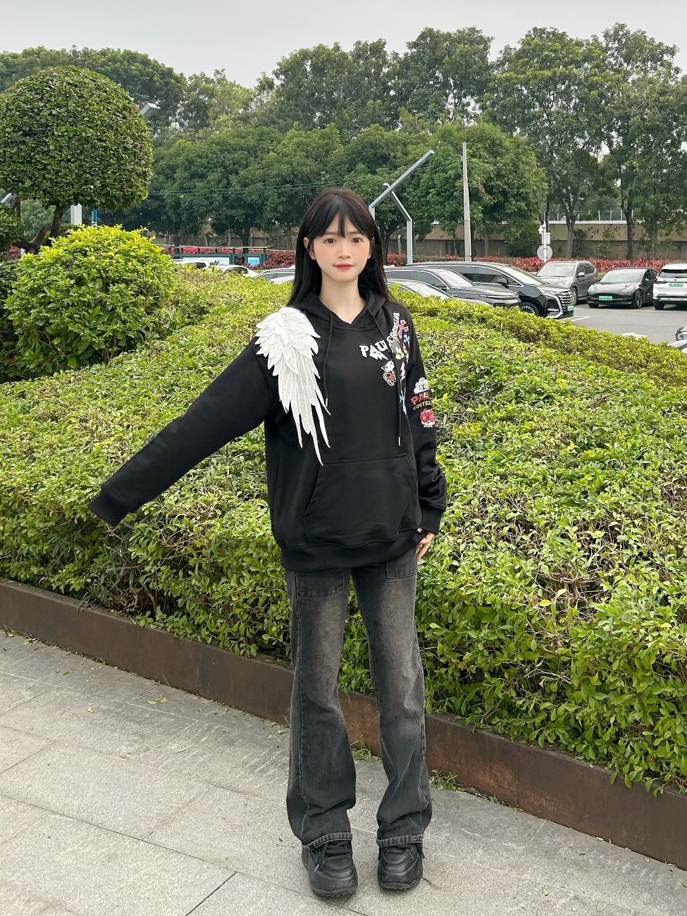 哈喽,家人们,今天的穿搭分享来啦,是一套户外翅膀卡通连帽卫衣穿搭分享~ 黑色刺绣立体翅膀卡通连帽卫衣+黑色直筒牛仔裤👖+黑色增高百搭板鞋 一整套户外翅膀卡通连帽卫衣穿搭get~ 尺码参考: 身高、体重:160、90 衣服:m 裤子:m 鞋子:36