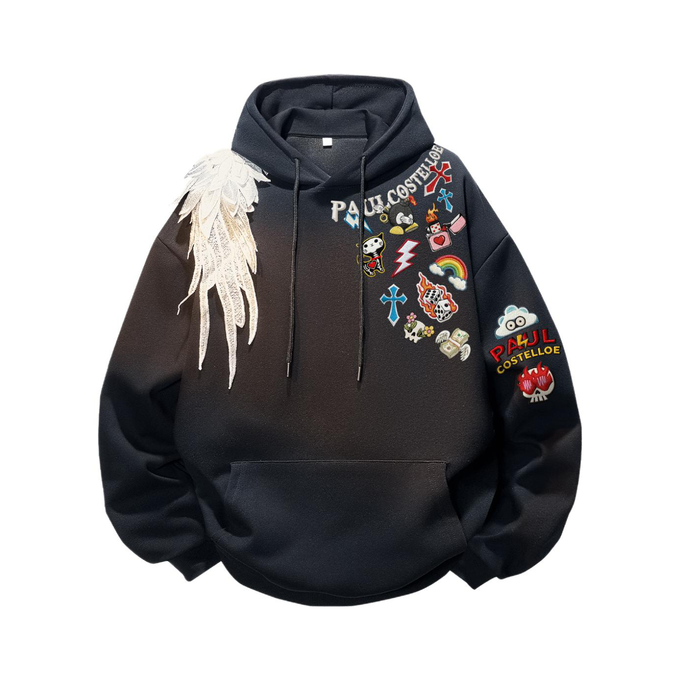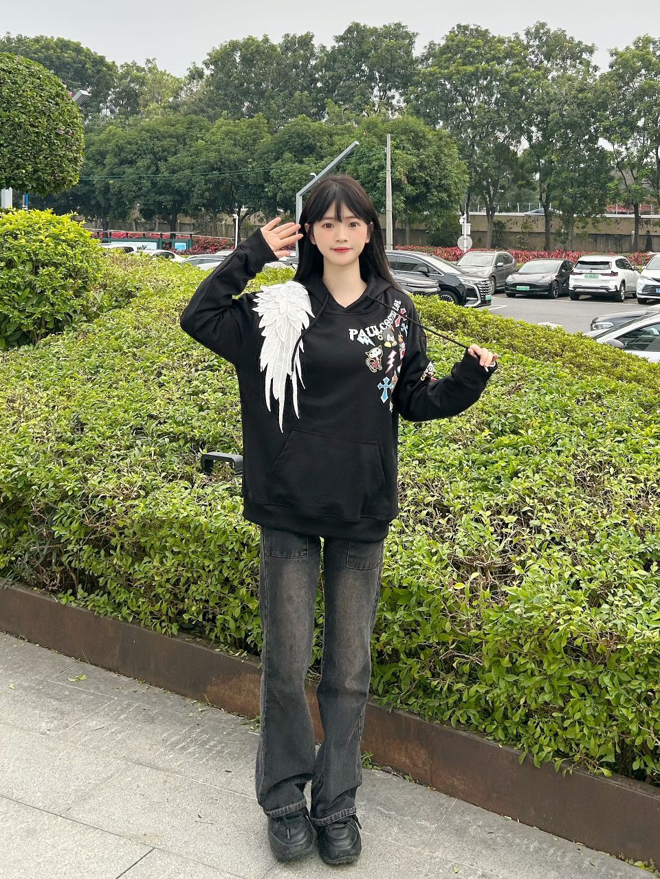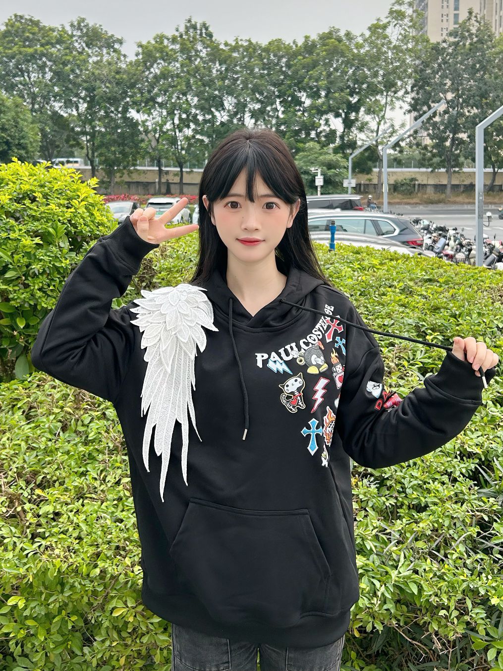 哈喽,家人们,今天的穿搭分享来啦,是一套户外翅膀卡通连帽卫衣穿搭分享~ 黑色刺绣立体翅膀卡通连帽卫衣+黑色直筒牛仔裤👖+黑色增高百搭板鞋 一整套户外翅膀卡通连帽卫衣穿搭get~ 尺码参考: 身高、体重:160、90 衣服:m 裤子:m 鞋子:36