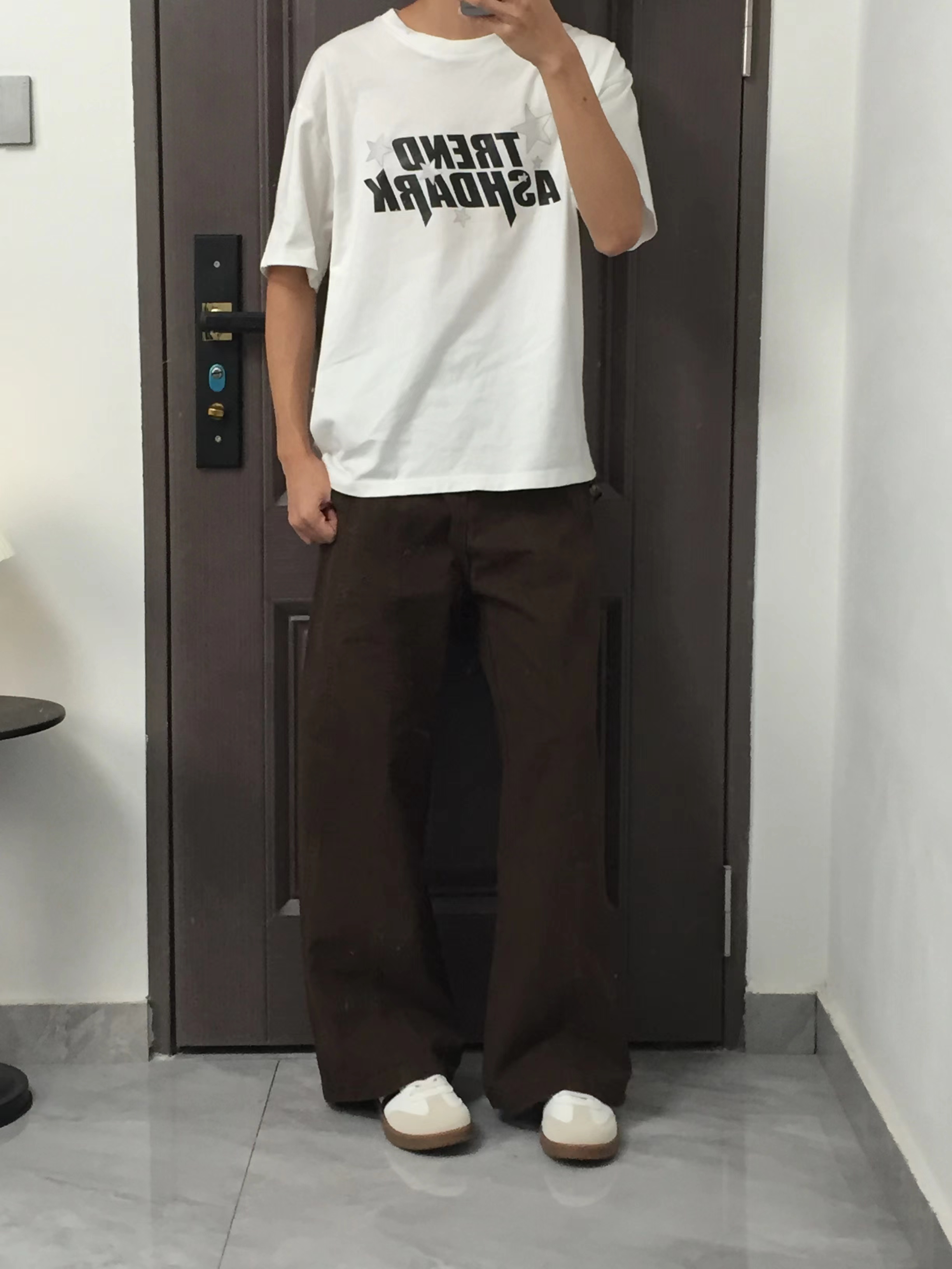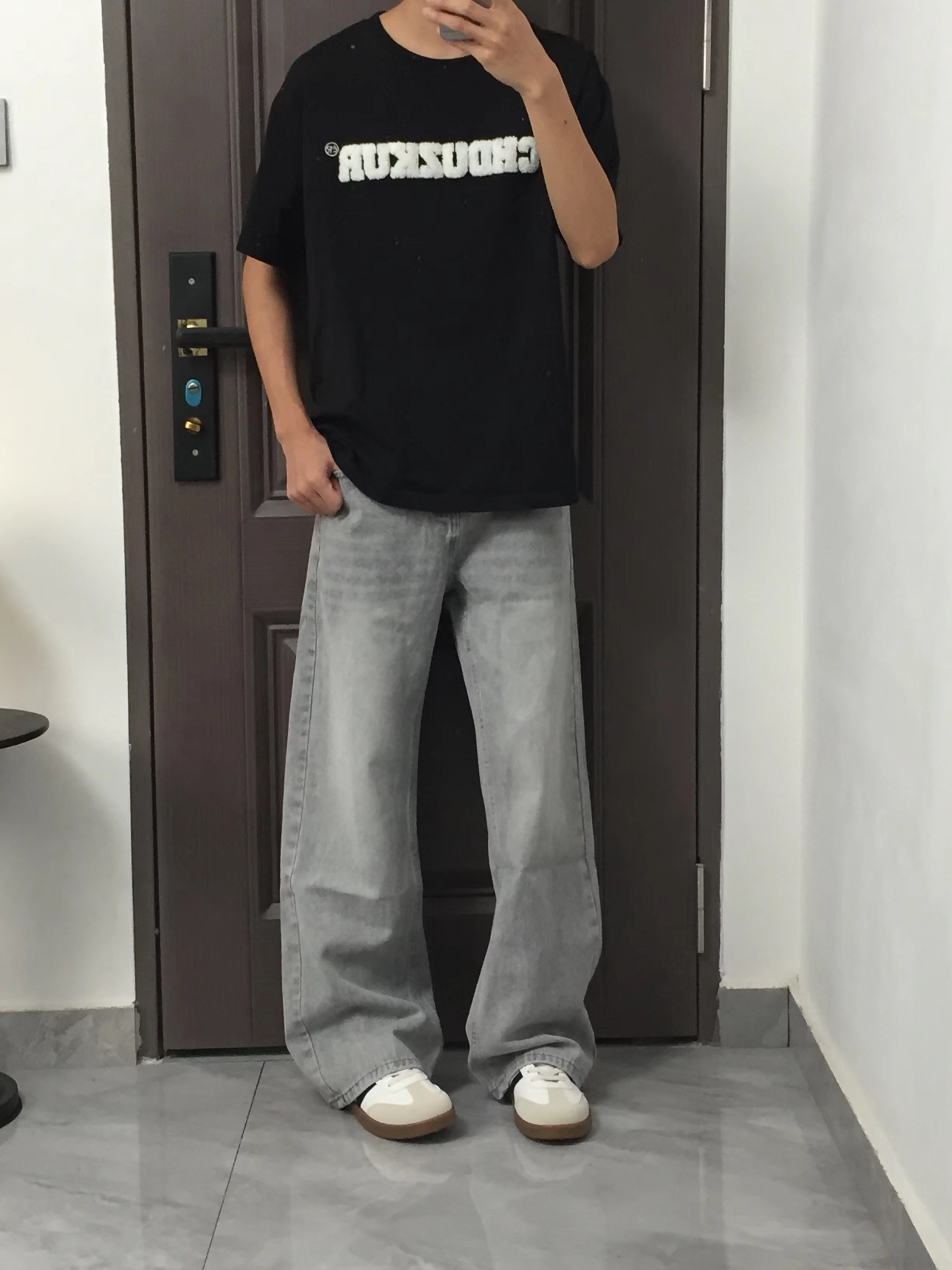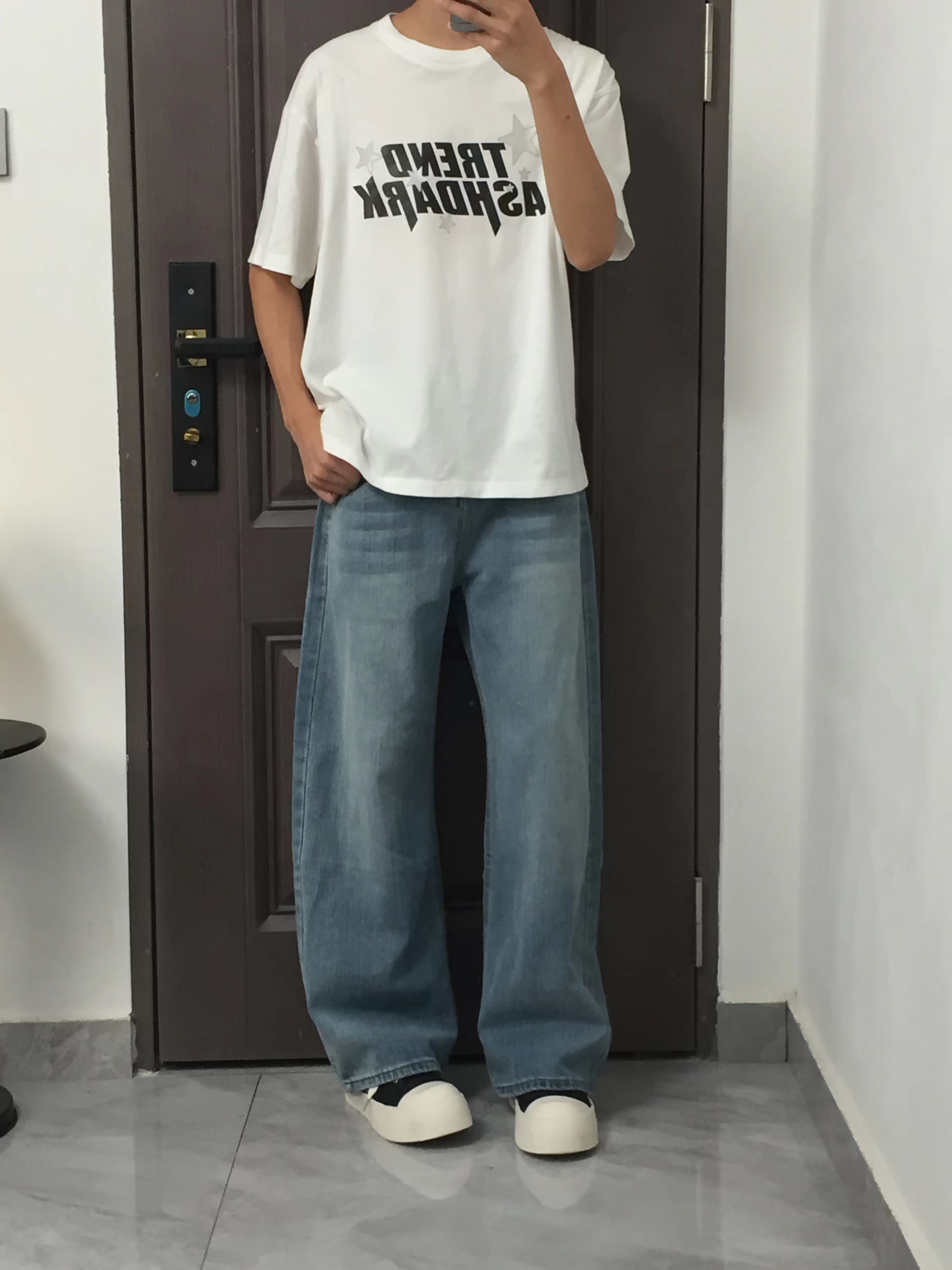 第一套黑T配浅灰阔腿牛仔,黑白灰经典配色永不出错,植绒字母印花还自带质感,随便搭双小白鞋就很有范儿。 第二套全黑look更酷,纯黑短袖搭黑牛,简约又显瘦,厚底鞋悄悄增高,走在路上自带气场。 第三套白T配咖色阔腿裤,暖调配色超有复古感,字母印花打破单调,日常出街慵懒又帅气。 第四套白T搭复古蓝牛仔,清爽又少年气,宽松裤型对腿型包容度拉满,学生党和打工人都能穿。