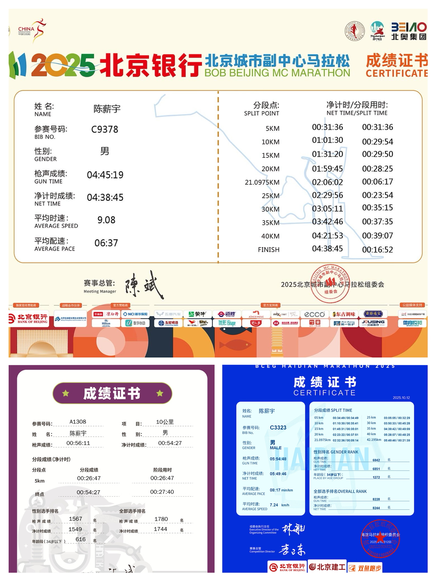#2025跑马战报 2025年跑马真的是差距很大,上半年4月份北京副中心马拉松跑出了自己的pb成绩4小时38分,下半年北京海淀马拉松跑步了自己的PW成绩5小时54分,真的是锻炼就有效果 2025年一共两场全马,一场10公里也算是圆满结束了,符合之前的一年2场马拉松的目标🎯 期待明年再战‼️