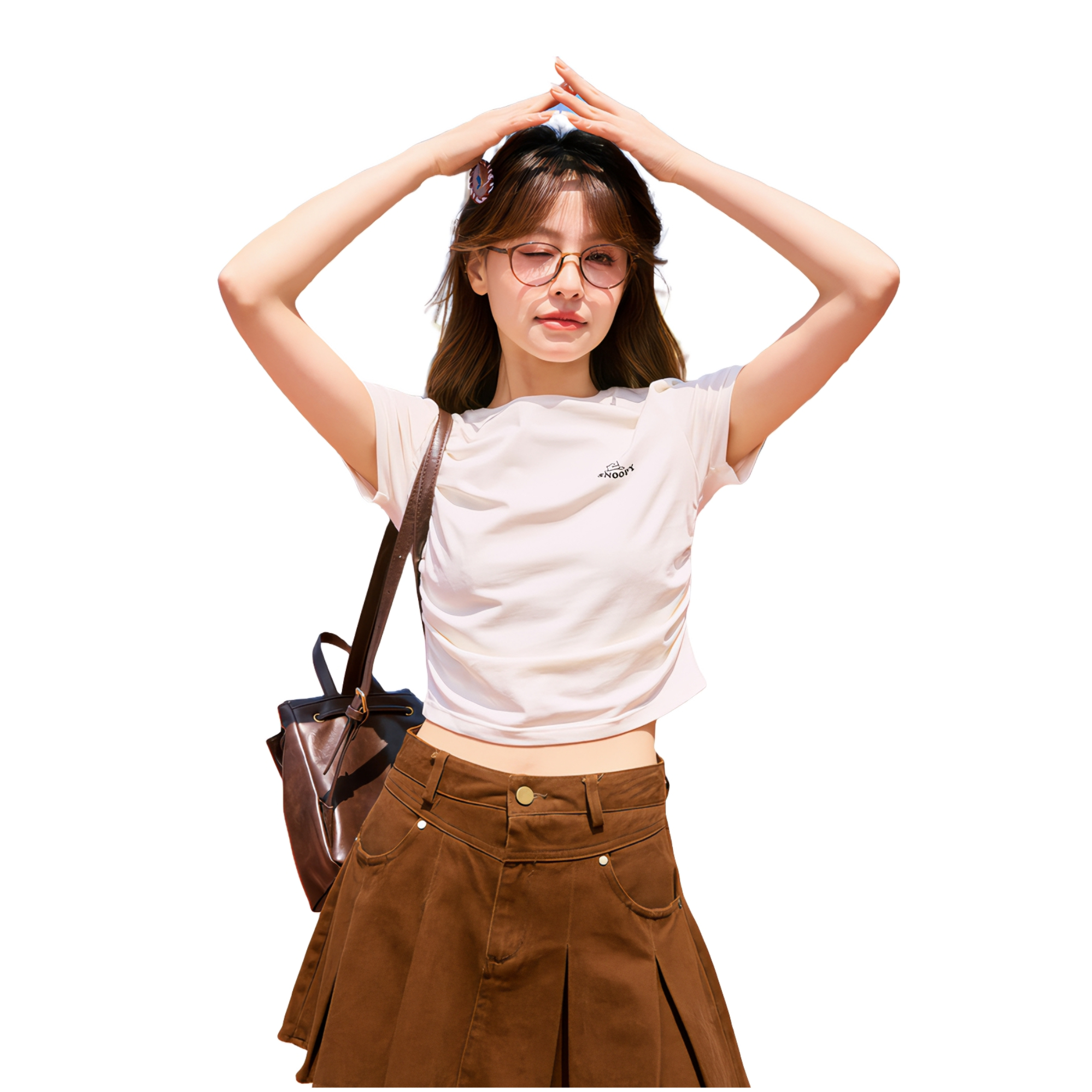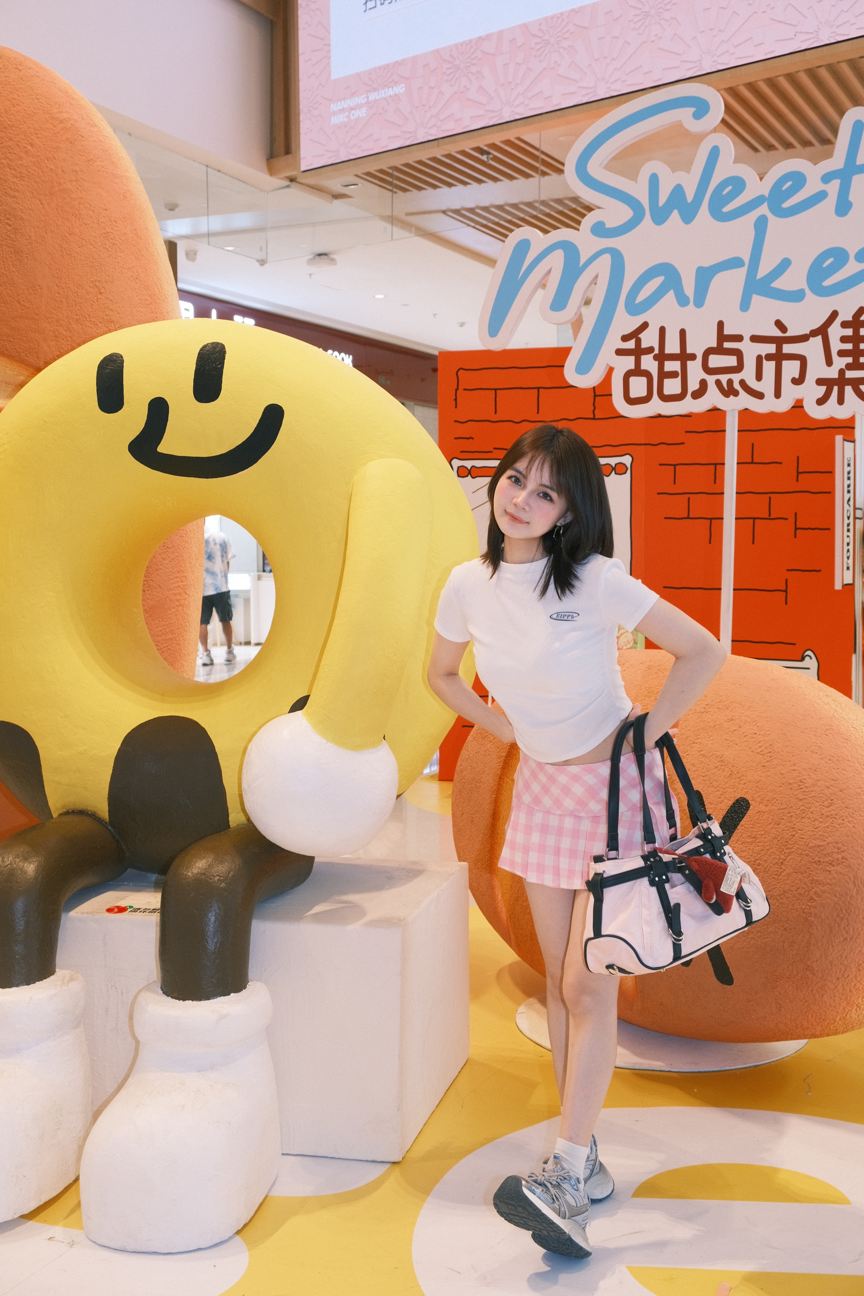 和甜甜圈巨型装置同框,今天是糖分超标的元气甜妹🍩 短款白T露腰+粉格百褶裙,清爽又显比例 搭配拼色包包和老爹鞋,甜中带点休闲感 随便一站都像漫画里走出来的!