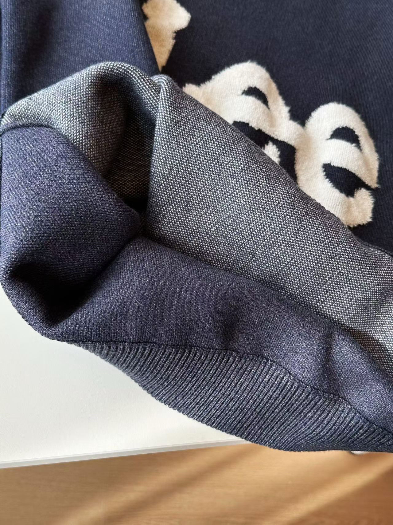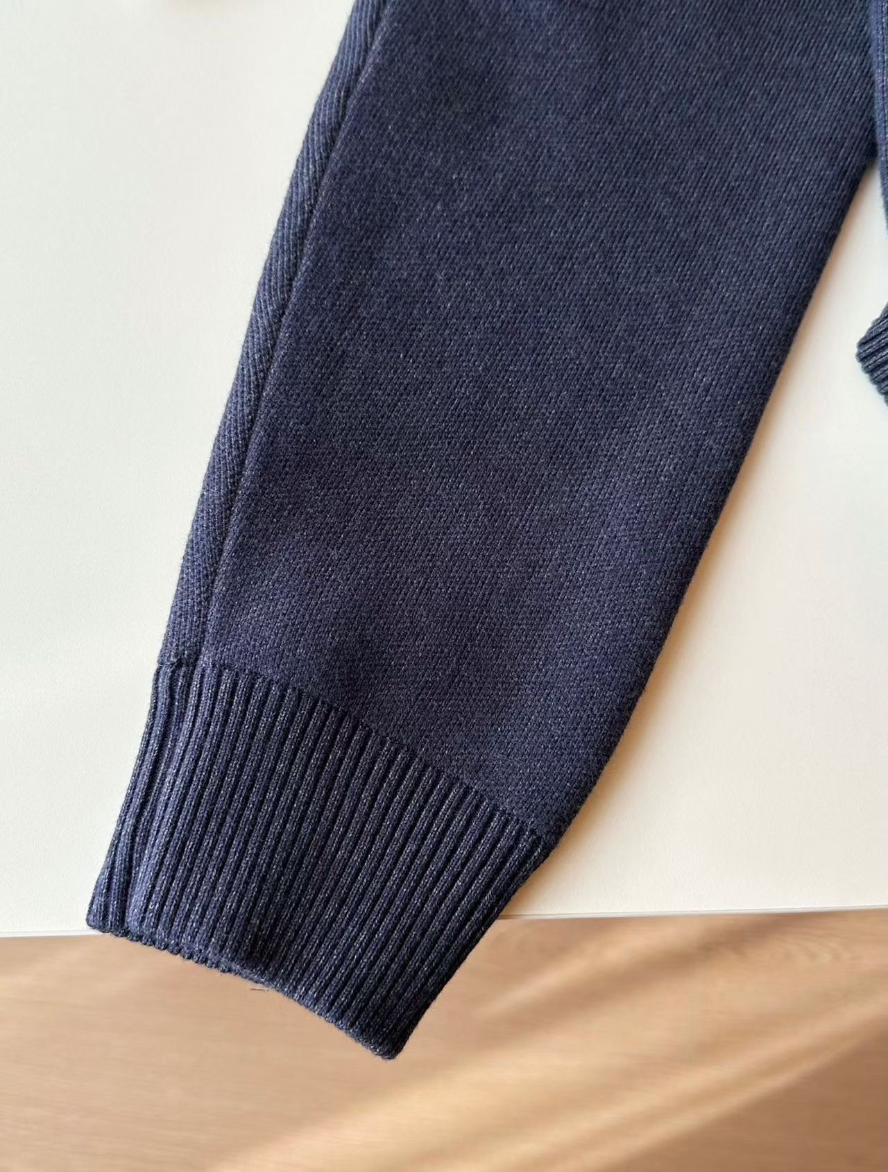 这件藏青色“Lee”字母毛衣质感真的绝!胸前的毛绒字母标软乎乎的很有设计感,面料混了羊毛和聚酯纤维,摸起来厚实又亲肤,称重接近一斤的分量,穿在身上保暖度刚好。细节也很到位,领口和袖口的螺纹收边利落又耐穿,日常搭牛仔裤或者休闲裤都很适配