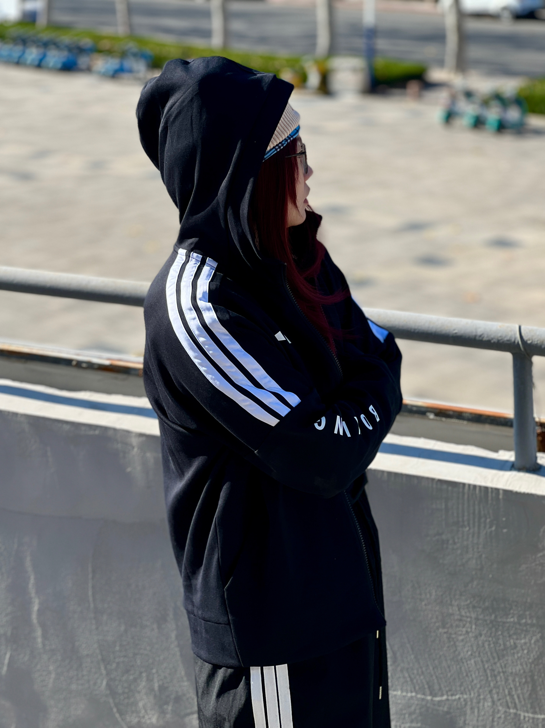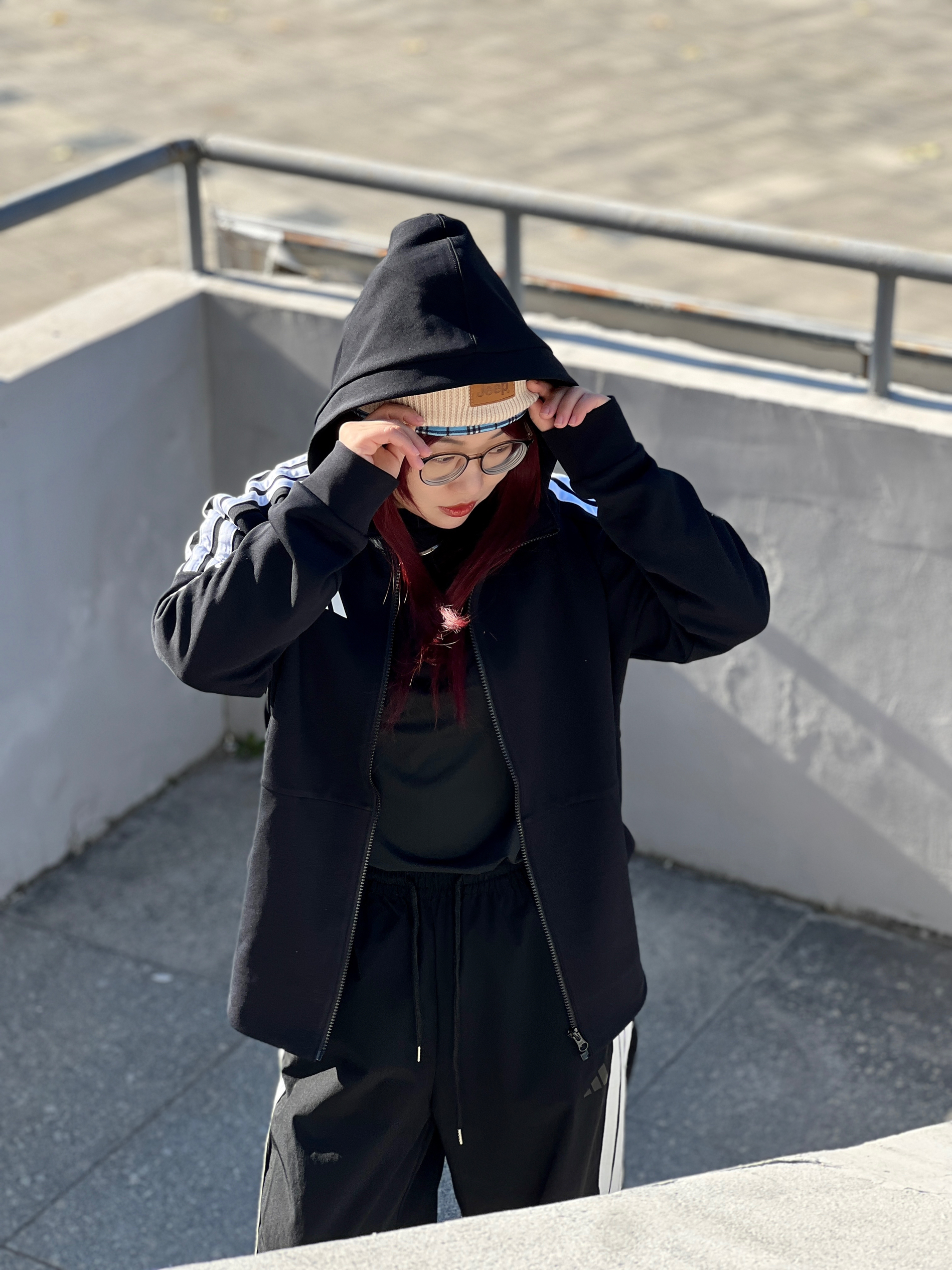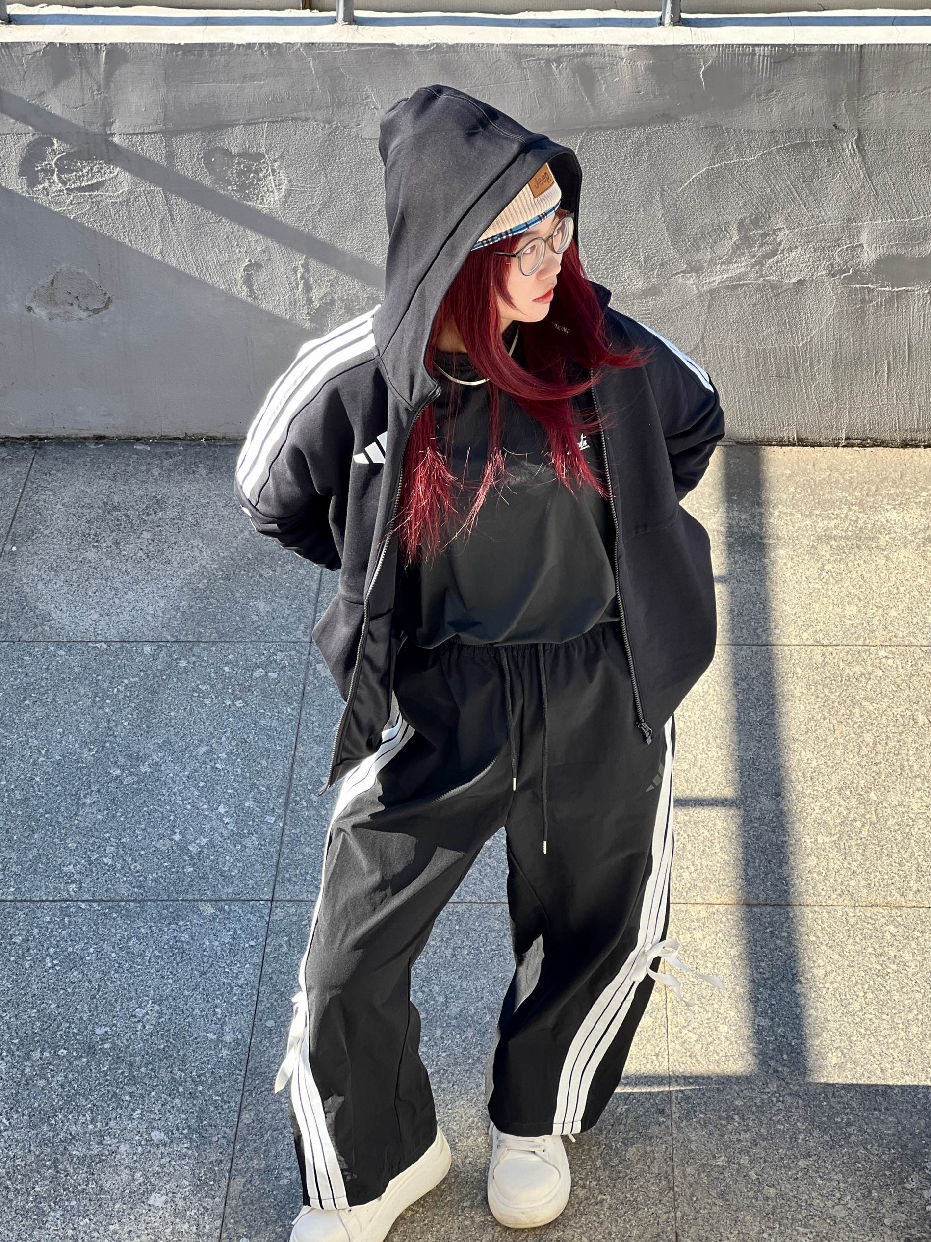 冬天就要穿简单点 三条杠黑色系+冷帽😎潮酷值拉满✨ 白鞋一踩👟街头松弛感直接焊身上