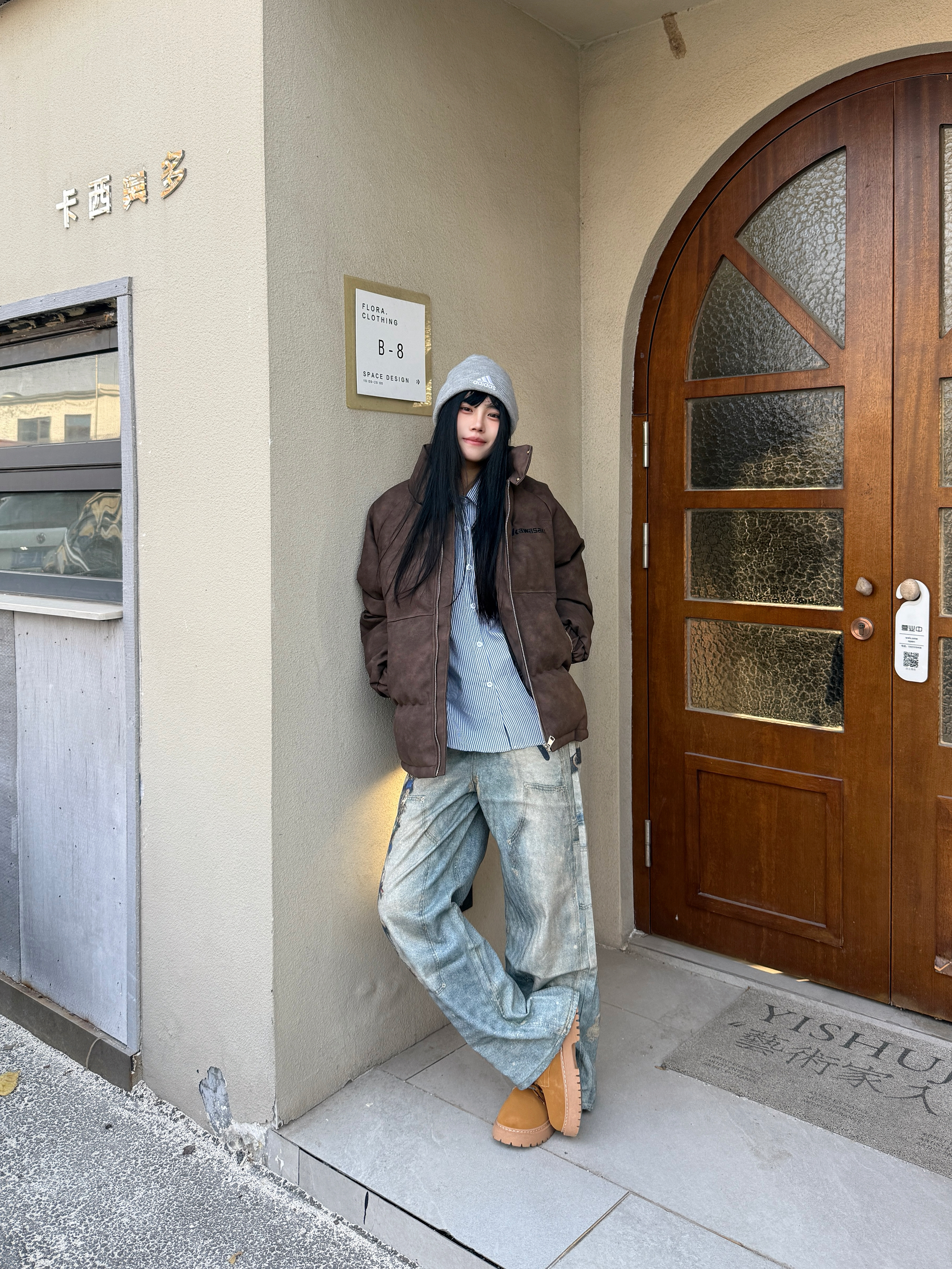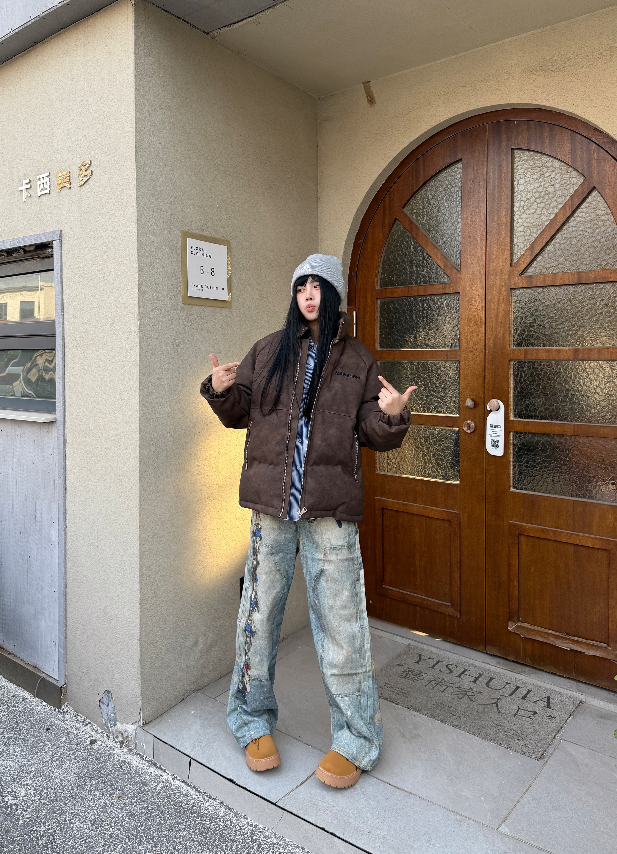 今日份ootd主题是美式高街风 👔上衣穿了 Kawasaki川崎 的棉服外套 Pu皮材质看上去就很有质感 而且它加厚的设计冬天降温也不怕 👖搭配了一条做旧印花牛仔裤 最后戴一个帽子增加氛围感