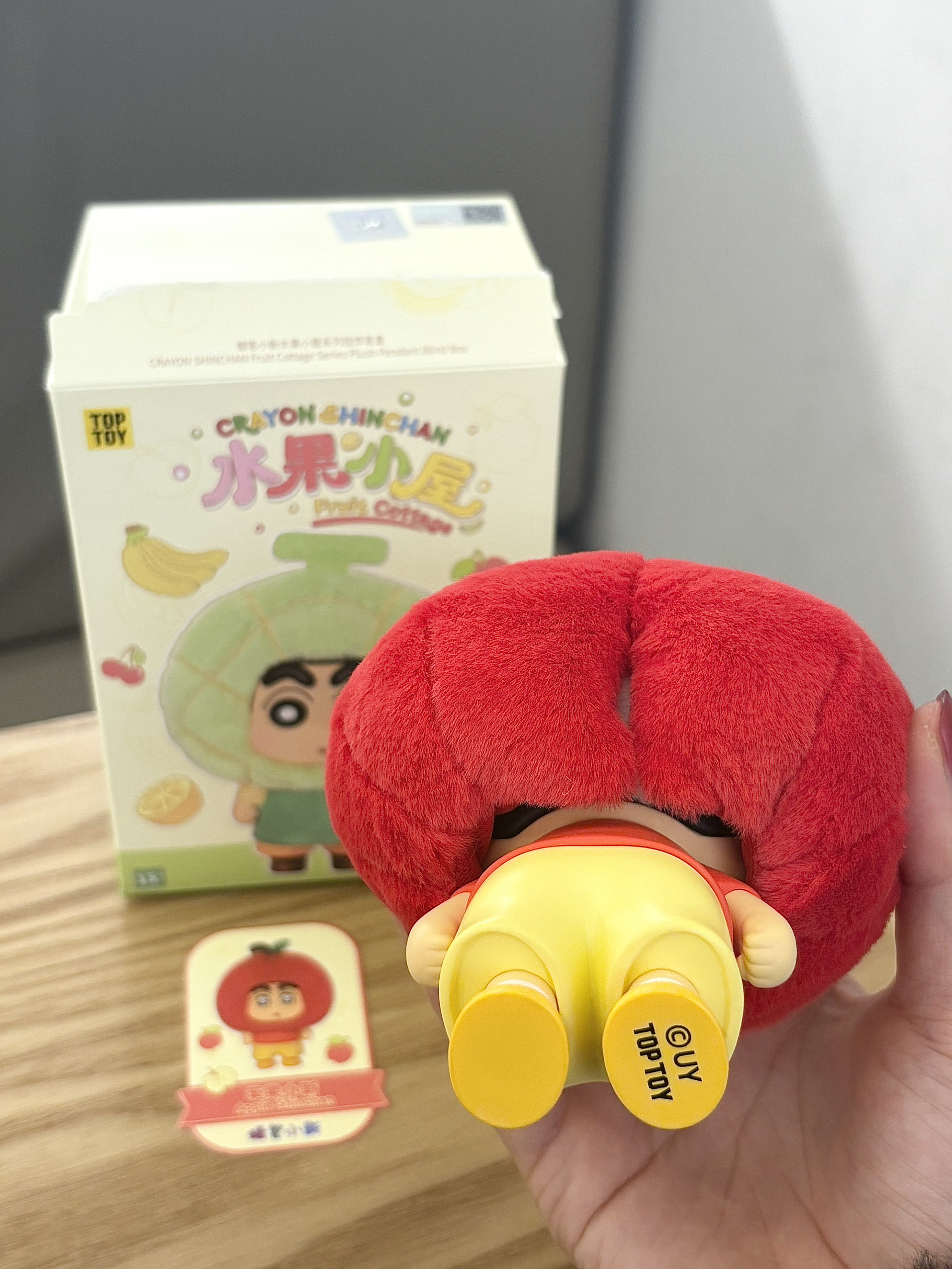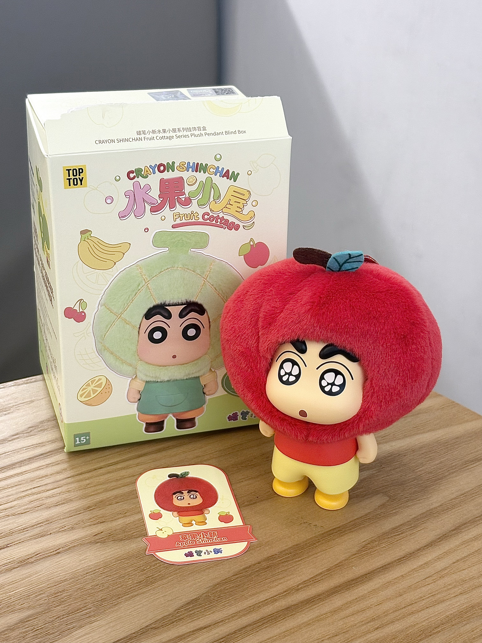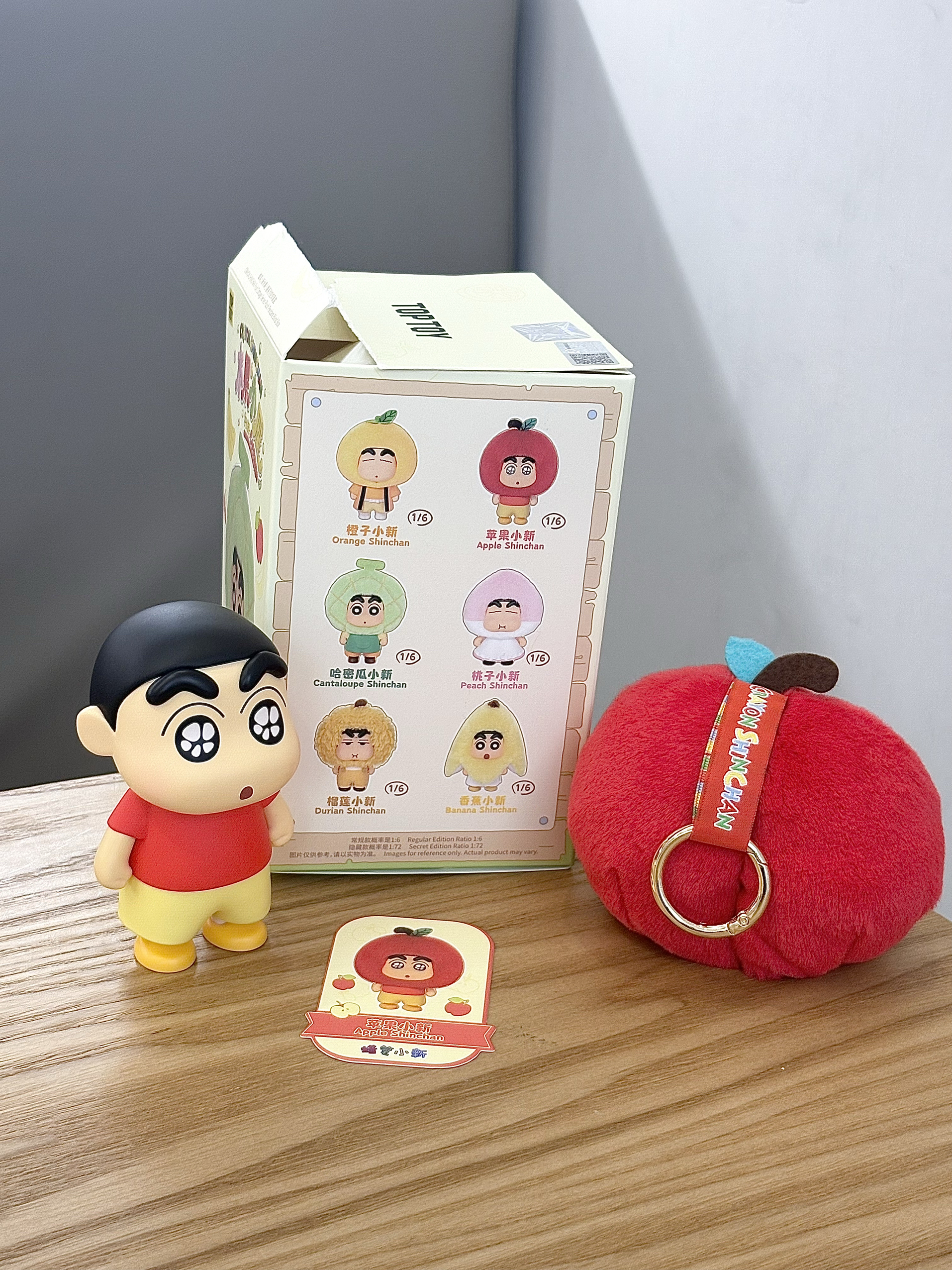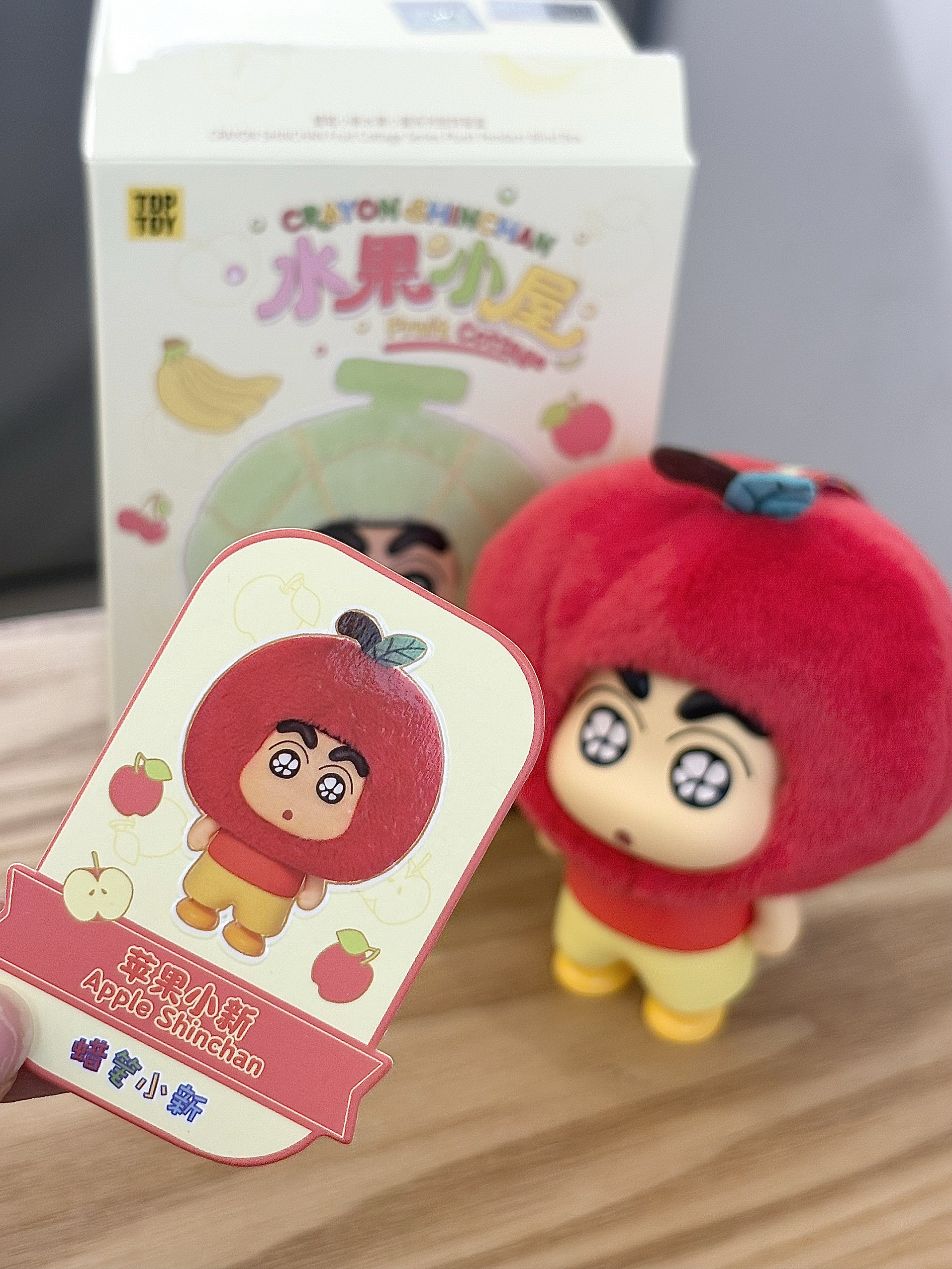 最近我真的很喜欢蜡笔小新水果屋系列的这个盲盒 这不又拆了一盒,重复啦,又是一个苹果,好在它确实可爱,而且头套还可以更换哦