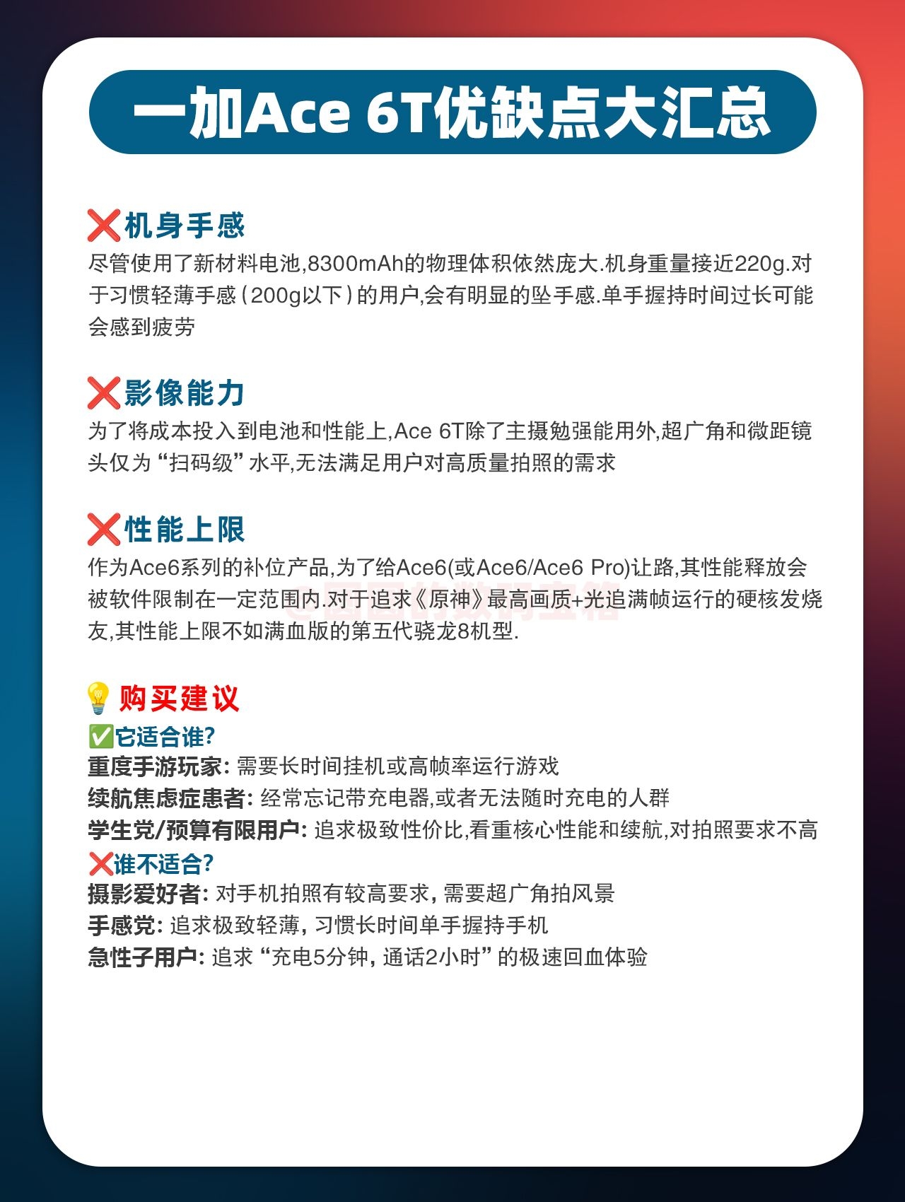 作为全球首发骁龙8 Gen5的重磅选手,一加Ace 6T性能直接拉满!还有那个夸张的8300mAh超大电池,出门再也不用带充电宝了!🔋圆圆实测了一加Ace6T整整一周!它的流畅度和续航真的给了我很大的惊喜~ 不过嘛,世上哪有完美的手机?作为真实用户,圆圆在细节体验上也发现了一些美中不足的小遗憾🙅♀️ 🥳优点 ✅续航能力:8300mAh大电池,重度使用一天甚至不用带充电宝,续航焦虑者福音~ ✅...