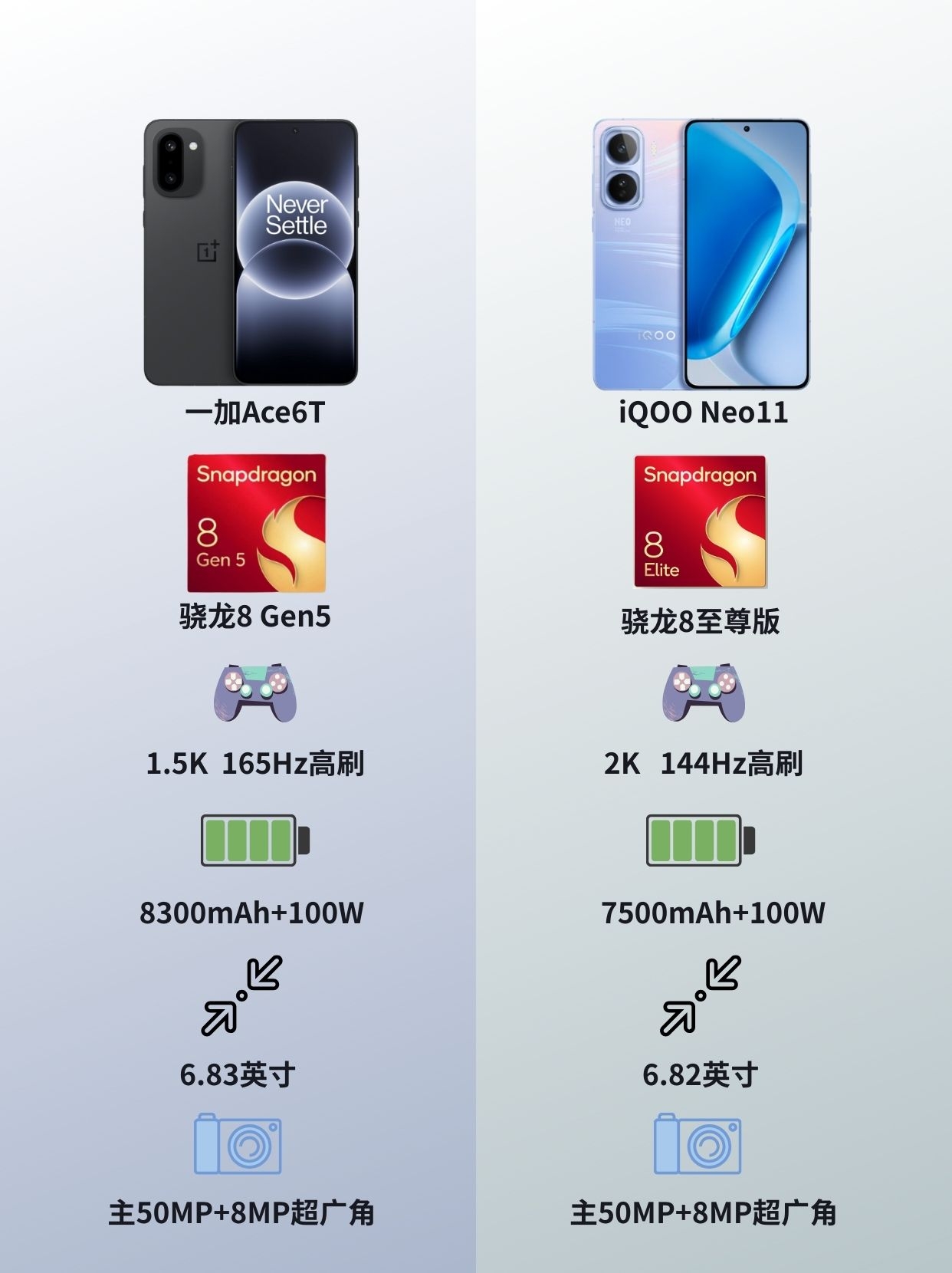 年底想换手机的宝子看过来~聚焦骁龙芯新机,一加Ace6T和iQOO Neo11各有特色,按需求选准没错👇 🌟一加Ace6T 搭载骁龙8 Gen5,1.5K 165Hz高刷屏带来流畅观感,8300mAh超大电池+100W快充,续航充电双在线🔋! 还有超多实用功能:AI一键闪记自动存取餐码、游戏流体云不浪费复活时间、游戏指令解放双手,加上明眸护眼小金标认证,日常用机和游戏体验都拉满~ 🌟iQO...