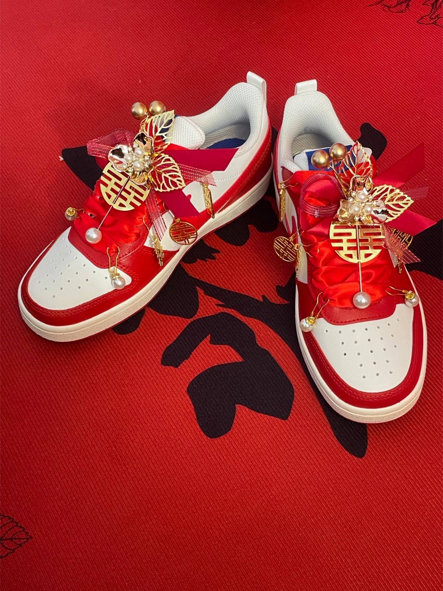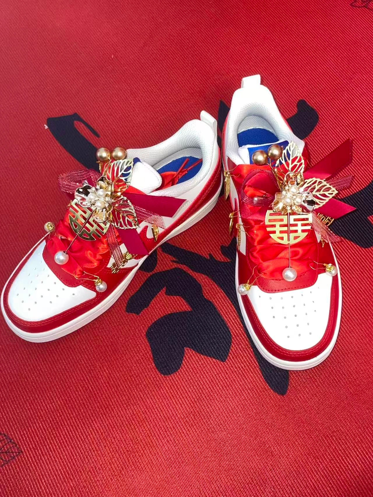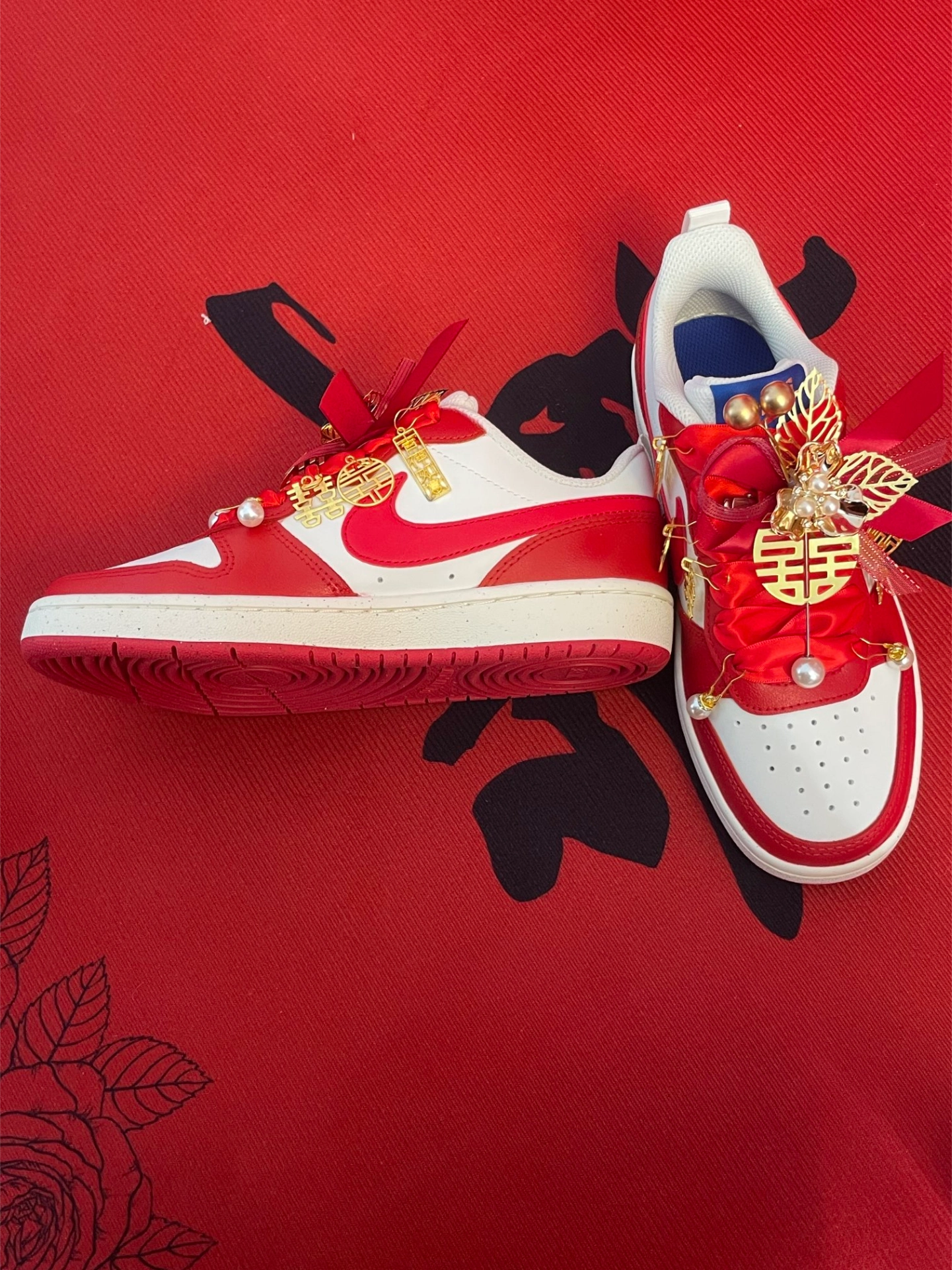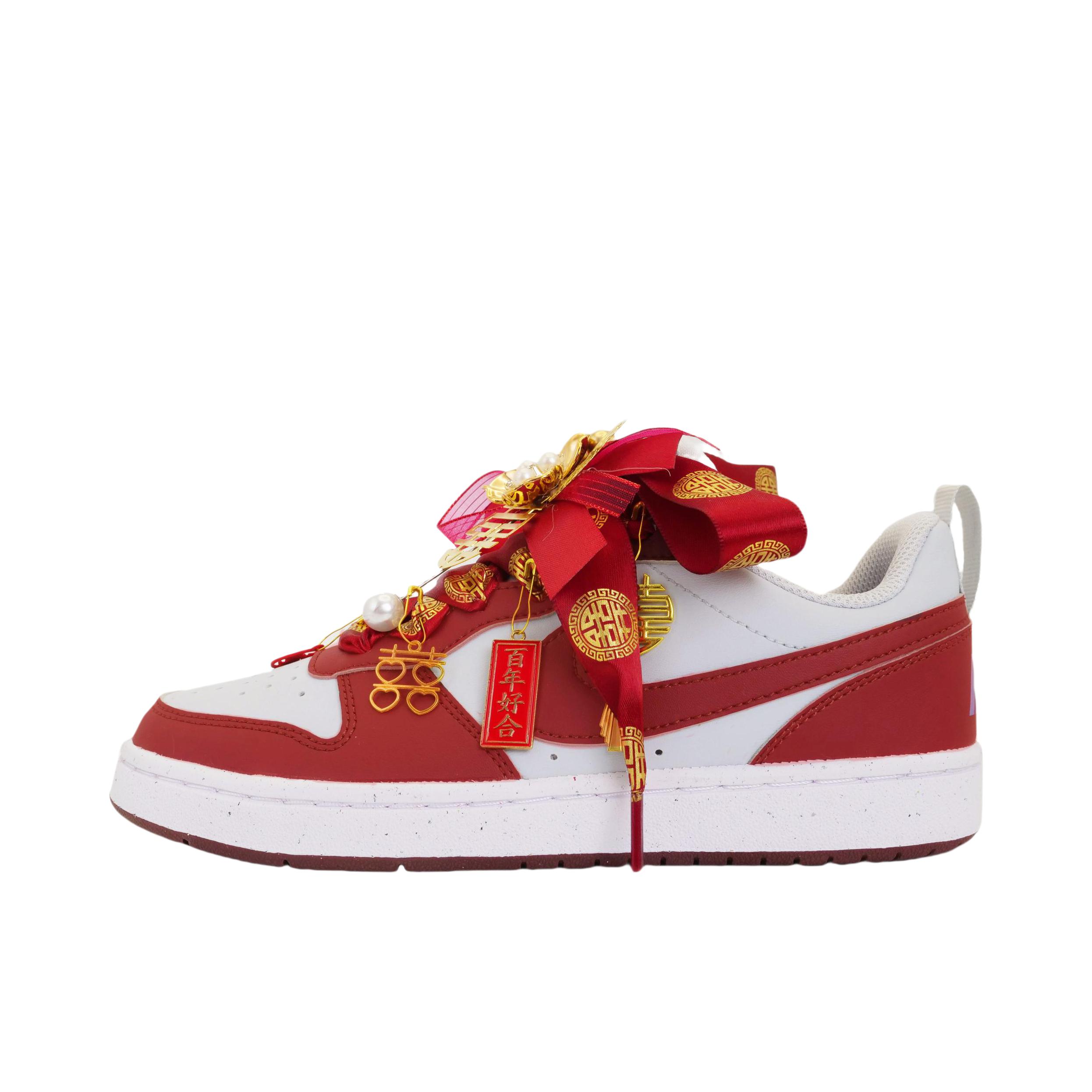 耐克这款定制婚鞋白红配色颜值在线,喜庆的红缎带搭配精致的配饰,双喜吊坠超级浪漫。婚礼上穿它既有仪式感又很舒适,走再多路都不累脚。 #耐克定制婚鞋 #穿上耐克婚鞋 #结婚必备婚鞋 #国风婚礼板鞋 #婚礼潮鞋