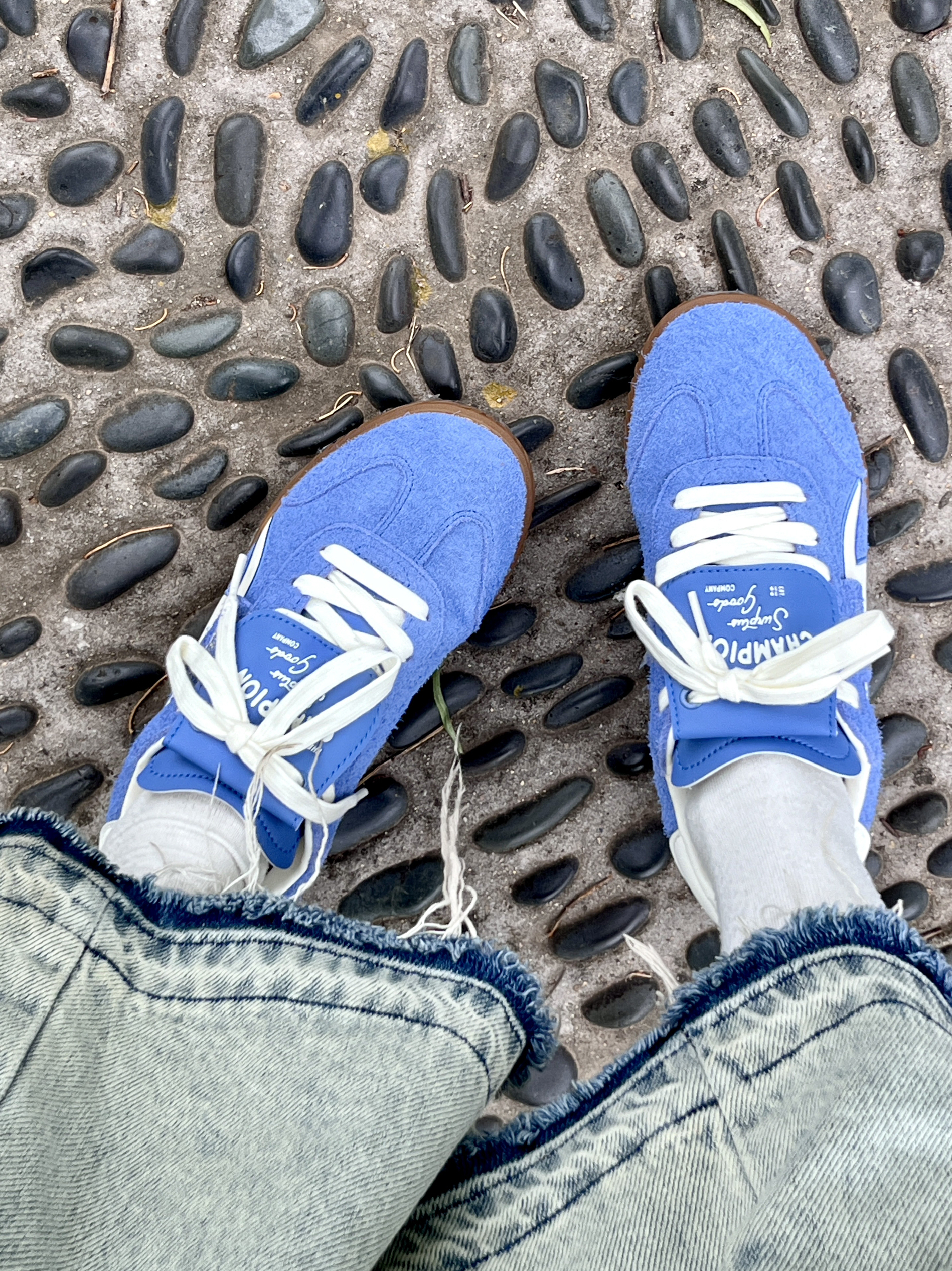 冠军还得是你!新出的奶油蓝德训鞋上脚好乖 黄色的鞋身和蓝色的鞋带给人一种软软糯糯小清新的感觉,行走的初恋滤镜、减龄又百搭、快冲啊!!!!姐妹们