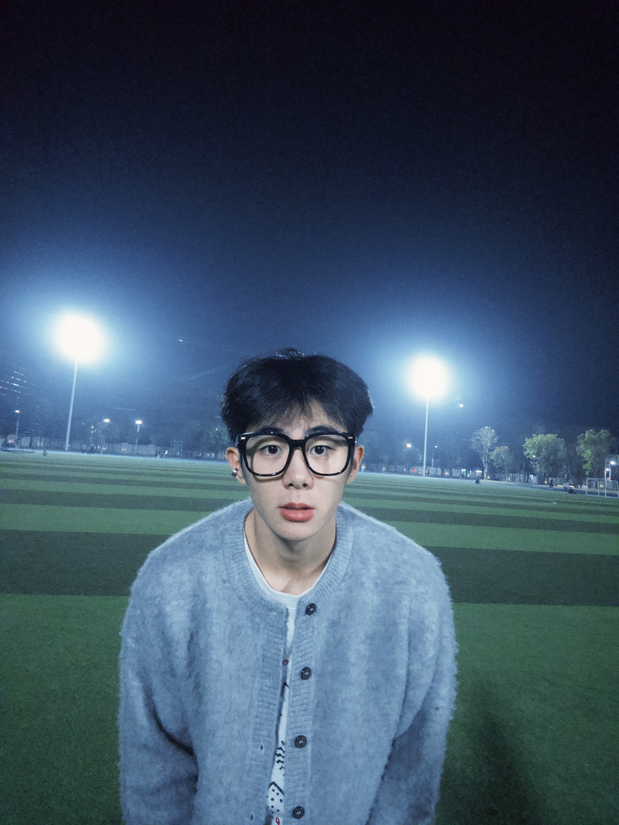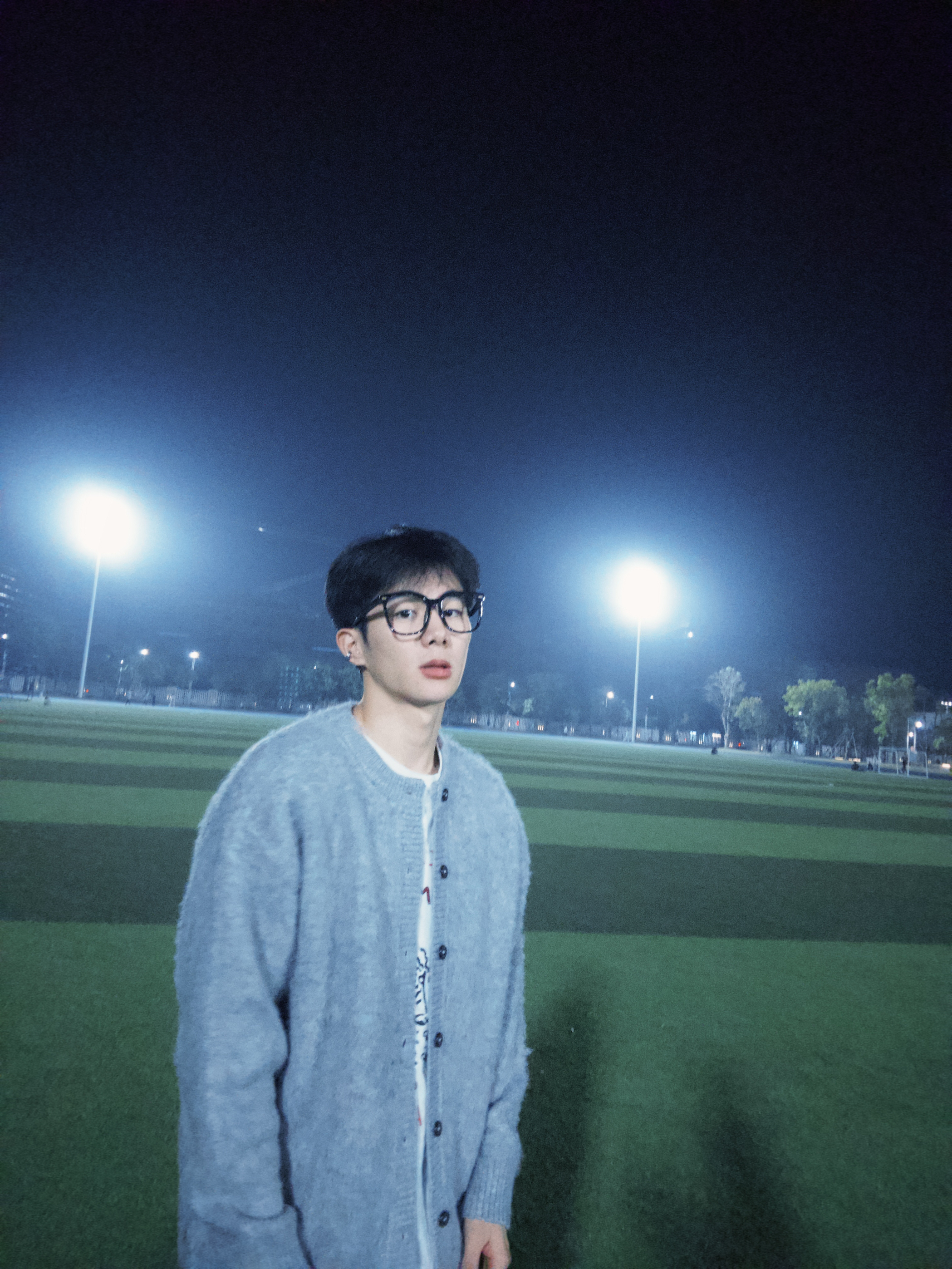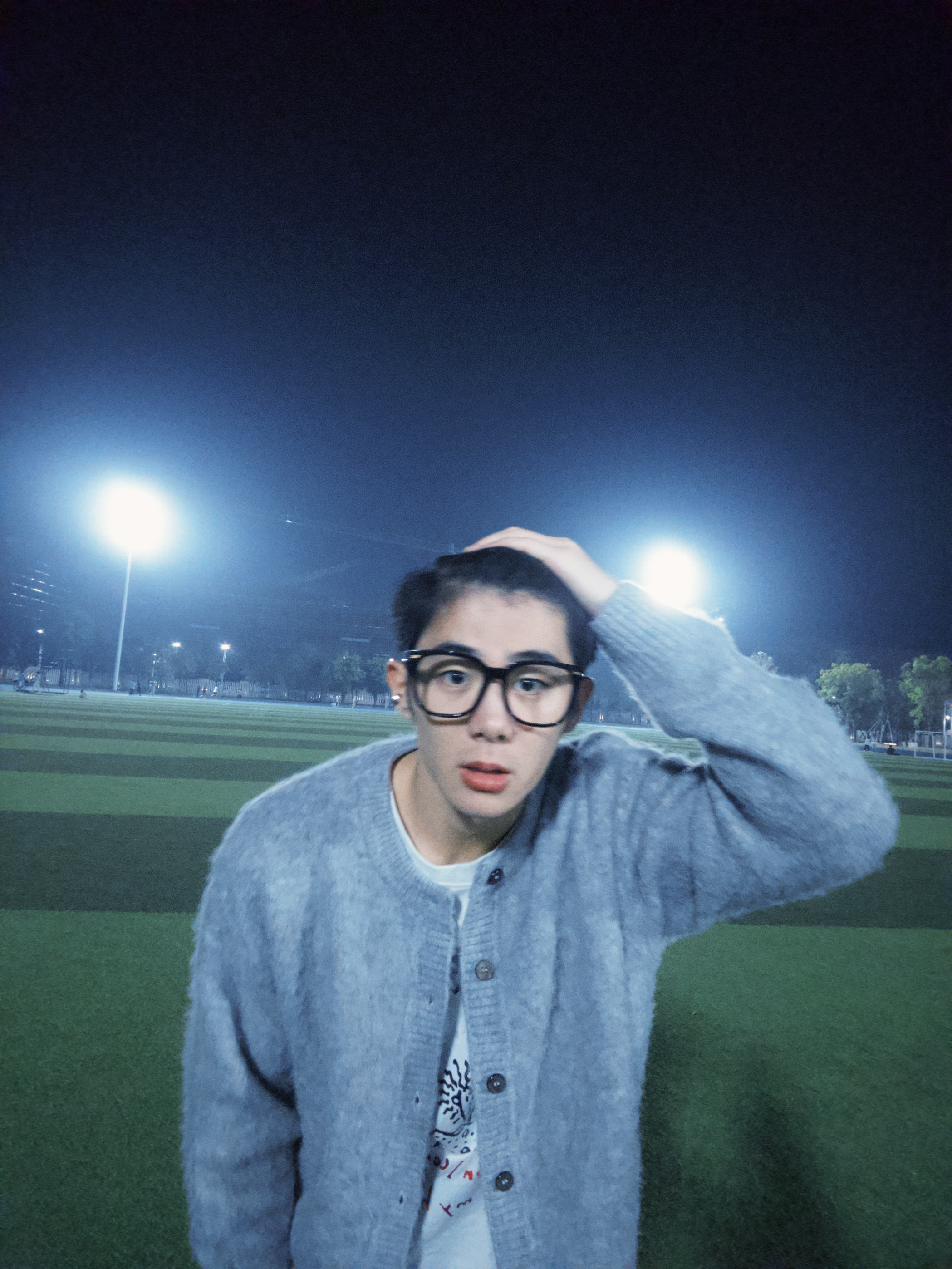 谁懂这组夜拍的松弛感?浅灰毛绒开衫软乎乎像裹了团云,垂坠感拉满不臃肿,内搭印花白T添点随性,黑裤利落压得住柔调
