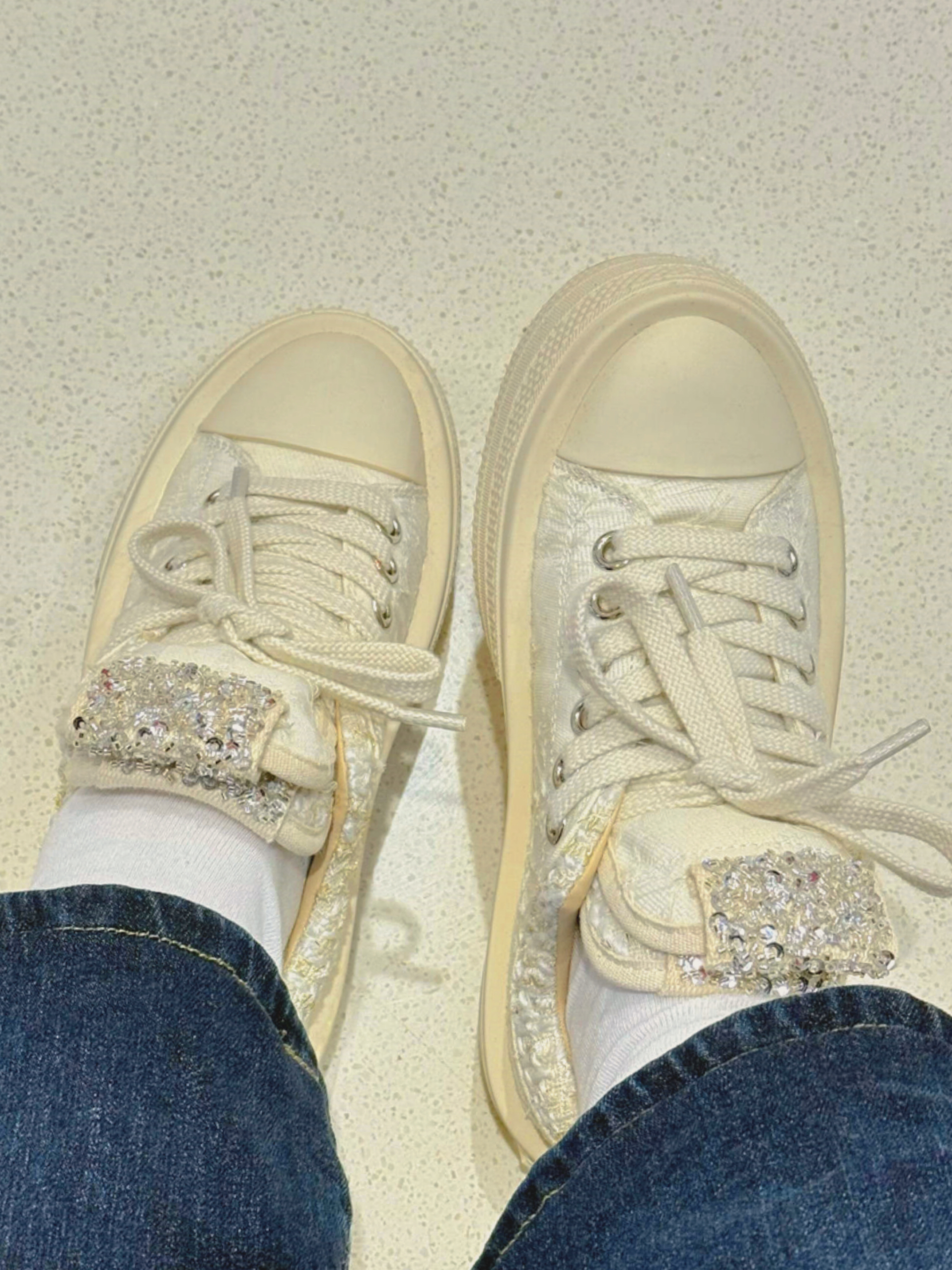 冬天裹厚衣时,这奶白编织+闪钻的鞋太精致! 配深蓝牛仔裤显亮眼,搭米白羽绒服不单调,连驼色大衣都能添氛围感。 不过闪钻部分沾雪水易挂灰,得仔细擦。 你们冬日穿带装饰的鞋会在意清洁问题吗?