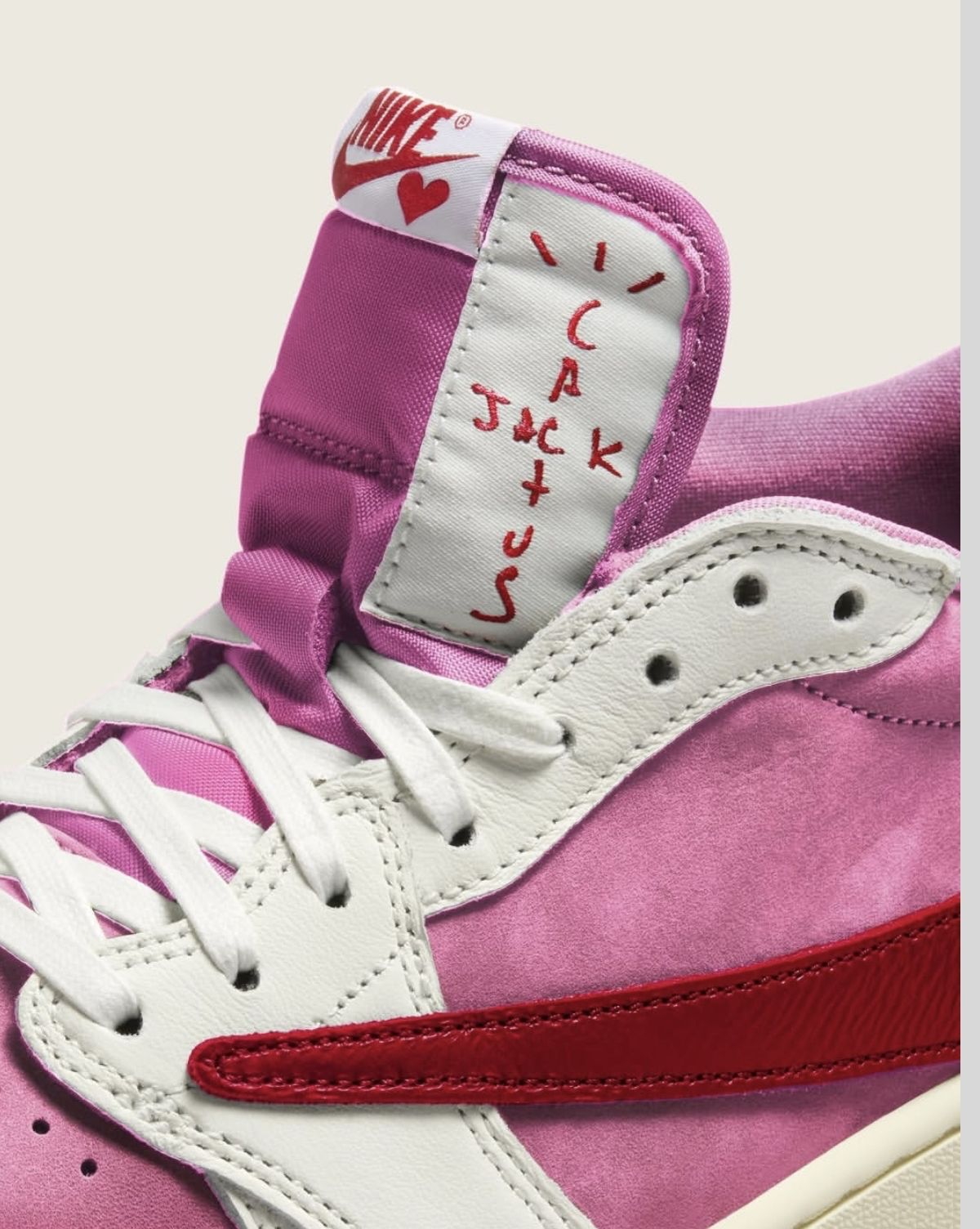 外观设计: 粉白渐变直接戳中少女心!奶白皮质打底,从浅粉到玫粉的渐变麂皮铺满鞋身,加上亮粉色荔枝纹Swoosh,甜酷感直接拉满;鞋舌印满“JACK+JACK”涂鸦+爱心Logo,鞋盒同色系细节,把Travis Scott的随性美学裹进了少女粉里,连中底的“House of Heat”标识都藏着联名质感。 核心卖点: 1. 顶流联名buff:Travis Scott x AJ1的双IP加...